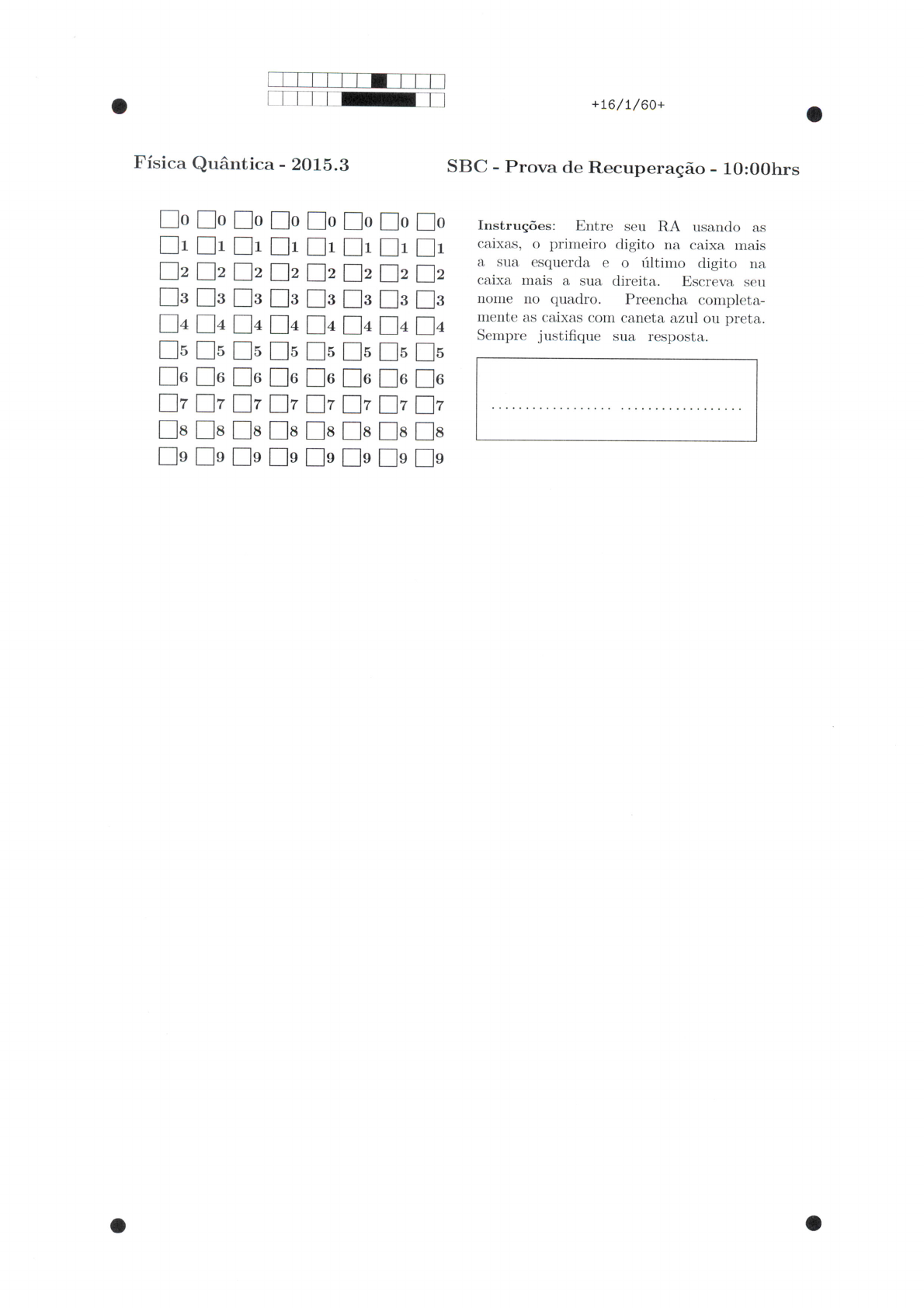 +16/1/60+ Física Quântica - 2015.3 SBC - Prova de Recuperação - 10:00hrs 0 0 0 0 Instruções: Entre seu RA usando as 1 1 1 1 1 1 1 1 caixas, primeiro digito na caixa mais a sua esquerda e o último digito na 2 2 2 2 2 2 2 2 caixa mais a sua direita. Escreva seu 3 3 3 3 3 3 3 3 nome no quadro. Preencha completa- mente as caixas com caneta azul ou preta. 4 4 4 4 4 4 4 4 Sempre justifique sua resposta. 5 5 5 5 5 5 5 5 6 6 6 6 6 6 6 6 7 7 7 7 7 7 7 7 8 8 8 8 8 8 8 8 9 9 9 9 9 9 9 9+16/2/59+ 1. Physical constants 1 1. PHYSICAL CONSTANTS Table 1.1. Reviewed 2013 by P.J. Mohr (NIST). Mainly from the "CODATA Recommended Values of the Fundamental Physical Constants: 2010" by P.J. Mohr, B.N. Taylor, and D.B. Newell in Rev. Mod. Phys. 84. 1527 (2012). The last group of constants (beginning with the Fermi coupling constant) comes from the Particle Data Group. The figures in parentheses after the values give the 1-standard-deviation uncertainties in the last digits; the corresponding fractional uncertainties in parts per 109 (ppb) are given in the last column. This set of constants (aside from the last group) is recommended for international use by CODATA (the Committee on Data for Science and Technology). The full 2010 CODATA set of constants may be found at http://physics.nist.gov/constants See also P.J. Mohr and D.B. Newell, "Resource Letter FC-1: The Physics of Fundamental Constants," Am. J. Phys. 338 (2010). Quantity Symbol, equation Value Uncertainty (ppb) speed of light in vacuum 299 792 458 m exact* Planck constant h 44 Planck reduced h=h/2n 1.054 44 = 6.582 22 electron charge magnitude e esu 22.22 conversion constant he 197.326 9718(44) MeV 22 conversion constant (hc)2 0.389 379 338(17) GeV2 mbarn electron mass kg 22.44 proton mass Mp kg 22.44 deuteron mass md 1875.612 859(41) MeV/c2 22 unified atomic mass unit (u) (mass 931.494 061(21) MeV/c2 kg 22.44 permittivity of free space 8.854 187 817 x10-12 exact permeability of free space 10-7 12.566 370 614 exact fine-structure constant 0.32. 0.32 classical electron radius 2.817 940 3267(27)x10-15 m 0.97 (e- Compton wavelength)/2m 0.65 Bohr radius 0.32 wavelength of 1 eV/c particle 22 Rydberg energy 13.605 692 53(30) eV 22 Thomson cross section barn 1.9 Bohr magneton 5.788 381 MeV T-1 0.65 nuclear magneton 0.71 electron cyclotron freq./field rad 22 proton cyclotron freq./field 22 gravitational constant GN 6.673 105 = 6.708 he 105 standard gravitational accel. exact Avogadro constant NA 6.022 141 44 Boltzmann constant k 1.380 910 = 8.617 eV 910 molar volume, ideal gas at STP 910 Wien displacement law constant b 2.897 910 Stefan-Boltzmann constant 5.670 W K-4 3600 Fermi coupling constant** 1.166 GeV-2 500 weak-mixing angle 0.231 105 boson mass 80.385(15) 105 boson mass mz 91.1876(21) GeV/c2 strongcouplingconstant as(mz) 0.1185(6) 1.602 565(35) 300 K = [38.681 eV 1 esu 1 atmosphere 760 Torr 101 Pa * The meter is the length of the path traveled by light in vacuum during a time interval of 458 of a second. t At Q2 = 0. At Q2 the value is ~ 1/128. Absolute lab measurements of GN have been made only on scales of about 1 cm to 1 m. See the discussion in Sec. 10, "Electroweak model and constraints on new physics." tt The corresponding 0 for the effective angle is 0.23155(5).+16/3/58+ Question 1 (2 pontos) O espectro de Corpo Negro pode ser explicado utilizando-se uma série de osciladores harmônicos quânticos com diferentes frequências de oscilação. O espectro de frequências resultante (espectro de Planck) é aproximadamente dado por: (16) a) Calcule a frequência (Vmax) para a qual O espectro é máximo. b) Considere um oscilador quântico com frequência angular = Qual a energia mínima deste oscilador? Escreva sua resposta em função de T e h. c) Se O oscilador do item b) (com frequência = possui energia E = qual seu número quântico n? Calcule sua função de onda. Escreva sua resposta em função de T, h e a massa m do oscilador. Dados: = at = mw 2h 2h 2 3 4 6 7 8 9 10 Não marque estas caixas a) Ymax e dado dp =0 =0 KBT => Vmax = = Vmax = 3KBT 2 c) = = Se Em : 2 9 3m = 3 = 2 2 A de onda 41 e dada+16/4/57+ Continuação do espaço para a questão 1. : = = mw 2th (x d mw dn = 2mw 114 x2+16/5/56+ Question 2 (3 pontos) Considere um elétron no estado 4s (n = 4,1 = 0) do átomo de Hidrogênio. Determine: a) A energia necessária para arrancar este elétron do átomo. Esta energia nada mais é do que a função trabalho. b) Considere efeito fotolétrico. Qual a frequência mínima (Vmin) necessária da radiação incidente para que O elétron no estado 4s seja arrancado do átomo? c) Assuma agora que não sabemos qual valor do número quântico orbital n. Dado átomo de Hidrogênio, medimos O potencial de corte (Vmin) para uma frequência de radiação incidente v. Mostre que é possível obter O valor de n como uma função de Vmin ev. d) Dado = 2 = hw = 5,4 eV, determine nível de energia n no qual se encontra elétron. 1 2 4 6 7 8 9 10 Não marque estas caixas a) r - que eletron escape do devemos ter: O eletron deve ganhav : = = Eo = Eo 42 16 = 13,6 eV eV u) Energia do Ex min = Vmin = Vmin 2x1014 h+16/6/55+ Continuação do espaço para a questão 2. potencial de corte e tal que: eVmin = Er - 4 = Eo Eo = liv- eVmin = E. hr eVmin => eVmin a) Eo = 13,6 eV = 5,4 eV eVmin = zeV 1 M = V4 = 2+16/7/54+ Question 3 (2,5 pontos) Uma partícula de massa m com energia total E = 2V incide pela esquerda (a partir de X a). b) Escreva as soluções gerais para a Eq. de Schroedinger independente do tempo para as regiões I, II e III. c) Escreva as equações para as condições de contorno para a função de onda. Não é necessário resolvê-las. d) Escreva os coeficientes de transmissão e reflexão (não é necessário calculá-los explicitamente). 0 9 10 Não marque estas caixas a) Eq. de Schroedinger independente do = 2m I e III = = II : = 4" = - 4/ = 2mV. 4+16/8/53+ Continuação do espaço para a questão 3. b) -ikx onde to to c) Como a particula in