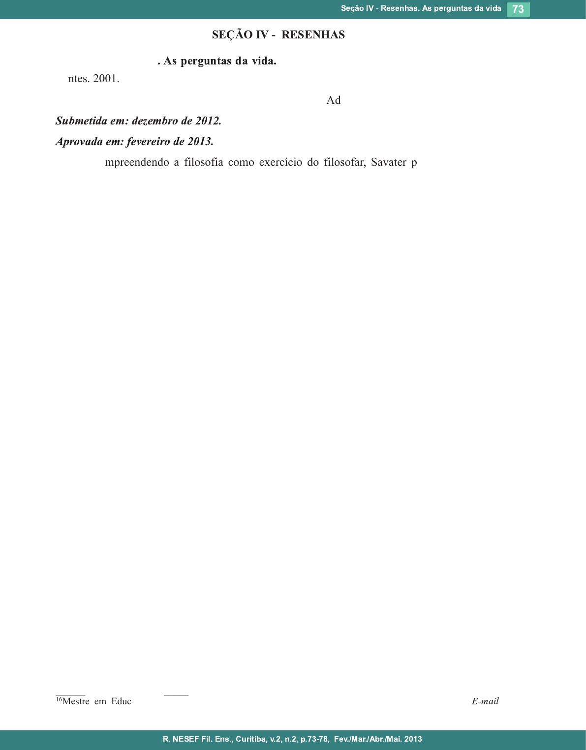 73 Ademir Aparecido Pinhelli Mendes16 Submetida em: dezembro de 2012. Aprovada em: fevereiro de 2013. Compreendendo a filosofia como exercício do filosofar, Savater propõe nesta obra, levar o leitor a realizálo com ousadia, o que talvez o leve a conclusões opostas. Para isso expõe o que compreende ser a diferença entre Ciência e Filosofia. Com o subtítulo “O porquê da filosofia”, pergunta sobre o sentido da filosofia como disciplina escolar na formação de crianças e jovens. Não seria uma perda de tempo, já que os programas educacionais de ensino médio estão sobrecarregados de conteúdos? Para explicitar esta questão – a filosofia não serve para nada já debatida por Sócrates e seus opositores, cinco séculos a.C., e citando Ortega y Gasset (p. 5), apresenta três níveis diferentes de compreensão para distinguir ciência e filosofia: informação, conhecimento e sabedoria. Conclui que o conhecimento científico opera entre o nível (a) e o (b), enquanto que o conhecimento filosófico opera entre o nível (b) e o (c). O desejável do ponto de vista do ensino seria chegar à sabedoria filosófica. Mas como ensinar tal coisa? Seria possível ensinala? Embora ciência e filosofia em algum momento estivessem unidas pela busca de responder às perguntas suscitadas pela realidade, ao longo do tempo, elas foram sendo separadas. Hoje a ciência preocupase em explicar “como as coisas são constituídas e como elas funcionam”, enquanto a filosofia se preocupa com o que elas significam para o homem. A ciência trata de “todos os temas de modo impessoal”; “aspira conhecer o que existe e o que acontece”; “multiplica as áreas de conhecimento, fragmentando especializando o saber”; “desmonta as aparências do real em elementos teóricos invisíveis, ondulatórios e corpusculares, matematizáveis, em elementos abstratos não percebidos”; “busca saberes e não meras suposições”. A filosofia tem a “consciência de que todo conhecimento tem necessariamente um sujeito, um protagonista humano”; “põese a refletir sobre a importância que tem para o ser humano saber o que acontece e o que existe”; “se preocupa em relacionar o conhecimento com tudo o mais numa busca de unidade que possa explicar o ser humano”; “resgata a realidade humanamente vital do aparente, na qual transcorre a nossa existência SEÇÃO IV - RESENHAS SAVATER, Fernando. As perguntas da vida. Tradução: Mônica Stahel. São Paulo: Martins Fontes. 2001. ___________________________ 16Mestre em Educação (UFPR). Professor de Filosofia da Rede Estadual de Educação do Paraná. E-mail: pinhellimendes@hotmail.com. R. NESEF Fil. Ens., Curitiba, v.2, n.2, p.73-78, Fev./Mar./Abr./Mai. 201 3 Seção IV - Resenhas. As perguntas da vida 74 concreta”; perguntase sobre questões que os cientistas já dão como resolvidas, pois suas soluções anulam e dissolvem as perguntas. A filosofia não dá soluções, mas respostas que, que nos permitem conviver racionalmente com as perguntas, embora as formulando sempre de um novo modo. A resposta filosófica não mata a pergunta, mas é uma forma de cultivála de modo a nos fazer conviver cotidianamente com aquela interrogação. É isso o que nos humaniza. Um cientista pode utilizar a soluções encontradas por outro cientista sem a necessidade de percorrer o mesmo caminho de investigação. Mas o filósofo não pode satisfazerse com as respostas de outros filósofos. A resposta filosófica traz a exigência de realizar por si mesmo o percurso de seus antecessores. Mesmo partindo de uma tradição intelectual, para filosofar é necessário que cada um realize seu próprio percurso de pensamento, de ver e argumentar. Daí a observação de Kant (p.11) ao afirmar não ser possível ensinar filosofia, mas apenas filosofar. E esta pode ser uma das grandes contribuições da filosofia no processo educacional. Cabe ainda uma última pergunta: por onde começar? Para responder a esta questão Savater propõe a discussão de dez temas/problemas filosóficos: Morte; Razão; Conhecimento; Linguagem; Cosmologia; Liberdade; Natureza; Política; Beleza; Tempo. Para desenvolver o conteúdo de cada capítulo Savater fará referência às suas experiências cotidianas, expondo problemas, teses e pensamento apresentando conceitos de filósofos que melhor ajudam a desenvolver sua explicação. Morte: a constatação de que um dia vamos morrer é a evidência de que já podemos pensar por nossos próprios pensamentos, pois a experiência da morte não só nos torna pensativos, mas nos faz pensadores e por isso nos humaniza. Platão no Fédon “diz que filosofar é prepararse para morrer” (p. 16). Embora a filosofia trate da vida e seu significado, a consciência da morte nos torna viventes. Filosofar sobre a morte é melhor maneira de compreendermos o sentido da vida. Razão: pensar na morte me leva a fazer perguntas sobre a vida. Mas como responderei convincentemente as perguntas que a vida me sugere? Como poderei saber se minhas respostas serão mais ou menos válidas? Minhas perguntas são feitas a partir de um conjunto de informações que já disponho. Coisas que sei por que os outros me disseram e outras porque estudei. Há coisas que sei por experiência própria. Mas como saber se são verdadeiras? Como saber se sei o que creio saber? Como posso ter certeza sobre elas? Como posso ampliar e melhorar ou até substituir de modo confiável o que acredito saber? Parece imprescindível revisar o que acredito saber, comparar com outros conhecimentos meus, R. NESEF Fil. Ens., Curitiba, v.2, n.2, p.73-78, Fev./Mar./Abr./Mai. 201 3 As perguntas da vida 75 submetêlos ao exame crítico, debatêlos com outras pessoas que possam me ajudar a entender melhor o que acredito saber. Preciso buscar argumentos que possam me ajudar refutar ou confirmar meus conhecimentos. Esse exercício chamase o uso da razão, que é um procedimento intelectual que utilizo para organizar