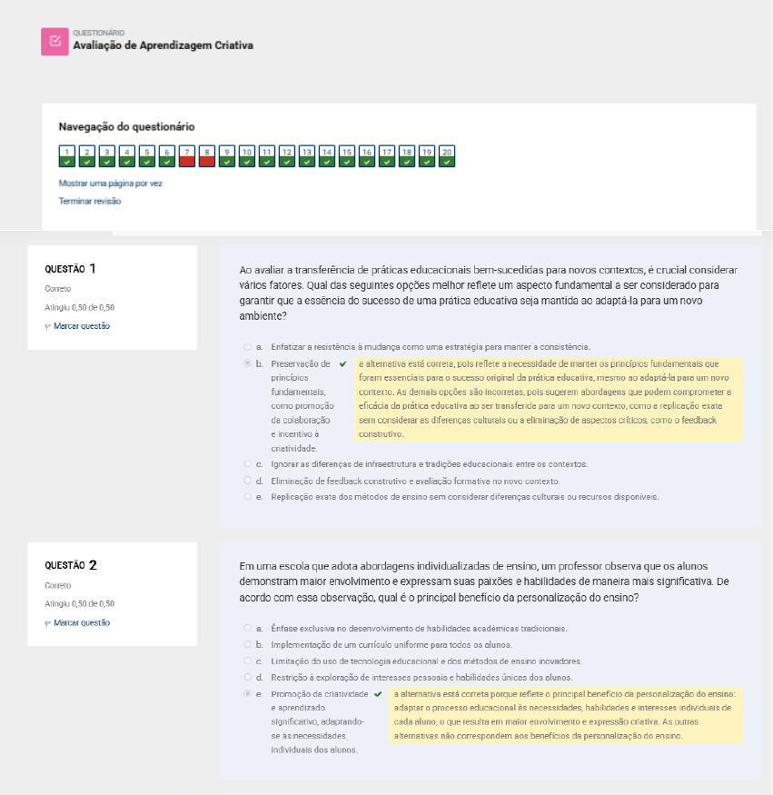 QUESTIONÁRIO Avaliação de Aprendizagem Criativa Navegação do questionário 1 2 3 4 5 6 7 8 9 10 11 12 13 14 15 16 17 18 19 20 Mostrar uma página por vez Terminar revisão QUESTÃO 1 Ao a transferência de práticas educacionais bem-sucedidas para novos contextos, é crucial considerar Correto vários fatores. Qual das seguintes opções melhor reflete um aspecto fundamental a ser considerado para garantir que a essência do sucesso de uma prática educativa seja mantida ao adaptá-la para um novo Atingiu 0,50 de ambiente? Marcar questão a. Enfatizar a resistência à mudança como uma estratégia para manter a consistência. b. Preservação de a alternativa está correta, pois reflete necessidade de manter os princípios fundamentais que princípios foram essenciais para sucesso original da prática educativa, mesmo ao adaptá-la para um novo fundamentais, As demais opções são incorretas, pois sugerem abordagens que podem comprometer como promoção eficácia da prática educativa ao ser transferida para um novo contexto, como a replicação exata da colaboração sem considerar as diferenças culturais ou a eliminação de aspectos críticos, como o feedback e incentivo à C. Ignorar as diferenças de infraestrutura e tradições educacionais entre os contextos. d. Eliminação de feedback construtivo e avaliação formativa no novo contexto. e. Replicação exata dos métodos de ensino sem considerar diferenças culturais ou recursos QUESTÃO 2 Em uma escola que adota abordagens individualizadas de ensino, um professor observa que os alunos Correto demonstram maior envolvimento e expressam suas e habilidades de maneira mais significativa. De acordo com essa observação, qual é o principal benefício da personalização do ensino? Atingiu 0,50 de 0,50 Marcar questão exclusiva no desenvolvimento de habilidades acadêmicas b. Implementação de um currículo uniforme para todos os alunos. Limitação do uso de tecnologia educacional e dos métodos de ensino inovadores. d. à exploração de interesses pessoais e habilidades únicas dos alunos. e. Promoção da criatividade a alternativa está correta porque reflete principal benefício da personalização do ensino: e aprendizado adaptar processo educacional às necessidades, habilidades e interesses individuais de significativo, adaptando- cada aluno, o que resulta em maior envolvimento e expressão criativa. As outras se às necessidades alternativas não correspondem aos benefícios da personalização do ensino. individuais dosQUESTÃO 3 Um professor de arte de uma escola secundária implementou dois projetos para estimular a criatividade dos Correto alunos: a criação de um mural coletivo e design de produtos reciclados. mural visava promover a expressão artística e a colaboração, enquanto design de produtos reciclados focava a criatividade e a Atinglu de 0,50 consciência ambiental. Qual dos seguintes aspectos são benefícios diretos desses projetos de arte e design? Marcar questão Desenvolvimento da consciência ambiental por meio do design de produtos reciclados. II. Promoção da criatividade individual na criação do mural coletivo. III. Estímulo ao pensamento e às habilidades analíticas em ciências IV. Fomento da colaboração e expressão artística no mural coletivo. V. Incentivo à sustentabilidade e inovação no design de produtos reciclados. a Apenas III são diretos desses projetos de arte e design. b. Apenas III e V são beneficios diretos desses projetos de arte e design. c. Apenas III, IV V são diretos desses projetos de arte e design. d. Apenas IV e a resposta está correta, pois apenas o estimulo ao pensamento critico e às habilidades analiticas são beneficios em ciências exatas não é um beneficio direto dos projetos de arte e design implementados, que diretos desses estão mais focados na expressão colaboração e consciência As demais projetos de arte alternativas refletem beneficios diretos desses projetos artisticos e de design. e Apenas le são beneficios diretos desses projetos de arte e design. QUESTÃO 4 Um grupo de alunos do ensino médio foi desafiado a criar um curta-metragem como parte de um projeto de Correto artes visuais. Eles utilizaram programas de edição de imagem e como Photoshop e para editar e aprimorar suas filmagens. Qual das seguintes opções melhor descreve o benefício educacional proporcionado pela aplicação desse projeto de artes visuais? F Marcar questão Aumento da pontuação média da escola em testes padronizados. b. Capacitação dos a resposta está correta, pois de programas de edição de imageme como alunos para contar Photoshop e Premiere, capacita os alunos a contarem visualmente e a explorar histórias visualmente técnicas de As demais respostas estão incorretas, não os beneficios e explorar técnicas educacionais diretos do uso desses softwares em um projeto de artes de c. Simplificação do processo de avaliação dos d. Redução do tempo necessário para o planejamento de Melhoria na eficiência da gestão escolar.QUESTÃO 5 Considerando a importância de estimular a motivação dos alunos na aprendizagem quais das Correto seguintes afirmações são corretas sobre o uso de jogos e estratégias lúdicas no contexto educacional? Afirmativas: Atinglu 0,50 de Jogos educacionais criam um ambiente mais dinâmico e atrativo, estimulando a motivação dos Marcar questão alunos por meio de desafios e recompensas. II. A integração de jogos no processo educativo deve ser limitada a atividades extracurriculares, sem qualquer conexão com currículo escolar. III. Jogos de tabuleiro e jogos digitais não contribuem para a colaboração e interação social entre os alunos. IV. A que utiliza elementos de jogos, como pontuação e prêmios, torna o aprendizado mais lúdico e atrativo, motivando os alunos a alcançarem objetivos de aprendizagem. a. b. le as respostas estão corretas, pois jogos educacionais, criar um ambiente mais e atrativo c