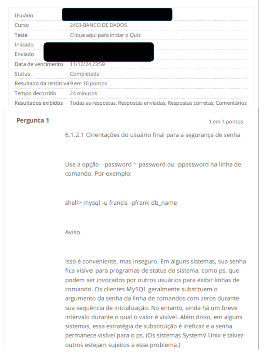 Se o seu ambiente operacional estiver con�gurado para exibir seu comando atual na barra de título da janela do terminal, a senha permanecerá visível enquanto o comando estiver em execução, mesmo se o comando já estiver fora de vista. MYSQL. MySQL 8.0 Reference Manual. 2020. O trecho acima do manual do MySQL explica que um determinado método de login possui um certo risco de segurança. Indique qual seria uma alternativa segura ao método discutido. Resposta Selecionada: a. Logar com a opção -p sem passar o parâmetro (senha) no comando, o que fará com que a senha seja lida a par�r de um prompt seguro do terminal. Respostas: a. Logar com a opção -p sem passar o parâmetro (senha) no comando, o que fará com que a senha seja lida a par�r de um prompt seguro do terminal. b. Logar com a opção -p sem passar o parâmetro (senha) no comando, o que fará com que o usuário anônimo seja u�lizado. c. Logar como o discu�do, passando a senha na linha de comando, mas especificando o uso de uma conexão SSL segura entre cliente e banco de dados. d. Logar como o discu�do, passando a senha na linha de comando, mas usando um contêiner Docker. e. O manual do MySQL está defasado. Na úl�ma versão disponível do MySQL, o método discu�do é inteiramente seguro. Comentário da resposta: a. Com a senha sendo digitada em modo interativo (com a opção -p), não há como outro programa capturar a senha digitada, a menos que haja algum programa espião que capture as teclas sendo digitadas. Pergunta 2 Considere os seguintes tipos de bancos de dados: 1 em 1 pontos (I) Relacionais com propriedades ACID (II) Em memória (III) Orientados a documentos (IV) Orientados a grafos Considere agora os seguintes domínios a serem modelados em bancos de dados: ( ) Soluções de cache. ( ) Entidades com alta variabilidade de atributos entre suas instâncias. ( ) Dados �nanceiros que exigem alta consistência. ( ) Análise logística de rotas de caminhões. Assinale a alterna�va que traça a correspondência mais adequada entre os �pos de bancos de dados e os domínios aos quais eles se aplicam melhor. Resposta Selecionada: d. (II) (III) (I) (IV) Respostas: a. (IV) (III) (I) (II) b. (II) (I) (III) (IV) c. (III) (II) (I) (IV) d. (II) (III) (I) (IV) e. (I) (III) (II) (IV) Comentário da resposta: d. Soluções de cache exigem pouco espaço e devem ser rápidas, por isso bancos em memória são adequados para elas. Instâncias diferentes com atributos diferentes para uma mesma entidade geram tabelas esparsas em bancos relacionais; utilizar um banco com esquema �exível, como os orientados a documentos, é interessante. A transferência entre contas correntes é um caso que exige alta consistência e todas as garantias do ACID: melhor �car com um SGBD relacional. Por �m, a análise logística pode utilizar a aplicação de algoritmos em grafos, por isso pode se valer de um SGBD orientado a grafos. Pergunta 3 Considere o seguinte texto, que faz parte de uma descrição comercial na home page de uma suíte de produtos, servindo de link para mais detalhes sobre um produto especí�co. Pentaho Business Analytics 1 em 1 pontos Empodere consumidores de dados com análises interativas, visualizações em tempo real e modelagens preditivas, com mínimo suporte de TI. Pentaho Platform. [s. d.]. Disponível em: https://www.hitachiva ntara.com/en-us/products/data-management-analytics/pentaho-platfo rm.html. Acesso em: 15 jul. 2020. Assinale a alterna�va que melhor esclarece o texto acima. Resposta Selecionada: c. Os “consumidores de dados” são pessoas (analistas, gerentes, etc.) que querem explorar diretamente os dados sem a necessidade de depender de pessoas especialistas em TI (“com mínimo suporte de TI”). Respostas: a. Os “consumidores de dados” são painéis de monitoração que servem aos especialistas de TI. Assim, o suporte da TI age somente quando necessário. b. Os “consumidores de dados” são aplicações resilientes que possuem indisponibilidade mínima, mesmo sem a intervenção constante de operadores de TI. c. Os “consumidores de dados” são pessoas (analistas, gerentes, etc.) que querem explorar diretamente os dados sem a necessidade de depender de pessoas especialistas em TI (“com mínimo suporte de TI”). d. Os “consumidores de dados” são pessoas (analistas, gerentes, etc.) que querem explorar diretamente os dados, mas desde que minimamente tenham todo o suporte do pessoal de TI ao seu dispor. e. A chamada leva o leitor a acreditar que é possível explorar os dados diretamente. Mas isso é impossível, já que sempre deve exis�r uma aplicação projetada pela TI corpora�va entre o usuário final e os dados. Comentário da resposta: c. O Pentaho é uma ferramenta de análise de dados que dispensa a necessidade de uma aplicação geradora de relatórios e o usuário �nal. Esse estilo arquitetural de análise de dados é o estilo dos data warehouses. Pergunta 4 1 em 1 pontos Considere um banco de dados com uma tabela voos, contendo a coluna companhia, com a sigla da companhia aérea que operou o voo. Considere também que esse banco possui uma tabela companhias, com um cadastro de todas as companhias aéreas existentes. O que representa a seguinte consulta? SELECT (SELECT count(distinct companhia) FROM voos) / (SELECT count(*) FROM companhias); Considere como dica os seguintes comandos e suas respectivas saídas: > SELECT 4; 4 > SELECT 4/2; 2 Resposta Selecionada: b. A proporção de companhias cadastradas que operaram voos registrados na tabela voos. Respostas: a. A quan�dade de companhias que operaram voos registrados na tabela voos. b. A proporção de companhias cadastradas que operaram voos registrados na tabela voos. c. A quan�dade total de companhias cadastradas. d. Não representa nada, pois seja qual for o conteúdo das tabelas esse comando sempre retorna o número zero. e. Não representada nada, pois resultará em um erro devido 