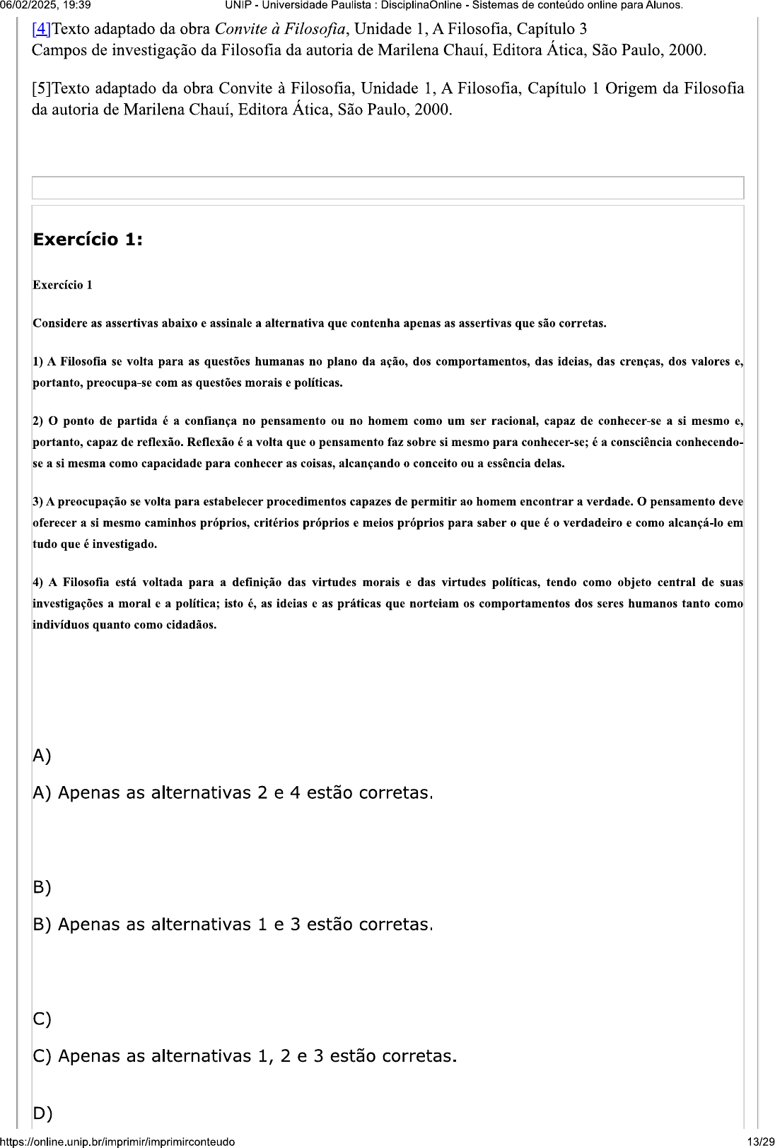 06/02/2025, 19:39 UNIP Universidade Paulista : DisciplinaOnline Sistemas de conteúdo online para Alunos. 4 Texto adaptado da obra Convite à Filosofia, Unidade 1, A Filosofia, Capítulo 3 Campos de investigação da Filosofia da autoria de Marilena Chauí, Editora Ática, São Paulo, [5]Texto adaptado da obra Convite à Filosofia, Unidade 1, A Filosofia, Capítulo 1 Origem da Filosofia da autoria de Marilena Chauí, Editora Ática, São Paulo, 2000. Exercício 1: Exercício 1 Considere as assertivas abaixo e assinale a alternativa que contenha apenas as assertivas que são corretas. 1) A Filosofia se volta para as questões humanas no plano da ação, dos comportamentos, das ideias, das crenças, dos valores e, portanto, preocupa-se com as questões morais e políticas. 2) o ponto de partida é a confiança no pensamento ou no homem como um ser racional, capaz de conhecer-se a si mesmo e, portanto, capaz de reflexão. Reflexão é a volta que o pensamento faz sobre si mesmo para conhecer-se; é a consciência conhecendo- se a si mesma como capacidade para conhecer as coisas, alcançando o conceito ou a essência delas. 3) A preocupação se volta para estabelecer procedimentos capazes de permitir ao homem encontrar a verdade. o pensamento deve oferecer a si mesmo caminhos próprios, critérios próprios e meios próprios para saber o que é o verdadeiro e como alcançá-lo em tudo que é investigado. 4) A Filosofia está voltada para a definição das virtudes morais e das virtudes políticas, tendo como objeto central de suas investigações a moral e a política; isto é, as ideias e as práticas que norteiam os comportamentos dos seres humanos tanto como indivíduos quanto como cidadãos. A) A) Apenas as alternativas 2 e 4 estão corretas. B) B) Apenas as alternativas 1 e 3 estão corretas. C) C) Apenas as alternativas 1, 2 e 3 estão corretas. D) 13/2906/02/2025, 19:39 UNIP - Universidade Paulista : DisciplinaOnline Sistemas de conteúdo online para Alunos. D) Apenas as alternativas 2 e 3 estão corretas. E) E) Todas estão corretas. o aluno respondeu e acertou. Alternativa(E) Exercício 2: Exercício 2 se em vez de afirmar que gosta de alguém porque possui as mesmas ideias, gostos, preferências e valores, preferisse analisar: o que é um valor? o que é um valor moral? o que é um valor artístico? o que é a moral? o que é a vontade? o que é a liberdade? Alguém que tomasse essa decisão, estaria tomando distância da vida cotidiana e de si mesmo [...] Ao tomar essa distância, estaria interrogando a si mesmo, desejando conhecer por que cremos no que cremos, por que sentimos o que sentimos e o que são nossas crenças e nossos sentimentos. Esse alguém estaria começando a adotar o que chamamos de atitude filosófica. Assim, uma primeira resposta à pergunta "O que é Filosofia?" poderia ser: A decisão de não aceitar como óbvias e evidentes as coisas, as ideias, os fatos, as situações, os valores, os comportamentos de nossa existência cotidiana; jamais aceitá-los sem antes havê-los investigado e compreendido" (CHAUÍ, M. Convite è Filosofia. Introdução). De acordo com o texto, qual das seguintes atitudes seria uma atitude filosófica? A) A) Fico sentado diante de uma flor para observar cada detalhe. B) B) Leio um livro para me distrair e não entendo o que o autor quer dizer com a palavra "altruísmo". C) C) Espero o ônibus ouvindo música clássica no meu MP3. https://online.unip.br/imprimir/imprimirconteudo 14/2906/02/2025, 19:39 UNIP Universidade Paulista DisciplinaOnline - Sistemas de conteúdo online para Alunos. D) D) Olho-me no espelho de manhã e me pergunto "o que eu sou". E) E) Saio de casa correndo logo cedo de manhã, para não me atrasar. aluno respondeu e acertou. Alternativa(D) Exercício 3: Exercício 3 Quanto a Filosofia como um fato tipicamente grego considere as assertivas abaixo e assinale a alternativa que contenha apenas as assertivas que são incorretas. I - A antiga Grécia deu origem a Filosofia como aspiração ao conhecimento racional, lógico e sistemático da realidade natural e humana, que se ocupa da origem e das causas do mundo, de suas transformações, das ações humanas e do próprio pensamento. II - Foram os gregos que instituíram para o Ocidente europeu as bases e os princípios fundamentais do que chamamos razão, racionalidade, ciência, ética, política, técnica, arte. III - Não podemos dizer que outros povos, tão antigos quanto os gregos, como os chineses, os hindus, os japoneses, os árabes, os persas, os hebreus, os africanos ou os índios da América não possuíam sabedoria, como possuem até os dias de hoje. IV - É sabido que povos antigos como os chineses, os hindus, os japoneses, os árabes, os persas, os hebreus, os africanos ou os índios da América também desenvolveram o pensamento, mas não evoluíram quanto às formas de conhecimento de Natureza e dos seres humanos. A) A) Apenas a I. https://online.unip.br/imprimir/imprimirconteudo 15/2906/02/2025 19:39 UNIP Universidade Paulista : DisciplinaOnline - Sistemas de conteúdo online para Alunos. B) B) Apenas a II. C) C) Apenas a III. D) D) Apenas a IV. E) E) Todas são corretas. o aluno respondeu e acertou. Alternativa(D) Exercício 4: Exercício 4 Considere as assertivas abaixo e assinale a alternativa que que contenha as assertivas que complementem, corretamente, a frase a seguir: "A Filosofia surge quando alguns " I - admirados e espantados com a realidade, insatisfeitos com as explicações que a tradição lhes dera, começaram a fazer perguntas e buscar respostas para elas. II - demonstrando que o mundo e os seres humanos, os acontecimentos e as coisas da natureza e as ações humanas não podem ser conhecidos pela razão humana. III - demonstram que a própria razão é capaz de conhecer-se a si mesma. IV - Romperam com as explicações mitológicas sobre o cosmo. A) 16/2906/02/2025, 19:39 UNIP - Universidade Paulista : DisciplinaOnline - Sistemas de 