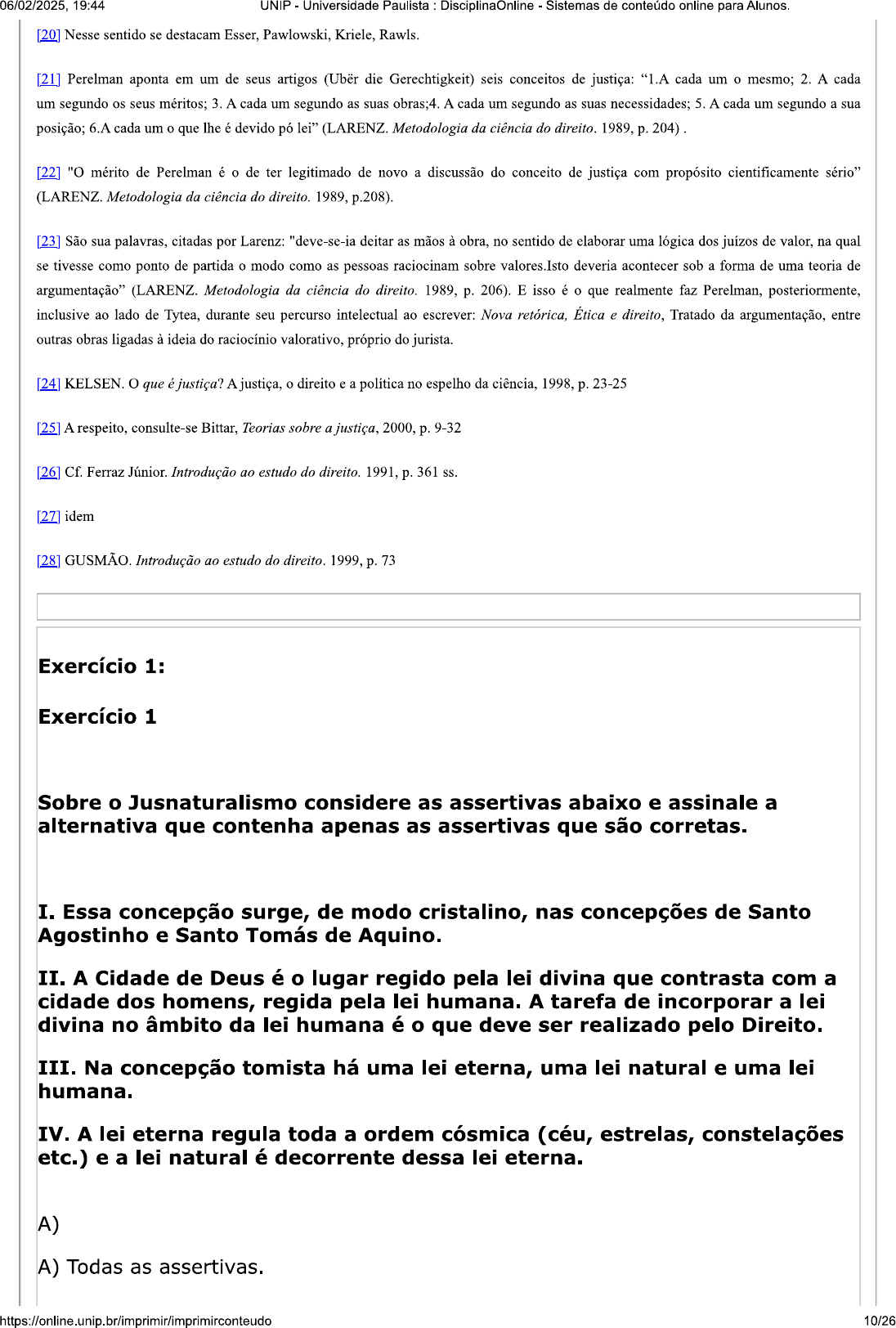 06/02/2025, 19:44 UNIP Universidade Paulista : DisciplinaOnline Sistemas de conteúdo online para Alunos. [20] Nesse sentido se destacam Esser, Pawlowski, Kriele, Rawls. [21] Perelman aponta em um de seus artigos die Gerechtigkeit) seis conceitos de justiça: "1.A cada um o mesmo; 2. A cada um segundo os seus méritos; 3. A cada um segundo as suas obras;4. A cada um segundo as suas necessidades; 5. A cada um segundo a sua posição; 6.A cada um o que lhe é devido pó lei" (LARENZ. Metodologia da ciência do direito. 1989, p. 204) [22] "O mérito de Perelman é o de ter legitimado de novo a discussão do conceito de justiça com propósito cientificamente sério" Metodologia da ciência do 1989, p.208). [23] São sua palavras, citadas por Larenz: "deve-se-ia deitar as mãos à obra, no sentido de elaborar uma lógica dos juízos de valor, na qual se tivesse como ponto de partida o modo como as pessoas raciocinam sobre valores.Isto deveria acontecer sob a forma de uma teoria de argumentação" Metodologia da ciência do direito. 1989, p. 206). E isso é o que realmente faz Perelman, posteriormente, inclusive ao lado de Tytea, durante seu percurso intelectual ao escrever: Nova retórica, Ética e direito, Tratado da argumentação, entre outras obras ligadas à ideia do raciocínio valorativo, próprio do jurista. [24] KELSEN. O que A justiça, o direito e a política no espelho da ciência, 1998, p. 23-25 [25] A respeito, consulte-se Bittar, Teorias sobre a justiça, 2000, p. 9-32 [26] Cf. Ferraz Júnior. Introdução ao estudo do 1991, p. 361 SS. [27] idem [28] GUSMÃO. Introdução ao estudo do 1999, p. 73 Exercício 1: Exercício 1 Sobre o Jusnaturalismo considere as assertivas abaixo e assinale a alternativa que contenha apenas as assertivas que são corretas. I. Essa concepção surge, de modo cristalino, nas concepções de Santo Agostinho e Santo Tomás de Aquino. II. A Cidade de Deus é o lugar regido pela lei divina que contrasta com a cidade dos homens, regida pela lei humana. A tarefa de incorporar a lei divina no âmbito da lei humana é o que deve ser realizado pelo Direito. III. Na concepção tomista há uma lei eterna, uma lei natural e uma lei humana. IV. A lei eterna regula toda a ordem cósmica (céu, estrelas, constelações etc.) e a lei natural é decorrente dessa lei eterna. A) A) Todas as assertivas. https://online.unip.br/imprimir/imprimirconteud 10/2606/02/2025. 19:44 UNIP - Universidade Paulista : DisciplinaOnline - Sistemas de conteúdo online para Alunos. B) B) Apenas as assertivas I, II e III. C) C) Apenas as assertivas II e IV. D) D) Apenas as assertivas I e IV. E) E) Apenas as assertivas I e III. o aluno respondeu e acertou. Alternativa(A) Exercício 2: Exercício 3 Sobre as concepções de Kant considere as assertivas abaixo e assinale a alternativa que contenha apenas as assertivas que são corretas. I. As virtudes tradicionais não são incondicionalmente boas, pois elas tanto podem servir para fazer o bem, como para fazer o mal. A inteligência, a coragem, a temperança e a prudência podem ser exercidas e encontradas num ser imoral. II. o mau provido de inteligência, coragem, temperança e prudência representa um perigo muito maior. Ele poderá potencializar o mau uso dessas virtudes com vistas a maximizar a sua capacidade de causar o mal III. A ideia de moralidade tem de ser vinculada à vontade de usar moralmente as virtudes. É o conceito de boa vontade. Esse é o elemento https://online.unip.br/imprimir/imprimirconteudo 11/2619:44 UNIP - Universidade Paulista : DisciplinaOnline - Sistemas de conteúdo online para Alunos. necessário e também suficiente a que alguém seja um ser moral. IV. Concebe a moralidade do sujeito, desvinculada das consequências e da utilidade de seus atos. A utilidade não pode ser o critério da moralidade, porque o egoísta é imoral, embora sua conduta possa vir a ser concretamente útil. o critério distintivo da moralidade é a intenção moral. A) A) Apenas I é correta. B) B) Apenas II é correta. C) C) Apenas I e III são corretas. D) D) Apenas II e IV são corretas. E) E) Todas são corretas. o aluno respondeu e acertou. Alternativa(E) Exercício 3: Exercício 4 Segundo Emmanuel Kant, no que se refere à moral considere as assertivas abaixo e assinale a alternativa que contenha apenas as assertivas que são corretas. https://online.unip.br/imprimir/imprimirconteudo 12/2606/02/2025, 19:44 UNIP Universidade Paulista : DisciplinaOnline - Sistemas de conteúdo online para Alunos. I. A moralidade só pode ser privilégio dos sábios, pois é preciso conhecer as leis da natureza para que alguém se disponha a atuar como um ser moral. II. Não há ser humano provido de discernimento capaz de desconhecer o seu dever. III. Todos os homens, independentemente de sua escolaridade ou erudição, foram chamados a uma vida impregnada de moralidade. IV. Desenvolveu a ideia rousseauniana de que a moral é assunto do coração e não da inteligência. A) A) Apenas I e II são corretas. B) B) Apenas III e IV são corretas. C) C) Apenas II e III são corretas. D) D) Apenas I, II e IV são corretas. E) E) Apenas II, III e IV são corretas. o aluno respondeu e acertou. Alternativa(B) Exercício 4: Exercício 5 https://online.unip.br/imprimir/imprimirconteudo 13/2619:44 UNIP - Universidade Paulista : DisciplinaOnline - Sistemas de conteúdo online para Alunos. Considere as assertivas abaixo e assinale a alternativa incorreta. I. Kant afirma que se a ciência existe e não pode se fundar inteiramente sobre a experiência, é necessário que existam elementos a priori no conhecimento. II. A condição do conhecimento e da obrigação moral não é o sujeito transcendental. É o ser humano em sua concepção ideal, não aquele sujeito com a sua contingência. Não é o homem constatado pelo empirismo, pela história e pela sua caracterização meramente conjuntural. III. Essa base adquire relevo também para a moral. A concepção humana