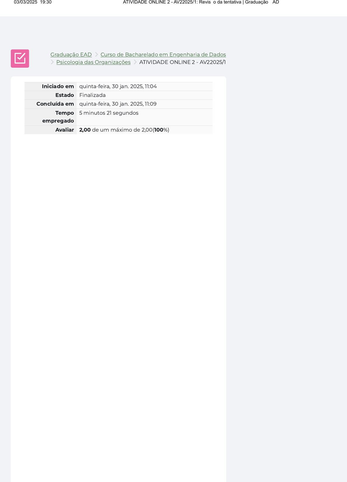 Graduação EAD 〉 Curso de Bacharelado em Engenharia de Dados 〉 Psicologia das Organizações 〉 ATIVIDADE ONLINE 2 - AV22025/1 Iniciado em quinta-feira, 30 jan. 2025, 11:04 Estado Finalizada Concluída em quinta-feira, 30 jan. 2025, 11:09 Tempo empregado 5 minutos 21 segundos Avaliar 2,00 de um máximo de 2,00(100%) 03/03/2025, 19:30 ATIVIDADE ONLINE 2 - AV22025/1: Revisão da tentativa | Graduação EAD https://ava.graduacaoead.unicv.edu.br/course/index.php?categoryid=34 https://ava.graduacaoead.unicv.edu.br/course/index.php?categoryid=104 https://ava.graduacaoead.unicv.edu.br/course/view.php?id=2808#section-4 Questão 1 Correto Atingiu 0,20 de 0,20 O grupo de trabalho pode ser originado de duas formas: formal e informal. Ressalta-se que cada forma de atuação do grupo de trabalho possui suas especificidades. A organização Colorida Ltda possui 3 grupos de trabalho (Amarelo, Azul e Verde), formais e informais. No Quadro 1, constam características de cada um dos Grupos: Quadro 1: Características dos grupos de trabalho da Colorida Ltda. Grupo Características Amarelo Os membros participam voluntariamente deste grupo. Azul Os membros participam do grupo devido funções e setores estabelecidos no organograma da Colorida Ltda. Verde Os membros optaram por participar pois, não está definido no organograma da Colorida Ltda. Fonte: Elaborado pelo Professor, 2021. Ressalta-se que cada grupo recebe apenas 1 classificação: formal ou informal (categorias excludentes). ROBBINS, S. P.; JUDGE, T. Fundamentos do comportamento organizacional. 12. ed. São Paulo: Pearson Education do Brasil, 2014. Com base no enunciado, assinale a alternativa correta: Escolha uma opção: a. Os três grupos de trabalho (Azul, Amarelo e Verde) são formais. b. O grupo de trabalho Verde é formal, enquanto, os grupos de trabalho Azul e Amarelo são informais. c. O grupo de trabalho Amarelo é formal, enquanto, os grupos de trabalho Azul e Verde são informais. d. O grupo de trabalho Azul é formal, enquanto, os grupos de trabalho Amarelo e Verde são informais. ✓ 03/03/2025, 19:30 ATIVIDADE ONLINE 2 - AV22025/1: Revisão da tentativa | Graduação EAD Questão 2 Correto Atingiu 0,20 de 0,20 e. Os três grupos de trabalho (Azul, Amarelo e Verde) são informais. O estudo da motivação humana não é algo novo, é um assunto que já existe desde os primórdios do estudo da gestão de pessoas. Dessa maneira, pesquisar sobre as teorias motivacionais do comportamento humano se torna de grande relevância, pois é através destas que é possível compreender um pouco melhor como ocorre o estímulo que proporciona as ações do indivíduo. Maslow trouxe a Teoria das necessidades, a fim de permitir compreender o que motiva e interessa a cada sujeito, com base nas suas demandas e o que lhes move. Considere a pirâmide de Maslow e indique F para falso e V para verdadeiro. ( ) necessidades básicas está ligada a comida, sede e sono. ( ) segurança está ligado a ter seguro de saúde. ( ) no nível social está conectado com as relações e participar de grupos. ( ) na auto-estima encontra-se sentir-se bem e ter qualidade de vida. ( ) e na realização conseguir ter mais do que os outros. Assinale a alternativa correta. Escolha uma opção: a. V, V, V, F, F. b. V, V, V, V, F. c. V, F, F, V, F. d. V, F, V, V, F. ✓ e. V, V, V, V, V. 03/03/2025, 19:30 ATIVIDADE ONLINE 2 - AV22025/1: Revisão da tentativa | Graduação EAD Questão 3 Correto Atingiu 0,20 de 0,20 Oliveira (1995) refere-se ao clima organizacional como “clima interno”, e afirma que esta ideia já estava embutida num dos estudos realizados na década de 1930, na qual seu autor Hawthorne foi a primeira ocasião em que o clima interno foi estudado no campo das organizações. Assinale a alternativa que apresenta a proposta de Hawthorne. Escolha uma opção: a. Teoria do movimento e da ciência. b. Teoria das motivações. c. Estilos de liderança organizacional. d. Escola das Relações Humanas. ✓ e. Escola do desenvolvimento organizacional. 03/03/2025, 19:30 ATIVIDADE ONLINE 2 - AV22025/1: Revisão da tentativa | Graduação EAD Questão 4 Correto Atingiu 0,20 de 0,20 O estudo do Comportamento Organizacional abrange o conceito de grupo de trabalho, que pode ser originado de duas formas tidas como formal e informal, e de onde se entende que grupo é composto por duas ou mais pessoas que se interagem para alcançarem um objetivo. Com relação ao grupo de trabalho, aponte a alternativa correta. Escolha uma opção: a. Os grupos de trabalho só podem contribuir para o alcance de objetivos se houver uma interação muito forte entre os membros, caso contrário o grupo se torna informal. b. O grupo formal é o único tipo que se refere ao grupo de trabalho, pois é quando todos os integrantes de uma organização sabem que pertencem a um grupo e, com isso, todos buscam alcançar objetivos em comum. c. Tanto o grupo formal quanto o informal, ao influenciarem o comportamento das pessoas, também acabam influenciando o desempenho organizacional e quanto mais tempo os empregados mantêm interação no grupo, mais forte será o senso de propósito e de estratégia para se obter o objetivo desejado. ✓ d. Um grupo pode ser originado de maneira formal ou informal, no entanto, no campo de trabalho, somente o grupo formal pode alcançar os objetivos devidamente apontados, pois é aquele onde os empregados mantêm interação no grupo. e. Os grupos de trabalho nem sempre podem contribuir para objetivos organizacionais, pois é comum que os empregados prefiram trabalhar de maneira individual. 03/03/2025, 19:30 ATIVIDADE ONLINE 2 - AV22025/1: Revisão da tentativa | Graduação EAD Questão 5 Correto Atingiu 0,20 de 0,20 Os fatores motivacionais estão imbricados em questões tanto interna como externas, sendo que ela necessita que o sujeito impulsione para que o sujeito aja, fazendo uma ação em virtude de alcançar algum objetivo. As condições estão relacionada