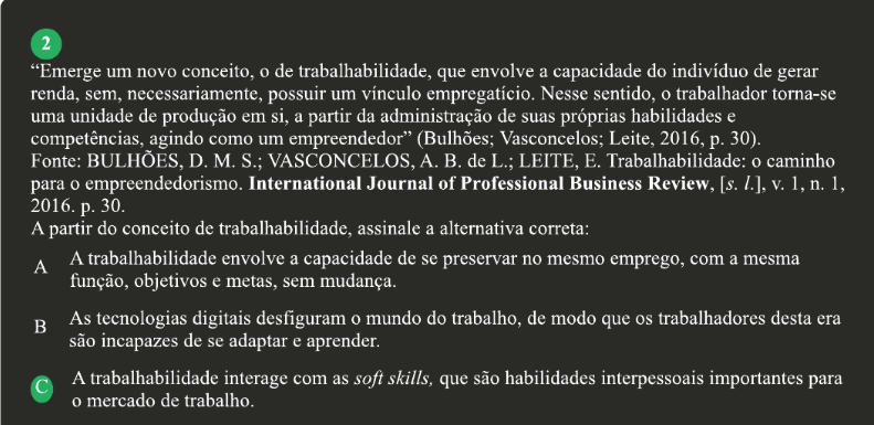 2 "Emerge um novo conceito, de trabalhabilidade, que envolve a capacidade do indivíduo de gerar renda, sem, necessariamente, possuir um vínculo empregatício. Nesse sentido, trabalhador torna-se uma unidade de produção em si, a partir da administração de suas próprias habilidades e competências, agindo como um empreendedor" Leite, 2016, p. 30). Fonte: D. M. VASCONCELOS, A. B. de L.; LEITE, E. Trabalhabilidade: caminho para empreendedorismo. International Journal of Professional Business Review, [s. V. 1, n. 1, 2016. p. 30. A partir do conceito de trabalhabilidade, assinale a alternativa correta: A A trabalhabilidade envolve a capacidade de se preservar no mesmo emprego, com a mesma função, objetivos e metas, sem mudança. B As tecnologias digitais desfiguram mundo do trabalho, de modo que os trabalhadores desta era são incapazes de se adaptar e aprender. A trabalhabilidade interage com as soft skills, que são habilidades interpessoais importantes para mercado de trabalho.