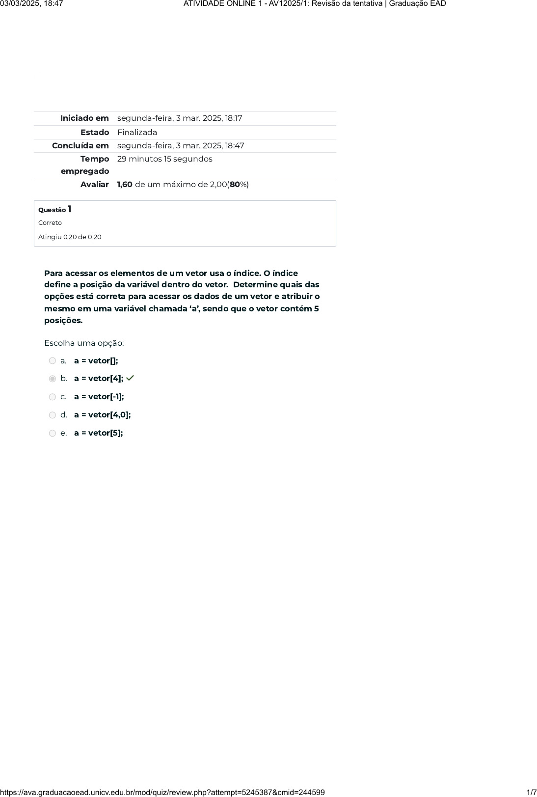 Iniciado em segunda-feira, 3 mar. 2025, 18:17 Estado Finalizada Concluída em segunda-feira, 3 mar. 2025, 18:47 Tempo empregado 29 minutos 15 segundos Avaliar 1,60 de um máximo de 2,00(80%) Questão 1 Correto Atingiu 0,20 de 0,20 Para acessar os elementos de um vetor usa o índice. O índice define a posição da variável dentro do vetor. Determine quais das opções está correta para acessar os dados de um vetor e atribuir o mesmo em uma variável chamada ‘a’, sendo que o vetor contém 5 posições. Escolha uma opção: a. a = vetor[]; b. a = vetor[4]; ✓ c. a = vetor[-1]; d. a = vetor[4,0]; e. a = vetor[5]; 03/03/2025, 18:47 ATIVIDADE ONLINE 1 - AV12025/1: Revisão da tentativa | Graduação EAD https://ava.graduacaoead.unicv.edu.br/mod/quiz/review.php?attempt=5245387&cmid=244599 1/7 Questão 2 Correto Atingiu 0,20 de 0,20 Questão 3 Correto Atingiu 0,20 de 0,20 A função scanf( ) não consegue fazer a leitura de uma string que contenha espaço em branco entre as palavras. Por exemplo, considere uma execução do programa com as seguintes entradas: Entre com seu nome: João Silva Entre com sua idade: 20 O sobrenome (Silva) será ignorado se utilizar da função scanf( ). Portanto, ela não é recomendada para entrada de cadeia de caracteres. Qual função é utilizada para fazer esses tipos de entradas. Escolha uma opção: a. gets ✓ b. putch c. putchar d. puts e. scanf Os vetores são uma maneira de armazenar dados que permitem conter uma série de valores do mesmo tipo, cada um dos valores contidos tem uma posição associada que será usada para acessá- los. Esta posição ou índice será sempre um inteiro positivo. Analise o código abaixo e identifique sua saída. Escolha uma opção: a. 11 b. 10 ✓ c. 4 d. 5 e. 9 03/03/2025, 18:47 ATIVIDADE ONLINE 1 - AV12025/1: Revisão da tentativa | Graduação EAD https://ava.graduacaoead.unicv.edu.br/mod/quiz/review.php?attempt=5245387&cmid=244599 2/7 Questão 4 Incorreto Atingiu 0,00 de 0,20 O comando if...else é uma estrutura de controle, que nos permite tomar uma certa decisão dentro de nosso algoritmo, como o comando if, mas diferente do if, o if..else permite determinar quais ações tomar ou não determinada condição. O código a seguir utiliza o comando if..else para realizar um desvio no código determine o valor de saída. Escolha uma opção: a. 6 b. 3 c. 4 d. 8 × e. 2 03/03/2025, 18:47 ATIVIDADE ONLINE 1 - AV12025/1: Revisão da tentativa | Graduação EAD https://ava.graduacaoead.unicv.edu.br/mod/quiz/review.php?attempt=5245387&cmid=244599 3/7 Questão 5 Incorreto Atingiu 0,00 de 0,20 Questão 6 Correto Atingiu 0,20 de 0,20 Nos vetores, muitas vezes é preciso percorrer todos os seus índices, seja para procurar um valor específico ou para mostrar todos os valores que ele tem dentro do vetor ou ainda para atribuir valores no mesmo. No código abaixo é realizado uma varredura em um vetor, analise e determine a saída Escolha uma opção: a. 21 × b. nenhuma das alternativas c. 33 d. 5 e. 1 A matriz pode ser encontrado com outros nomes como array multidimensional ou vetor multidimensional. Em C, o número de elementos que uma matriz pode conter é fixo e, em princípio, é definido quando o vetor é declarado. Qual alternativa representa uma declaração de vetor válida em linguagem C? Escolha uma opção: a. int matriz[10][1] ✓ b. char matriz{}{} c. matriz[][] int. d. int matriz[‘0’,’1’][’3’,’3’] e. Todas as alternativas estão incorretas 03/03/2025, 18:47 ATIVIDADE ONLINE 1 - AV12025/1: Revisão da tentativa | Graduação EAD https://ava.graduacaoead.unicv.edu.br/mod/quiz/review.php?attempt=5245387&cmid=244599 4/7 Questão 7 Correto Atingiu 0,20 de 0,20 Questão 8 Correto Atingiu 0,20 de 0,20 Os identificadores nomeiam as variáveis, as constantes, tipos das variáveis, funções e até mesmo o controle do fluxo de um programa escrito em C. A construção de um identificador em C é muito parecida com a regra de outras linguagens, Para declarar um identificador é necessário seguir algumas regras e uma dessas regras é que não se deve utilizar como identificadores nenhuma das palavras-chave em C. Quais das declarações de variáveis abaixo não daria erro de compilação. Escolha uma opção: a. Nenhuma das alternativas b. float while; c. int CASE; ✓ d. float void; e. int default; Operadores de incremento (++) e decremento (- -) são operadores quando aplicados a uma variável, incrementam (++) em 1 ou decrementam (- -) em 1 o valor da variável. Estes operadores trabalham em dois modos: o pós-fixado, quando o operador vem depois da variável e o pré-fixado, quando o operador vem antes da variável. Analise o código abaixo e identifique qual é o valor da saída que o printf irá imprimir. Escolha uma opção: a. 3 ✓ b. 4 c. nenhuma das alternativas d. 5 e. 2 03/03/2025, 18:47 ATIVIDADE ONLINE 1 - AV12025/1: Revisão da tentativa | Graduação EAD https://ava.graduacaoead.unicv.edu.br/mod/quiz/review.php?attempt=5245387&cmid=244599 5/7 Questão 9 Correto Atingiu 0,20 de 0,20 Questão 10 Correto Atingiu 0,20 de 0,20 A struct pode ter os dados inseridos na declaração da variável , mas deve respeita a ordem das declarações dos dados da struct. a palavra reservada struct indica ao compilador que está sendo criada uma estrutura. Neste contexto, analise atentamente a definição da struct abaixo: Assinale a alternativa que corresponde a forma correta para inicializar a temperatura da variável cli1, que é uma variável da struct Clima com o valor 35: Escolha uma opção: a. struct temperatura.cli1 = 35; b. temperatura.cli1 struct = 35; c. cli1.temperatura = 35; ✓ d. temperatura.cli1 = 35; e. struct clima.temperatura = 35; O grau do polinômio no interpolador de Lagrange interpolador vai depender da quantidade de coordenadas fornecida para a interpolação. O Teorema diz: Se x0,x1,...,xn são n+ 1 números distintos e f é uma função cujos valores nestes números são dados, e