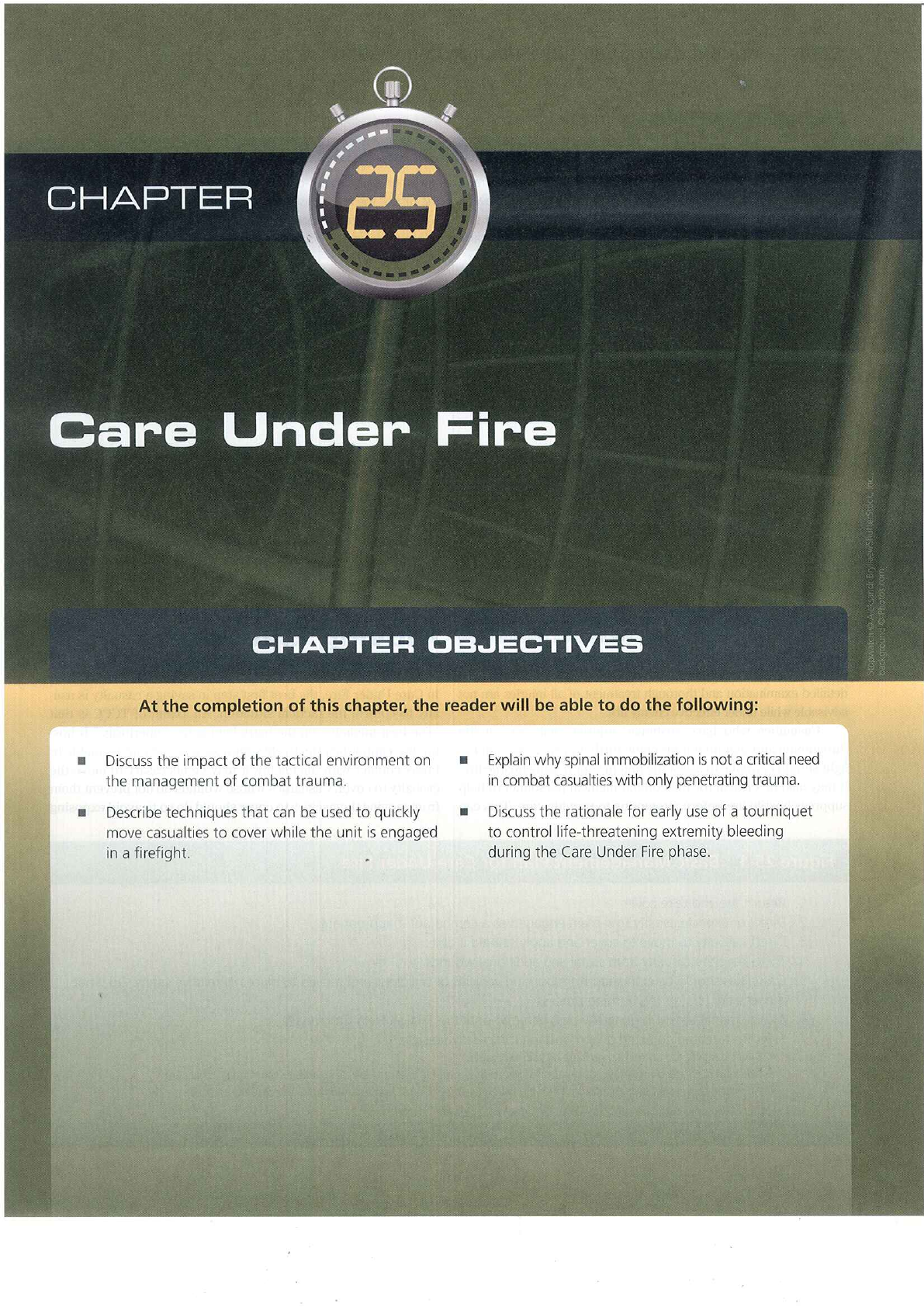 CHAPTER Care Under Fire CHAPTER OBJECTIVES At the completion of this chapter, the reader will be able to do the following: Discuss the impact of the tactical environment on Explain why spinal immobilization is not a critical need the management of combat trauma. in combat casualties with only penetrating trauma. Describe techniques that can be used to quickly Discuss the rationale for early use of a tourniquet move casualties to cover while the unit is engaged to control life-threatening extremity bleeding in a firefight. during the Care Under Fire phase.668 PREHOSPITAL TRAUMA LIFE SUPPORT, MILITARY EIGHTH EDITION SCENARIO Your unit is in a five-vehicle convoy moving through a small Iraqi village when a command-detonated improvised explosive device (IED) explodes under the second vehicle. Moderate sniper fire follows and the rest of the convoy is busily engaged in suppressing it. You are a medic in the disabled vehicle, which is not on fire and is right side up. You are not injured and are able to assist. The person next to you has bilateral midthigh traumatic amputations. There is heavy arterial bleeding from the left stump and only mild oozing of blood from the right stump. The casualty is conscious and in moderate pain. What do you do? 1. What phase of care are you in? 2. What is your immediate concern? 3. Should you treat the casualty or return fire? Why? 4. What is your next action? 5. Should you put a tourniquet on the right stump? Why? 6. What are your next actions? Introduction be especially true in small-unit operations in which friendly fire- power is limited and every weapon in the unit may be needed to As reflected in the Tactical Combat Casualty Care prevail. (TCCC) Guidelines for Care Under Fire shown in Figure 25-1, very limited medical care should be attempted while the casualty and the unit are under effective hostile Moving Casualties in fire. Suppression of hostile fire and moving the casualty to a safe posi- tion are major considerations at this point. Significant delays for a Tactical Settings detailed examination and thorough treatment of all injuries are not In Care Under Fire, the best first step in saving a casualty is usu- advisable while under effective enemy fire. ally to control the tactical situation. An axiom of TCCC is that Casualties who have sustained injuries that are not life "The best medicine on the battlefield is fire superiority." If hos- threatening and that do not preclude further participation in the tile fire cannot be effectively suppressed or the unit is unable to fight should continue to assist the unit in suppressing hostile fire. break contact with the enemy, it may be necessary to move the It may also be critical for the combat medical personnel to help casualty to cover. Casualties whose wounds do not prevent them suppress hostile fire before attempting to provide care. This can from moving themselves to cover should do SO to avoid exposing Figure 25-1 Basic Management Plan for Care Under Fire 1. Return fire and take cover. 2. Direct or expect casualty to remain engaged as a combatant if appropriate. 3. Direct casualty to move to cover and apply self-aid if able. 4. Try to keep the casualty from sustaining additional wounds. 5. Casualties should be extricated from burning vehicles or buildings and moved to places of relative safety. Do what is necessary to stop the burning process. 6. Airway management is generally best deferred until the Tactical Field Care phase. 7. Stop life-threatening external hemorrhage if tactically feasible: Direct casualty to control hemorrhage by self-aid if able. Use a tourniquet for hemorrhage that is anatomically amenable to tourniquet application. Apply the tourniquet proximal to the bleeding site, over the uniform, tighten, and move the casualty to cover. Source:CHAPTER 25 Care Under Fire 669 the combat medical personnel to unnecessary hazards. If unable clothing, or improvised harness makes the two-person drag eas- to move and unresponsive, the casualty is likely beyond help, ier. However, if those items are not available, then grasping the and risking the lives of rescuers by subjecting them to enemy fire casualty under the arms is all that is necessary to accomplish this in an unprotected area at this point in the engagement is usually drag. A one-person drag can be used for short distances, but it not warranted. is more difficult for the rescuer, is slower, and is less controlled If a casualty is responsive but unable to move, a rescue plan (Figure 25-3). should be developed, as follows: The great disadvantage of dragging is that the casualty is in contact with the ground, and this can cause additional injury 1. Determine the potential risk to the rescuers, keeping in in rough terrain. Carrying the casualty may be a better option mind that rescuers should not move into a zeroed-in posi- when tactically feasible. The Hawes carry is a one-person tech- tion (i.e., where there is effective concentration of enemy nique that allows for rapid movement (Figure 25-4). If the fire). Did the casualty trip a booby trap or mine? Where is casualty can maintain an upright position, the rescuer stands in fire coming from? Is it direct or indirect (e.g., rifle, machine front of the casualty and squats down. The casualty's arms are gun, grenade, mortar)? Are there electrical, fire, chemical, moved around the neck of the rescuer and held in place. The water, mechanical, or other environmental hazards? rescuer then stands and leans forward, assuming the weight 2. Consider your assets. What can rescuers provide in the of the casualty, and moves to the desired location. Unlike the way of covering fire, screening, shielding, and rescue- applicable equipment? 3. Make sure all mission personnel understand their role in the rescue and which movement technique is to be used (e.g., drag, carry, rope, stretcher). If possible, let the casu- alty know what the plan is SO that the casualty can assist as much as possible by rolling to