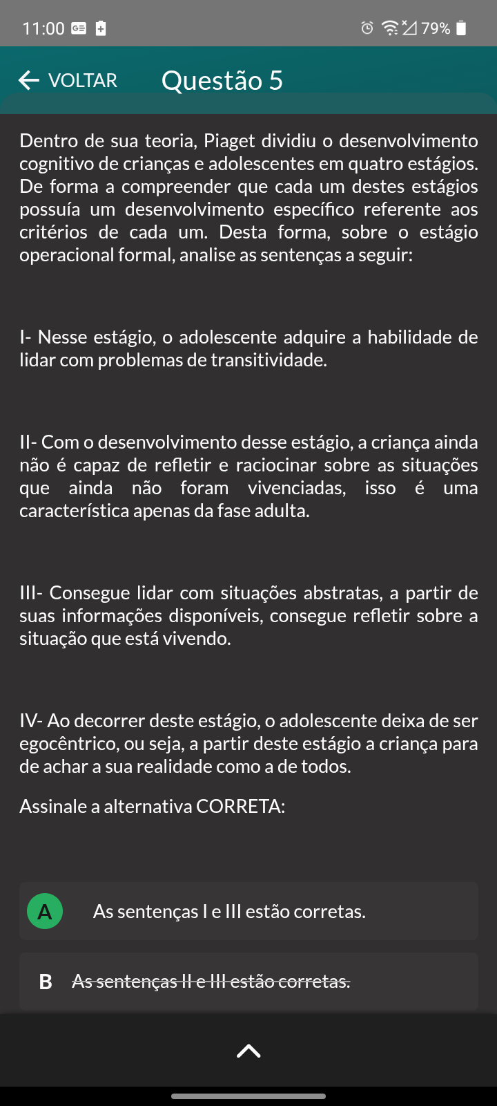 11:00 79% VOLTAR Questão 5 Dentro de sua teoria, Piaget dividiu desenvolvimento cognitivo de crianças e adolescentes em quatro estágios. De forma a compreender que cada um destes estágios possuía um desenvolvimento específico referente aos critérios de cada um. Desta forma, sobre estágio operacional formal, analise as sentenças a seguir: I- Nesse estágio, O adolescente adquire a habilidade de lidar com problemas de transitividade. II- Com O desenvolvimento desse estágio, a criança ainda não é capaz de refletir e raciocinar sobre as situações que ainda não foram vivenciadas, isso é uma característica apenas da fase adulta. III- Consegue lidar com situações abstratas, a partir de suas informações disponíveis, consegue refletir sobre a situação que está vivendo. IV- Ao decorrer deste estágio, adolescente deixa de ser egocêntrico, ou seja, a partir deste estágio a criança para de achar a sua realidade como a de todos. Assinale a alternativa CORRETA: A As sentenças e III estão corretas. B As-sentenças
