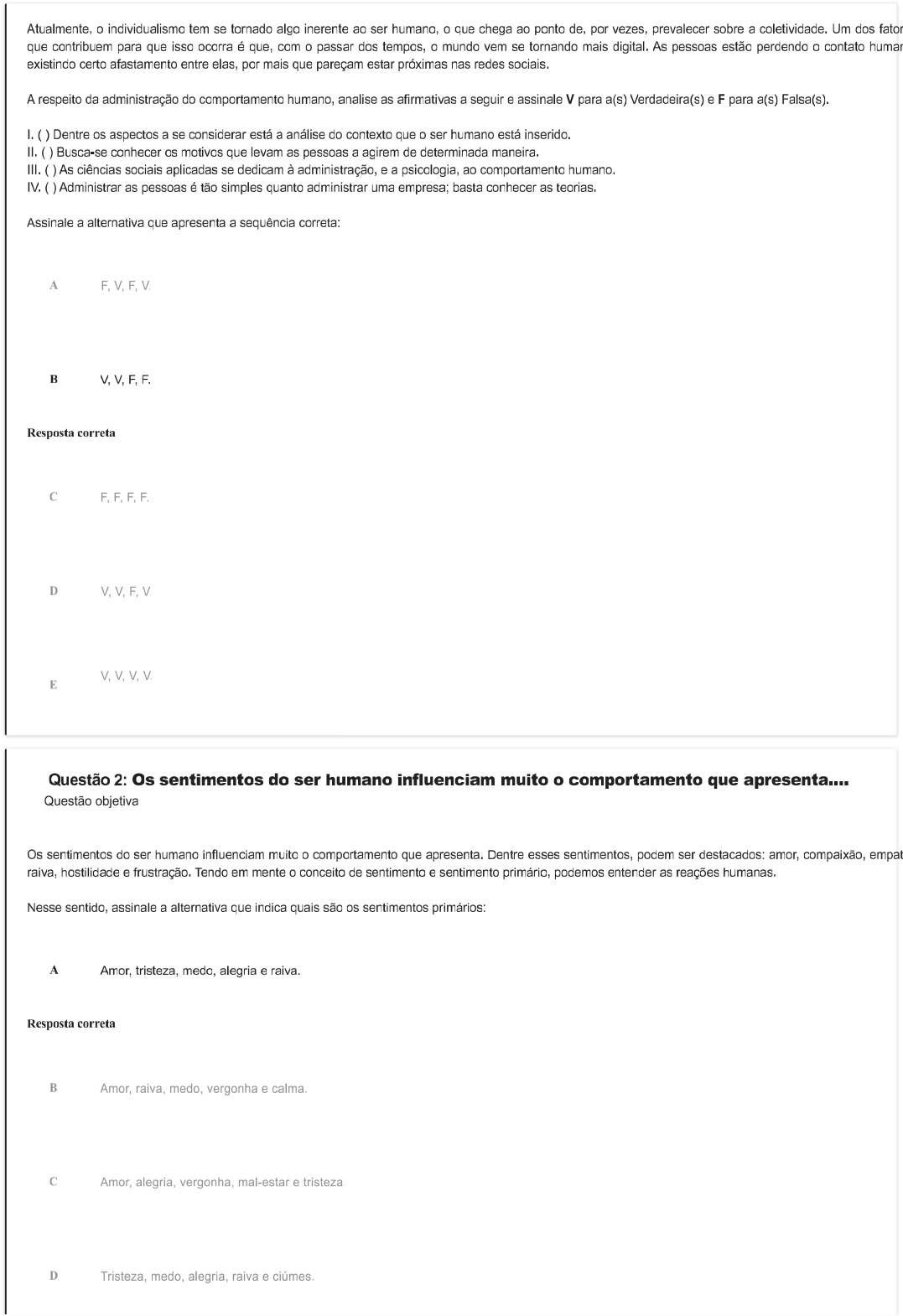 Atualmente, o individualismo tem se tornado algo inerente ao ser humano, o que chega ao ponto de, por vezes, prevalecer sobre a coletividade. Um dos fator que contribuem para que isso ocorra é que, com o passar dos tempos, o mundo vem se tornando mais digital. As pessoas estão perdendo o contato human existindo certo afastamento entre elas, por mais que pareçam estar próximas nas redes sociais. A respeito da administração do comportamento humano, analise as afirmativas a seguir e assinale V para a(s) Verdadeira(s) e F para a(s) Falsa(s). I. Dentre os aspectos a se considerar está a análise do contexto que o ser humano está inserido. II. Busca-se conhecer os motivos que levam as pessoas a agirem de determinada maneira. III. As ciências sociais aplicadas se dedicam à administração, e a psicologia, ao comportamento humano. IV. Administrar as pessoas é tão simples quanto administrar uma empresa; basta conhecer as teorias. Assinale a alternativa que apresenta a sequência correta: A B Resposta correta C D E Questão 2: Os sentimentos do ser humano influenciam muito o comportamento que apresenta.... Questão objetiva Os sentimentos do ser humano influenciam muito o comportamento que apresenta. Dentre esses sentimentos, podem ser destacados: amor, compaixão, empat raiva, hostilidade e frustração. Tendo em mente o conceito de sentimento e sentimento primário, podemos entender as reações humanas. Nesse sentido, assinale a alternativa que indica quais são os sentimentos primários: A Amor, tristeza, medo, alegria e raiva, Resposta correta B Amor, raiva, medo, vergonha e calma. C Amor, alegria, vergonha, mal-estar e tristeza. D Tristeza, medo, alegria, raiva eE ciúmes, tristeza, vergonha e raiva. Questão 3: Um dos fatores que formam o homem é a sua personalidade. A personalidade é Questão objetiva Um dos fatores que formam o homem é a sua personalidade. A personalidade é algo que se desenvolve no decorrer da vida da pessoa. Pode-se dizer que, base nela, o ser humano é capaz de se organizar em vários aspectos, dentre eles, o que diz respeito aos sistemas psíquicos, morais e fisiológicos, fazendo que ocorra a determinação individual de cada ser. Considerando as aulas e o conteúdo estudo acerca da personalidade humana, analise as afirmativas a seguir: I. Irmãos gêmeos, mesmo gerados juntos e tendo a mesma criação, possuem personalidades diferentes. II. A compreensão da personalidade dos indivíduos faz com que seja possível antecipar reações em diversas situações. III. indivíduo forma sua personalidade de maneira gradual e em conformidade com sua experiência de vida. IV. A personalidade humana é formada gradualmente, possui lógica e reflete a experiência de vida da pessoa. Está correto o que se afirma em: A apenas. B e apenas. C II, III e apenas. D e III, apenas. Resposta correta I, E Questão 4: comportamento humano é um dos fatores inerentes aos seres humanos que mais Questão objetiva comportamento humano é um dos fatores inerentes aos seres humanos que mais provocam a curiosidade. As pessoas são levadas ao mundo da com a finalidade de procurar razões para determinados comportamentos, por exemplo, o riso praticamente involuntário, ao verem um bebê gargalhando. Considerando as aulas e o conteúdo estudado acerca do comportamento humano, analise as afirmativas a seguir: I. homem, independentemente de seus pensamentos, influencia o ambiente onde está inserido. II. homem, no que diz respeito ao seu comportamento e natureza, sofre muita influência do ambiente no qual está inserido. III. sistema nervoso é o responsável pelas reações do indivíduo; logo, influencia o comportamento humano. IV. Pessoas que vivem em ambientes diferentes, provavelmente, terão natureza humana diferente. Está correto o que se afirma em: A apenas.B e III, apenas. C Resposta correta D I, II e IV, apenas. E Questão 5: Um dos aspectos que fazem com que as pessoas peçam a demissão de seus Questão objetiva Um dos aspectos que fazem com que as pessoas peçam a demissão de seus empregos é o ambiente onde trabalham. A grande rotatividade de funcionári atrapalha o bom funcionamento das empresas. Por isso, é cada vez mais comum as empresas prezarem o bem estar de seus funcionários, e, para isso, a ética a moral são grandes ferramentas. Considerando o conteúdo estudado sobre a ética nas empresas, analise as afirmativas a seguir: I. Características que busquem o conhecimento, para o processo de tomada de decisões. II. Aumento da participação dos funcionários nos processos III. Incentivo à busca pelo conhecimento da moral e ética social. IV. Utilização de métodos de coerção mediante a hierarquia de cargos. Está correto o que se afirma em: A e II, apenas. B e III, apenas. Resposta correta C II, III e IV, apenas. D I, e III, apenas. I, II e IV, apenas. EQuestão 6: o estudo da ética em graduações é relativamente novo. No Brasil, passou a Questão objetiva estudo da ética em graduações é relativamente No Brasil, passou a vigorar em 1992, por meio de uma portaria do Ministério da Educação. Entretan mesmo com seu caráter jovial, o estudo da ética já fez a sociedade perceber sutis mudanças no comportamento dos profissionais. Mudanças essas vistas con positivas, profissionalmente. Nesse sentido, assinale a alternativa que indica o motivo de se estudar ética: A Compreender as funções de sua formação, independentemente das situações eticamente envolvidas. B Compreender o significado de ética e moral, a fim de interpretar o impacto das mudanças governamentais na sua C Conhecer a legislação e as regras a fim de obedecê-las e saber avaliar as diversas situações em que se envolve. Resposta correta D Perceber que a legislação nem sempre deve ser aplicada, pois, muitas vezes, é falha e injusta. E Conhecer os pontos falhos na legislação e procurar maneiras de beneficiar as pessoas com isso. Questão 7: Leia o excerto a seguir: "A p