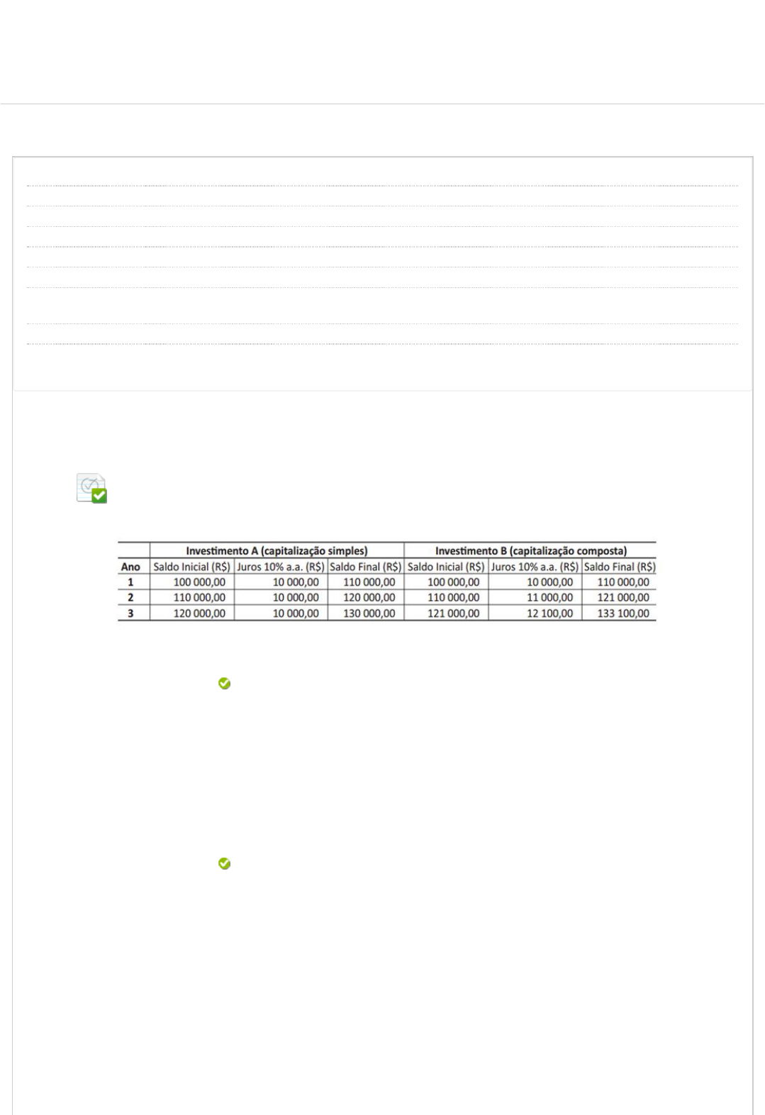 Revisar envio do teste: QUESTIONÁRIO UNIDADE IMATEMÁTICA FINANCEIRA 4650-30_55823_D_20242 CONTEÚDO Usuário bruna.borba2 @aluno.unip.br Curso MATEMÁTICA FINANCEIRA Teste QUESTIONÁRIO UNIDADE I Iniciado 21/11/24 19:02 Enviado 21/11/24 19:10 Status Completada Resultado da tentativa 4,5 em 5 pontos Tempo decorrido 8 minutos Resultados exibidos Todas as respostas, Respostas enviadas, Respostas corretas, Comentários, Perguntas respondidas incorretamente Pergunta 1 Resposta Selecionada: c. Respostas: a. b. c. d. e. Comentário da resposta: (ENADE 2015) O gerente �nanceiro de uma empresa de serviços analisou as opções de investimento A e B, apresentadas na tabela a seguir, sobre um capital de $ 100.000,00 no período de três anos. Em ambas as opções, os juros são capitalizados anualmente à taxa de 10% ao ano, segundo regimes de capitalização diferentes. Com base na análise dos dados apresentados, conclui-se que: O investimento B é mais atrativo, porque os juros são calculados sobre o montante, o qual inclui os juros do período anterior. O investimento A gerou para a empresa o valor de $ 30.000,00, o que corresponde à apuração de juros sobre juros, ao �nal do período de três anos. O investimento B é mais atrativo, porque os juros são calculados de forma linear e incidem sobre o capital inicial investido pela empresa. O investimento B é mais atrativo, porque os juros são calculados sobre o montante, o qual inclui os juros do período anterior. O investimento A é menos atrativo, porque os juros aumentaram a cada período de forma exponencial. O investimento A gera para a empresa montante inferior ao investimento B, ao �nal de cada ano. Resposta: C Comentário: Se analisarmos cada uma das a�rmações veremos que todas, com exceção da a�rmação da alternativa “c”, possuem algum erro: CONTEÚDOS ACADÊMICOS BIBLIOTECAS MURAL DO ALUNO TUTORIAISUNIP EAD 0,5 em 0,5 pontos 21/11/24, 19:11 Revisar envio do teste: QUESTIONÁRIO UNIDADE I – ... https://ava.ead.unip.br/webapps/assessment/review/review.jsp?attempt_id=_109577750_1&course_id=_363777_1&content_id=_4155804_1&retu… 1/7 http://company.blackboard.com/ https://ava.ead.unip.br/webapps/blackboard/execute/courseMain?course_id=_363777_1 https://ava.ead.unip.br/webapps/blackboard/content/listContent.jsp?course_id=_363777_1&content_id=_4153549_1&mode=reset https://ava.ead.unip.br/webapps/portal/execute/tabs/tabAction?tab_tab_group_id=_25_1 https://ava.ead.unip.br/webapps/portal/execute/tabs/tabAction?tab_tab_group_id=_27_1 https://ava.ead.unip.br/webapps/portal/execute/tabs/tabAction?tab_tab_group_id=_47_1 https://ava.ead.unip.br/webapps/portal/execute/tabs/tabAction?tab_tab_group_id=_29_1 https://ava.ead.unip.br/webapps/portal/execute/tabs/tabAction?tab_tab_group_id=_10_1 https://ava.ead.unip.br/webapps/login/?action=logout • Na alternativa “a” o valor dos juros, ao �nal de cada período, é o mesmo no valor de $ 10. 000,00 o que descarta a a�rmação juros sobre juros; • Na alternativa “b” os juros são calculados sobre o valor atualizado, ao �nal de cada período. Observe que os valores dos juros se alteram em cada ano; • Na alternativa “d” os juros se mantêm constantes, ou seja, não aumentam de forma exponencial; • Na alternativa “e”, somente a partir do segundo ano que o montante produzido por A é inferior ao montante produzido por B; Portanto, a a�rmação correta é a alternativa “c” que, de fato, os juros são calculados sobre o valor atualizado, ao �nal de cada período. Pergunta 2 Resposta Selecionada: e. Respostas: a. b. c. d. e. Comentário da resposta: No �nal de 2 anos, a empresa XYZ deverá efetuar um pagamento de $ 200.000,00, referente ao valor de um empréstimo contraído hoje, mais os juros compostos devidos, correspondente a uma taxa de 3% a.m. Qual foi o valor aproximado emprestado à empresa hoje? $ 98.386,75. $ 81.713,44. $ 85.584,65. $ 88.548,07. $ 93.911,17. $ 98.386,75. . Pergunta 3 Resposta Selecionada: b. Respostas: a. b. c. d. O banco KLM fez uma aplicação de $ 1.000.000,00 por 12 meses a uma taxa de 18% ao ano sob o regime de capitalização composta. O valor resgatado após os 12 meses foi de: $ 1.180.000,00. $ 1.188.100,00. $ 1.180.000,00. $ 1.192.200,00. $ 1.191.300,00. 0,5 em 0,5 pontos 0,5 em 0,5 pontos 21/11/24, 19:11 Revisar envio do teste: QUESTIONÁRIO UNIDADE I – ... https://ava.ead.unip.br/webapps/assessment/review/review.jsp?attempt_id=_109577750_1&course_id=_363777_1&content_id=_4155804_1&retu… 2/7 e. Comentário da resposta: $ 1.193.700,00. . Pergunta 4 Resposta Selecionada: a. Respostas: a. b. c. d. e. Comentário da resposta: Qual o montante auferido em uma aplicação de $ 50.058,80 em regime de juros compostos, pelo prazo de um ano, à taxa de 2,08% a.m.? $ 64.086,77. $ 64.086,77. $ 64.011,49. $ 63.936,28. $ 63.861,16. $ 63.786,11. . Pergunta 5 Resposta Selecionada: b. Respostas: a. b. Um banco anuncia o seguinte: "aplique hoje $ 10.000,00 e receba daqui a três anos $ 20.000,00". Qual a taxa paga pelo banco no triênio? 100%. 50%. 100%. 0,5 em 0,5 pontos 0,5 em 0,5 pontos 21/11/24, 19:11 Revisar envio do teste: QUESTIONÁRIO UNIDADE I – ... https://ava.ead.unip.br/webapps/assessment/review/review.jsp?attempt_id=_109577750_1&course_id=_363777_1&content_id=_4155804_1&retu… 3/7 c. d. e. Comentário da resposta: 150%. 200%. 250%. Resposta: B Comentário: Para o cálculo da taxa de correção, utilizamos uma das relações básicas da Matemátca Financeira: Pergunta 6 Um capital A de $ 1.000,00 é aplicado a juros simples, à taxa de 12% a.a., ao passo que um outro capital B, também de $ 1,000,00, é aplicado a juros compostos, à taxa de 10% a.a. Demonstre em um �uxo de caixa a partir de quantos anos de aplicação o montante produzido por B será superior ao produzido por A e assinale a alternativa correta quanto ao tempo. 0,5 em 0,5 pontos 21/11/24, 19:11 Revisar envio do teste: QUESTIONÁRIO UNIDADE I 