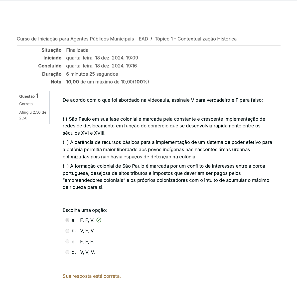 Questão 1 Correto Atingiu 2,50 de 2,50 Curso de Iniciação para Agentes Públicos Municipais - EAD / Tópico 1 � Contextualização Histórica Situação Finalizada Iniciado quarta-feira, 18 dez. 2024, 19�09 Concluído quarta-feira, 18 dez. 2024, 19�16 Duração 6 minutos 25 segundos Nota 10,00 de um máximo de 10,00�100%� De acordo com o que foi abordado na videoaula, assinale V para verdadeiro e F para falso: ( ) São Paulo em sua fase colonial é marcada pela constante e crescente implementação de redes de deslocamento em função do comércio que se desenvolvia rapidamente entre os séculos XVI e XVIII. ( ) A carência de recursos básicos para a implementação de um sistema de poder efetivo para a colônia permitia maior liberdade aos povos indígenas nas nascentes áreas urbanas colonizadas pois não havia espaços de detenção na colônia. ( ) A formação colonial de São Paulo é marcada por um conflito de interesses entre a coroa portuguesa, desejosa de altos tributos e impostos que deveriam ser pagos pelos “empreendedores coloniais” e os próprios colonizadores com o intuito de acumular o máximo de riqueza para si. Escolha uma opção: a. F, F, V. b. V, F, V. c. F, F, F. d. V, V, V. Sua resposta está correta. https://emaspead.prefeitura.sp.gov.br/course/view.php?id=103 https://emaspead.prefeitura.sp.gov.br/course/section.php?id=1266 Questão 2 Correto Atingiu 2,50 de 2,50 A chegada da corte portuguesa de D. João VI ao Brasil no início do século XIX, em 1808, marca o fim da fase colonial da construção do Brasil e marca o início de sua fase imperial que se estende até 1889, quando a república é proclamada, pondo fim ao poder monárquico português. A primeira metade do século XIX, é marcada por uma série de transformações tanto na política do novo império como na economia e na cultura e São Paulo torna-se um ponto de conexão entre o litoral e o interior de grande relevância, assinale a alternativa que representa o projeto de cidade paulista nascente mencionado na videoaula: Escolha uma opção: a. Com o advento do ciclo do café no interior do estado em meados do século XIX, comandado por latifundiários escravistas, a gestão política da cidade de São Paulo passa a sofrer forte influência de uma elite desejosa de transformar São Paulo em uma cópia das grandes cidades europeias onde pudessem viver em sintonia com os novos rumos do capitalismo global, sem incluir em seu projeto de cidade, as populações menos favorecidas, relegadas às margens e periferias da cidade. b. Com o novo ciclo econômico do café, surge uma nova demanda entre as elites cafeeiras: viver em sintonia com o modelo de vida europeu capitalista. Isso vai ocasionar a implementação sucessiva de políticas de embelezamento e reurbanização da cidade com o intuito de superar as heranças arcaicas da colônia, inserindo a cidade num mundo de transformações democráticas. c. Com os crescentes fluxos econômicos oriundos dos empreendimentos do café, a cidade de São Paulo adquire rapidamente recursos para a implementação de um sistema sofisticado de gestão da cidade, cujo reflexo é a implementação de diretrizes de solução de problemas abrangentes atendendo às novas demandas sociais de seu contexto, a saber: saneamento básico, distribuição de terras, transporte e recreação. d. Logo no início do século XIX, São Paulo sofre transformações radicais em seu território em virtude da volumosa produção de café no interior paulista, ocasionando reformas urbanas sistêmicas, tais como a implementação de linhas de trem, como a São Paulo Railway, atingindo grandes parcelas da população por meio das linhas de trens e saneamento básico. Sua resposta está correta. Questão 3 Correto Atingiu 2,50 de 2,50 De acordo com a videoaula, há uma conceituação que pode ser aplicada ao contexto da formação colonial de São Paulo, que indica as razões pelas quais o território paulista foi construído ao longo dos séculos XVI ao XIX, assim como as relações sociais de dominação que ocorreram neste processo. O que estaria por trás do nascimento de São Paulo é um princípio econômico, religioso e militar. Selecione a alternativa que melhor descreve este princípio: Escolha uma opção: a. A livre iniciativa de empreendimentos econômicos coloniais conduzidas por empreendedores europeus em plano de livre concorrência de mercado, a exploração violenta de recursos naturais por meio do trabalho de pessoas escravizadas capitaneadas por colonizadores europeus, somada a imposição da religião cristã como forma de apagar e subjugar as concepções de mundo dos povos originários da terra e de povos africanos. b. Uma estrutura política pautada na exclusividade de participação de homens brancos e na subsequente subordinação das demais parcelas da sociedade, a exploração violenta de recursos naturais por meio do trabalho de pessoas escravizadas capitaneadas por colonizadores europeus acompanhadas por um sistema de controle das práticas religiosas que proibia cultos ancestrais indígenas e de matriz africana em lugares públicos mas que permitia o culto em espaços privados domiciliares. c. A exploração violenta de recursos naturais por meio do trabalho de pessoas escravizadas capitaneadas por colonizadores europeus com a permissão da coroa, somada a imposição da religião cristã como forma de apagar e subjugar as concepções de mundo dos povos originários da terra e de povos africanos, e por fim, uma estrutura política pautada na exclusividade de participação de homens brancos e na subsequente subordinação das demais parcelas da sociedade. d. A imposição da religião cristã como forma de apagar e subjugar as concepções de mundo dos povos originários da terra e de povos africanos, uma estrutura política pautada na exclusividade de participação de homens brancos e na subsequente subordinação das demais parcelas da sociedade, e