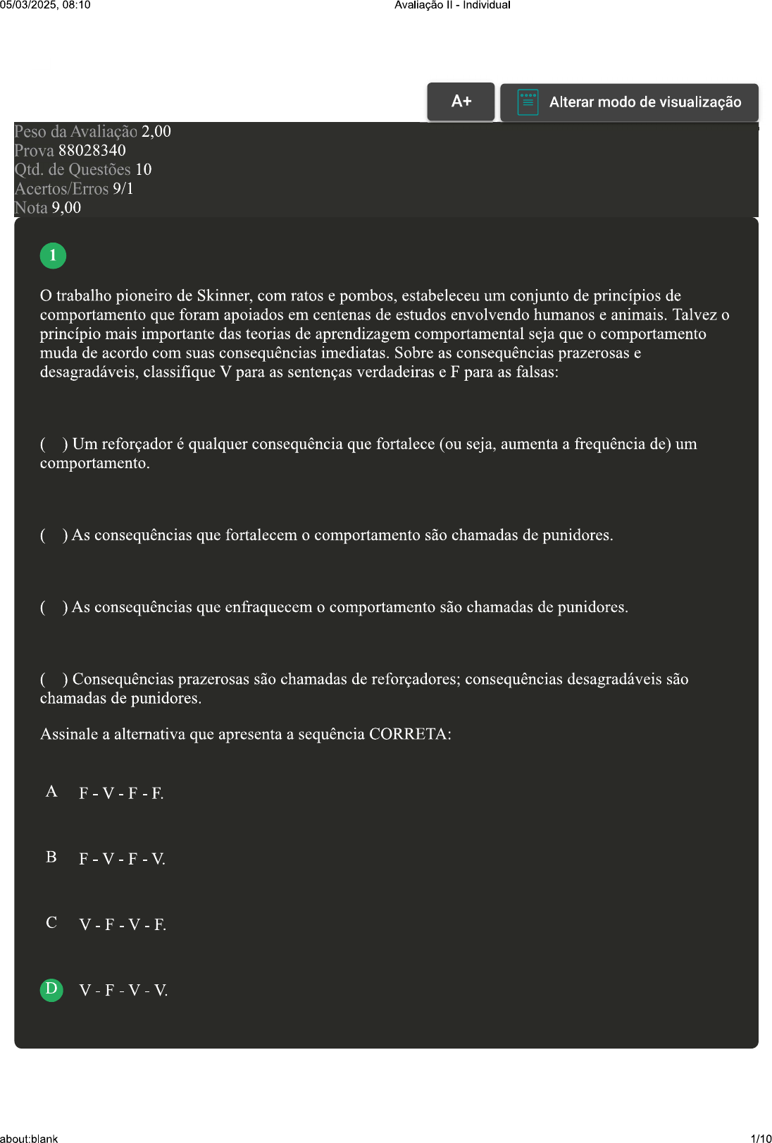 05/03/2025, 08:10 Avaliação - Individual A+ Alterar modo de visualização Peso da Avaliação 2,00 Prova 88028340 Qtd. de Questões 10 Acertos/Erros 9/1 Nota 9,00 1 O trabalho pioneiro de Skinner, com ratos e pombos, estabeleceu um conjunto de princípios de comportamento que foram apoiados em centenas de estudos envolvendo humanos e animais. Talvez princípio mais importante das teorias de aprendizagem comportamental seja que comportamento muda de acordo com suas consequências imediatas. Sobre as consequências prazerosas e desagradáveis, classifique V para as sentenças verdadeiras e F para as falsas: ( ) Um reforçador é qualquer consequência que fortalece (ou seja, aumenta a frequência de) um comportamento. ( ) As consequências que fortalecem comportamento são chamadas de punidores. ( ) As consequências que enfraquecem comportamento são chamadas de punidores. ( ) Consequências prazerosas são chamadas de reforçadores; consequências desagradáveis são chamadas de punidores. Assinale a alternativa que apresenta a sequência CORRETA: A F - V - F - - F. B - - C V-F-V-F D about:blank 1/1005/03/2025, 08:10 Avaliação Individual 2 No final dos anos 1800 e no início dos anos 1900, cientista russo Ivan Pavlov e seus colegas estudaram processo digestivo em cães (BORICH, 2014; 2016). Durante a pesquisa, os cientistas notaram mudanças no tempo e na taxa de salivação desses animais. Sobre condicionamento clássico definido por Ivan Pavlov, classifique V para as sentenças verdadeiras e F para as falsas: ( ) Como a carne provocou essa resposta automaticamente. sem nenhum treinamento ou condicionamento prévio, ela é chamada de estímulo não condicionado ou estímulo incondicionado. ( ) Embora a carne produza salivação sem qualquer experiência ou treinamento prévio, outros estímulos, como toque de um sino, produzem muita salivação. ( ) Como a salivação ocorria automaticamente na presença de carne, também sem a necessidade de nenhum treinamento ou experiência, essa resposta de salivar é chamada de resposta não condicionada ou resposta incondicionada. ( ) Como esses estímulos têm efeito sobre a resposta em questão, eles são chamados de estímulos ativos. Assinale a alternativa que apresenta a sequência CORRETA: FONTE: BORICH, G. D. Effective teaching methods: research-based practice. 8. ed. Boston: Pearson, 2014. ORMROD, J. Human learning. Boston: Pearson, 2016. A F-F-V-V B V-F-V-F C D V. about:blank 2/1005/03/2025, 08:10 Avaliação Individual 3 Um dos princípios mais importantes da psicologia educacional e da aprendizagem é que os professores não podem simplesmente dar conhecimento aos alunos. Os alunos devem construir conhecimento em suas próprias mentes. Você pode facilitar esse processo ensinando de maneira que torne as informações significativas e relevantes para os alunos, dando a eles oportunidades de descobrir ou aplicar ideias por conta própria e ensinando os alunos a conhecer e usar conscientemente suas próprias estratégias de aprendizagem. Você pode dar aos alunos escadas que levam a uma compreensão mais elevada, mas eles próprios devem escalar essas escadas (MCCOMBS, 2010). Sobre a visão construtivista de aprendizagem, analise as sentenças a seguir: I- A essência da teoria construtivista é a ideia de que os alunos devem descobrir e transformar individualmente informações complexas se quiserem torná-las suas (SLAVICH; ZIMBARDO, 2012). II- Os psicólogos cognitivos usam termo elaboração para se referir ao processo de pensar sobre material a ser aprendido, de uma forma que conecte material a informações ou ideias que já estão na mente do aluno (ORMROD, 2016). III- A teoria construtivista vê os alunos constantemente verificando novas informações com relação às regras antigas e, então, revisando as regras quando elas não funcionam mais. Essa visão tem implicações profundas para ensino, porque sugere um papel muito mais ativo para os alunos em sua própria aprendizagem do que é típico em muitas salas de aula (BARNES, 2013). Assinale a alternativa CORRETA: FONTE: BARNES, M. The five-minute teacher: how do I maximize time for learning in my classroom? Alexandria: ASCD, 2013. MCCOMBS, B. Learner-centered practices: providing the context for positive learner development, motivation, and achievement. In: MEECE, J.; ECCLES, J. (eds.). Handbook of research on schools, schooling, and human development. New York: Routledge, 2010. p. 60-74. ORMROD, J. Human learning. Boston: Pearson, 2016. SLAVICH, G.; ZIMBARDO, P. Transformational teaching: theoretical underpinnings, basic principles, and core methods. Educational Psychology Review, V. 24, n. 4, p. 569-608, 2012. A As sentenças I e II estão corretas. B As sentenças II e III estão corretas. about:blank 3/1005/03/2025. 08:10 Avaliação Individual C Somente a sentença I está correta. D As sentenças I e III estão corretas. 4 A revolução construtivista tem raízes profundas na história da educação. Baseia-se fortemente no trabalho de Piaget e Vygotsky, que enfatizaram que a mudança cognitiva ocorre apenas quando as concepções anteriores passam por um processo de desequilíbrio à luz de novas informações. Sobre as raízes históricas do construtivismo, analise as sentenças a seguir: I- Quatro princípios-chave derivados das ideias de Vygotsky desempenharam um papel importante: aprendizagem social, zona de desenvolvimento proximal, aprendizagem cognitiva (ou artesanal) e aprendizagem mediada. II- Michel Foucault e Durkheim também enfatizaram a natureza social da aprendizagem, e ambos sugeriram uso de indivíduos de aprendizagem de habilidades mistas para prolongar conceito III- O pensamento construtivista moderno baseia-se mais fortemente nas teorias de Vygotsky (SCHUNK, 2016), que têm sido usadas para apoiar métodos de instrução em sala de aula, e enfatizam a aprendizagem cooperativa, a aprendizagem baseada em projetos e a descoberta. Assinale a altern