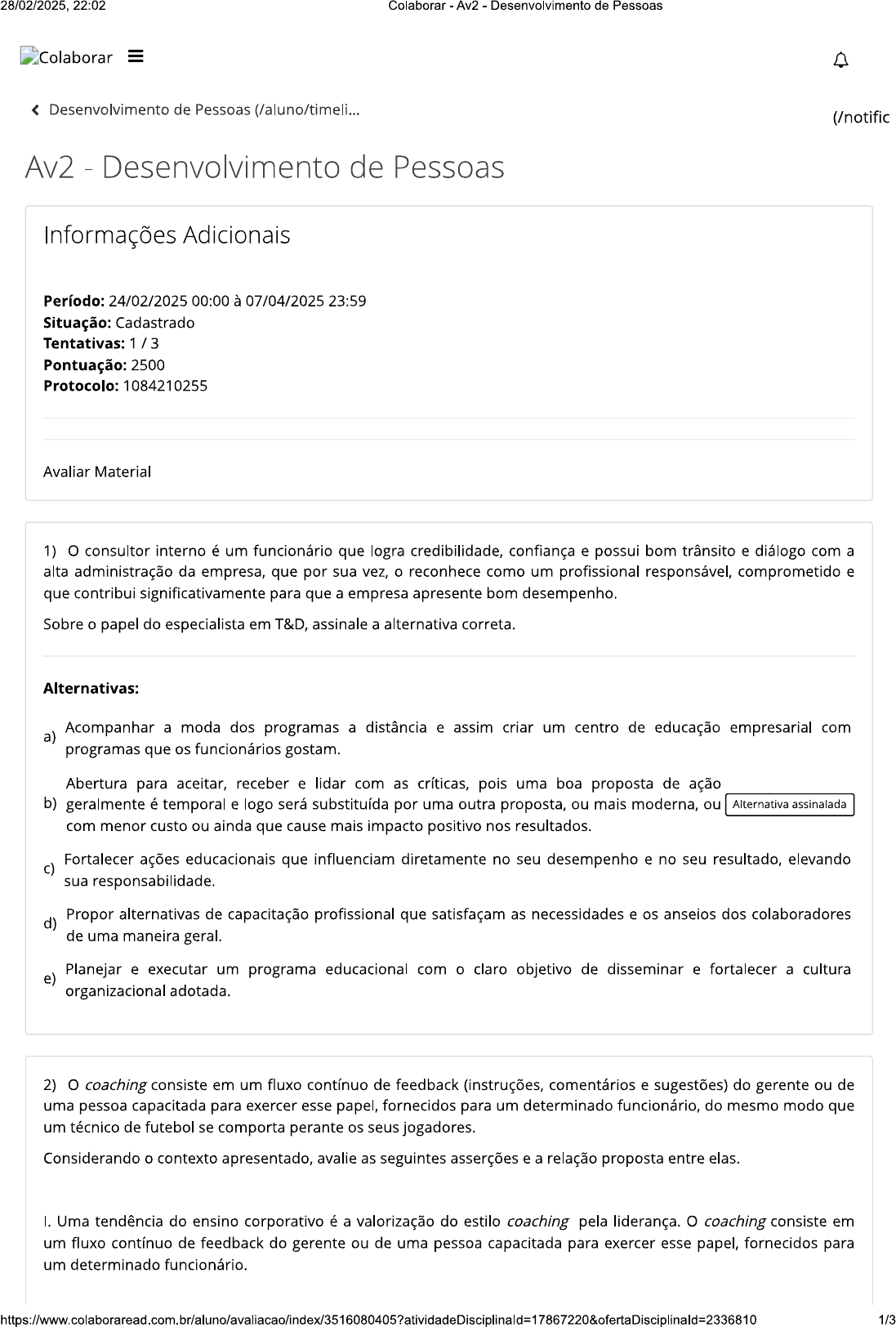 28/02/2025, 22:02 Colaborar - Av2 - Desenvolvimento de Pessoas Colaborar28/02/2025, 22:02 Colaborar Av2 Desenvolvimento de Pessoas PORQUE II. Deste modo o plano estratégico é um documento que descreve os objetivos da empresa em longo prazo, definindo as ações e os recursos necessários para atingi-los e ainda orientando como esses recursos serão distribuídos entre os diversos setores e departamentos. A respeito dessas asserções, assinale a alternativa correta. Alternativas: a) As asserções e são proposições verdadeiras, mas a não é uma justificativa da I. Alternativa assinalada b) As asserções e são proposições verdadeiras, e a é uma justificativa da I. c) A asserção é uma proposição verdadeira, e a é uma proposição falsa. d) A asserção é uma proposição falsa, e a é uma proposição verdadeira. e) As asserções e são proposições 3) O conhecimento tácito é abstrato, invisível e totalmente pessoal, atributos que dificultam e até mesmo inviabilizam a sua identificação, submetendo a sua transmissão e disseminação à dependência de quem o detém. Boisot (1995) citado por Alvarenga Neto (2008) criou uma tipologia de conhecimento visando classificar os tipos de conhecimento com base neles serem ou não serem codificáveis e serem ou não serem difusos. I. tipo estabelecido por Boisot que é passível de registro, pode ser armazenado em meios físicos ou eletrônicos (papeis, cartolinas, cartazes, folhetos, cartões de memórias, arquivos de computadores ou nuvens de armazenamento) e pode ser transmitido de modo mais fiel possível, evitando distorções no conteúdo da informação é denominado de codificado PORQUE II. Os padrões de desempenho são os padrões em termos de qualidade e quantidade a serem atingidos em cada um dos indicadores definidos pela empresa, fornecendo a base para a avaliação dos resultados e estabelecendo um parâmetro para o nível de atividade que servirá de modelo para a avaliação de desempenho. A respeito dessas asserções, assinale a alternativa correta. Alternativas: a) As asserções e são proposições verdadeiras, mas a não é uma justificativa da I. Alternativa assinalada b) As asserções e são proposições verdadeiras, e a é uma justificativa da I. c) A asserção é uma proposição verdadeira, e a é uma proposição falsa. d) A asserção é uma proposição falsa, e a é uma proposição verdadeira. e) As asserções e são proposições falsas. 4) 2/328/02/2025, 22:02 Colaborar - Av2 - Desenvolvimento de Pessoas De acordo com Gibson e colaboradores (2006), é possível encontrar quatro tipos distintos de cultura originadas da da sua dinâmica formal de controle (estável ou flexível) com as formas de atenção (interna ou externa). Considerando o contexto apresentado, avalie as seguintes asserções e a relação proposta entre elas. I. A adaptação a qualquer tipo de cultura é fundamental para a permanência de um trabalhador na empresa, com um eminente risco de exclusão para os que não conseguem se adaptar ou ainda que pensam de maneira diferente das premissas da cultura vigente. PORQUE II. Os aspectos identidade organizacional; compromisso coletivo; estabilidade do sistema social e dispositivo consensual dizem respeito às funções da cultura organizacional. A respeito dessas asserções, assinale a alternativa correta. Alternativas: a) As asserções e são proposições verdadeiras, mas a não é uma justificativa da I. b) As asserções e são proposições verdadeiras, e a é uma justificativa da I. Alternativa assinalada c) A asserção I é uma proposição verdadeira, e a é uma proposição falsa. d) A asserção é uma proposição falsa, e a é uma proposição verdadeira. e) As asserções e são proposições falsas 5) Uma equipe de trabalho é considerada como um "[...] grupo de pessoas que possuem competências que se complementam e estão envolvidas com uma missão, objetivos de desempenho e abordagens em comum, pelos quais elas próprias se consideram mutuamente responsáveis". Assinale a alternativa que apresenta os estágios do ciclo de desenvolvimento, conforme apontado por Kinicki e Kreitner (2006). Alternativas: a) Formação - Quietude - Normatização - Empenho - Finalização. b) Transformação - Tumulto - Normatização - Desempenho - Finalização. c) Transformação - Quietude - Normatização - Empenho - Finalização. d) Formação - Tumulto - Normatização - Desempenho - Finalização. Alternativa assinalada e) Transformação -Tumulto Normatização - Empenho - Finalização. 3/3