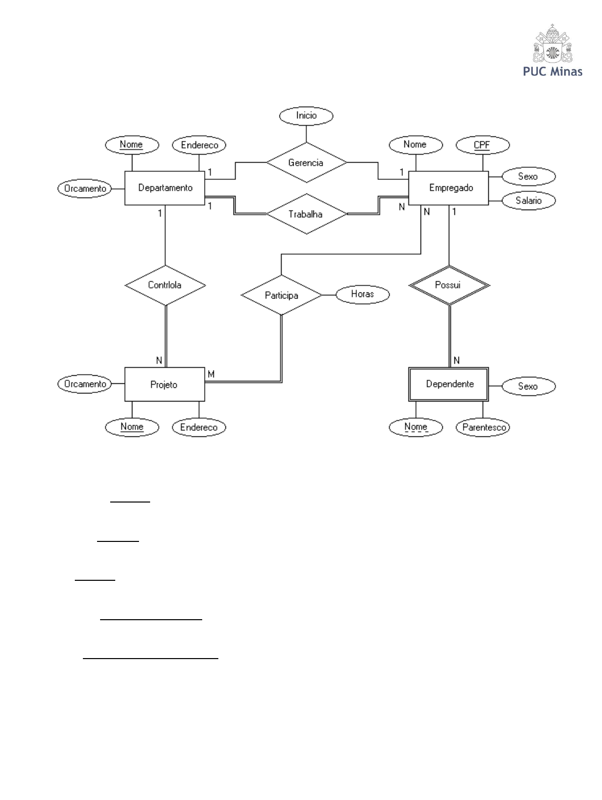 Curso: Sistemas de Informação Disciplina: Bancos de Dados Exercício elaborado pelo Prof. Álisson R. Arantes Considere o diagrama Entidade-Relacionamento apresentado abaixo: O esquema relacional resultante é apresentado a seguir: Departamento(Cod(nn),Nome(nn),Endereço,Orcamento,GCPF,Inicio) Departamento[GCPF] Empregado[CPF] Empregado(CPF(nn),Nome(nn),Sexo,Salario,Depto(nn)) Empregado[Depto] Departamento[Cod] Projeto(Cod(nn),Nome(nn),Endereço,Orcamento,Depto(nn)) Projeto[Depto] Departamento[Cod] Dependente(ECPF(nn),Nome(nn),Parentesco,Sexo) Dependente[ECPF] Empregado[CPF] Participa(Empregado(nn),Projeto(nn),Horas) Participa[Empregado] Empregado[CPF] Participa[Projeto] Projeto[Cod] Formule as consultas abaixo sobre o esquema de banco de dados acima na linguagem SQL: 1. Qual é o nome e CPF de cada empregado? 2. Qual é o nome e valor do orçamento de cada departamento? 3. Qual é o nome e salário das mulheres que ganham mais de R$ 4200,00? 4. Quais os nomes dos departamentos que não possuem gerente? 5. Qual é o nome de cada empregado e de sua esposa ou marido? 6. Qual o nome de cada empregado e do departamento onde trabalha? 7. Qual o nome de cada departamento, do seu gerente e a data em que ele se tornou gerente? 8. Qual o nome de cada projeto e do departamento que o controla? 9. Qual o nome de cada empregado, seus dependentes e parentesco? 10. Quais os nomes das esposas dos empregados que trabalham no projeto Alfa? 11. Qual o nome de cada projeto e dos empregados que dele participam com o número de horas semanais? 12. Qual o nome dos filhos dos empregados que trabalham nos departamentos de Informática e Financeiro? 13. Qual o nome dos filhos dos empregados que trabalham em projetos controlados pelo departamento de Informática? 14. Qual o nome e o salário dos empregados que não possuem dependentes? 15. Quais os nomes dos departamentos que não controlam nenhum projeto? 16. Quantos empregados existem na empresa? 17. Quanto a empresa gasta mensalmente com salários? 18. Qual é o valor do maior salário pago na empresa? 19. Qual é o valor do menor salário pago na empresa? 20. Qual é o valor do salário médio pago pela empresa? 21. Qual é o menor valor de orçamento de projeto existente na empresa? 22. Quais os nomes dos empregados que ganham esse maior salário? 23. Quais são os nomes e departamentos dos empregados que ganham abaixo do salário médio? 24. Quantos empregados do departamento de Informática possuem salário igual ao salário máximo? 25. Quais os nomes dos gerentes que ganham acima do salário médio pago pela empresa? 26. Quais são os projetos que possuem o menor orçamento? 27. Qual o nome de cada empregado e a quantidade de projetos em que trabalha? 28. Qual o nome de cada empregado e o total de horas semanais em que ele trabalha em projetos? 29. Qual o nome de cada projeto com o total de horas semanais em que os empregados trabalham nesse projeto? 30. Qual o nome e o salário dos empregados que trabalham em 2 ou mais projetos? 31. Qual o nome de cada departamento, o nome do gerente e a quantidade de dependentes que o gerente possui? 32. Qual o nome de cada departamento e o seu número de empregados? 33. Qual o nome e o endereço do departamento que possui o maior orçamento? 34. Qual o nome, o salário e o sexo dos empregados que não possuem dependentes, em ordem decrescente de salário? 35. Para cada gerente mostrar o seu nome, salário e quantidade de dependentes, em ordem decrescente de salário. 36. Quais são os nomes e gerentes dos departamentos que possuem 50 ou mais empregados? 37. Para cada departamento que possui projetos controlados por ele, mostrar o seu nome, seu orçamento, a soma dos orçamentos dos seus projetos e o nome do seu gerente, em ordem alfabética dos seus nomes. Vinicius Augusto Realce Vinicius Augusto Realce Vinicius Augusto Realce Vinicius Augusto Realce Vinicius Augusto Realce