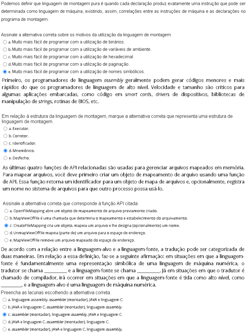 Podemos definir que linguagem de montagem pura é quando cada declaração produz exatamente uma instrução que pode ser determinada como linguagem de máquina, existindo, assim, correlações entre as instruções de máquina e as declarações no programa de Assinale a alternativa correta sobre os motivos da utilização da linguagem de montagem: a. Muito mais fácil de programar com a utilização de b. Muito mais fácil de programar com a utilização de variáveis de ambiente. Muito mais fácil de programar com a utilização de d. Muito mais fácil de programar com a utilização de paginação. e. Muito mais fácil de programar com a utilização de nomes Primeiro, os programadores de linguagem assembly geralmente podem gerar códigos menores e mais rápidos do que os programadores de linguagem de alto nível. Velocidade e tamanho são críticos para algumas aplicações embarcadas, como código em smart cards, drivers de dispositivos, bibliotecas de manipulação de strings, rotinas de BIOS, etc. Em relação à estrutura da linguagem de montagem, marque a alternativa correta que representa uma estrutura de linguagem de a. Executor. b. Corretor. c. Identificador. d. Desfecho. As últimas quatro funções de API relacionadas são usadas para gerenciar arquivos mapeados em memória. Para arquivos, você deve primeiro um objeto de mapeamento de arquivo usando uma função de API. Essa função retorna um identificador para um objeto de mapa de arquivos e, opcionalmente, registra um nome no sistema de arquivos para que outro processo possa usá-lo. Assinale a alternativa correta que corresponde à função API citada. a. OpenFileMapping abre um objeto de mapeamento de arquivo previamente criado. b. MapViewOfFile é uma chamada que determina o mapeamento e estabelecimento do arquivamento. CreateFileMapping cria um objeto, mapeia um arquivo e lhe designa (opcionalmente) um nome. d. UnmapViewOfFile mapeia (parte de) um arquivo para o espaço de endereço. e. MapViewOfFile remove um arquivo mapeado do espaço de endereço. De acordo com a relação entre a linguagem-alvo e a linguagem-fonte, a tradução pode ser categorizada de duas maneiras. Em relação a essa definição, faz-se a seguinte afirmação: em situações em que a linguagem- fonte é fundamentalmente uma representação simbólica de uma linguagem de máquina numérica, tradutor se chama e a linguagem-fonte se chama em situações em que tradutor é chamado de compilador, irá ocorrer em situações em que a linguagem-fonte é tida como alto nível, como e a linguagem-alvo é uma linguagem de máquina numérica. Preencha as lacunas escolhendo a alternativa correta. a. linguagem assembly, assembler (montador), JAVA e linguagem C. b. JAVA e linguagem C, assembler (montador), linguagem assembly. assembler (montador), linguagem assembly, JAVA e linguagem C. d. JAVA e linguagem C, assembler (montador), linguagem C. e. assembler (montador), JAVA e linguagem C, linguagem assembly.Existem ligeiras diferenças que podem ser verificadas nas notações para definição de macros em diferentes assemblers, mas todos querem as mesmas partes básicas em uma definição de macro. Sendo assim, algo comum entre os diferentes assemblers: I. texto do corpo da macro. II. Um cabeçalho que chama uma outra macro criada no passado. III. A pseudoinstrução que marca o início da macro. Assinale a alternativa correta sobre os ponteiros: a. III, b.ll e III, d. e III, e. e II, apenas. A tradução usando programa objeto ou programa binário executável para a linguagem-alvo só pode ser realizada após a conclusão da tradução, e processo é realizado em diferentes etapas. Portanto processo de traduzir programas em códigos de máquina é realizado com auxílio de linguagem assembly. Em relação a essas etapas, identifique se são verdadeiras (V) ou falsas (F) as afirmativas a seguir. I) ( ) A etapa é constituída pela geração de um programa equivalente na linguagem-alvo. II) A etapa é constituída pela execução do programa recém-gerado. III) ( ) As etapas I e ocorrem simultaneamente, de forma a serem independentes. IV) A etapa começa somente após término da fase I, sendo, portanto, dependentes. Assinale a alternativa que apresenta a sequência correta.Programas escritos em linguagem assembly devem ser traduzidos em códigos de máquina antes que possam ser interpretados pela máquina. Esse processo de traduzir programas em códigos de máquina é conhecido como linguagem assembly, que é um nível inferior de linguagem de programação. As pessoas normalmente usam níveis mais altos de programação ao escrever programas que requerem funcionalidades mais complexas. Diante do contexto, observe as afirmativas a seguir. I) A linguagem-fonte e a linguagem-alvo podem ser definidas em diferentes níveis de complexidade. II) Alguns processadores executam diretamente programas escritos no idioma de origem sem a necessidade de tradução para idioma de destino. III) A tradução é efetuada quando há um processador (hardware ou intérprete) disponível para idioma de chegada, mas não para idioma de origem. IV) A conversão ocorre em um programa equivalente chamado programa-objeto ou programa binário executável após a conclusão da tradução. Está correto que se afirma em: a. e II, apenas. b. III, apenas. I, apenas. e III, apenas. e. II, III e IV. Um processador de macros pode ser usado para encurtar Contudo, muitas vezes um programa contém diversas sequências de que são quase, mas não totalmente idênticas Preencha as lacunas escolhendo a alternativa CORRETA: a. Programas e instruções. b. Macros e instruções. e d. Programas e interrupções. e. Macros e programas.