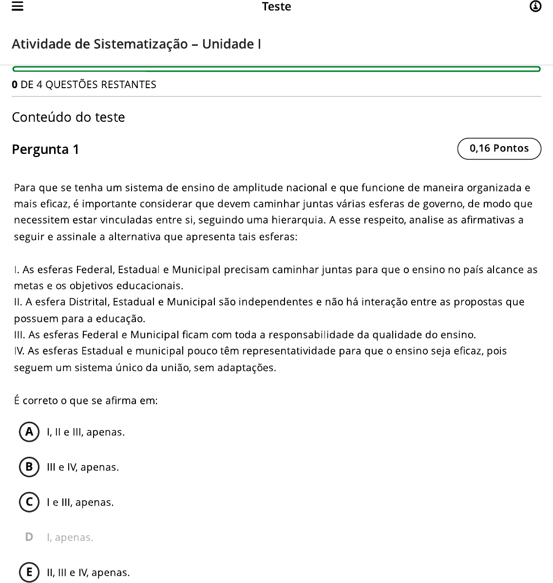 Teste i Atividade de Sistematização - Unidade 0 DE 4 QUESTÕES RESTANTES Conteúdo do teste Pergunta 1 0,16 Pontos Para que se tenha um sistema de ensino de amplitude nacional e que funcione de maneira organizada e mais eficaz, é importante considerar que devem caminhar juntas várias esferas de governo, de modo que necessitem estar vinculadas entre si, seguindo uma hierarquia. A esse respeito, analise as afirmativas a seguir e assinale a alternativa que apresenta tais esferas: I. As esferas Federal, Estadual e Municipal precisam caminhar juntas para que o ensino no país alcance as metas e os objetivos educacionais. II. A esfera Distrital, Estadual e Municipal são independentes e não há interação entre as propostas que possuem para a educação. III. As esferas Federal e Municipal ficam com toda a responsabilidade da qualidade do ensino. IV. As esferas Estadual e municipal pouco têm representatividade para que o ensino seja eficaz, pois seguem um sistema único da união, sem adaptações. É correto o que se afirma em: A I, e III, apenas. B III e IV, apenas. e III, apenas. D I, apenas. E II, III e IV, apenas.Pergunta 2 0,16 Pontos Um sistema, ao ser constituído, assume funções diversas em prol da área que representa. Entre as várias considerações a respeito de um sistema, ele se incumbe da análise e organização para a ação futura frente ao que foi analisado e compreendido como passível de mudanças. Para além dessas considerações, analise as afirmativas a seguir e considere quais atribuições competem a um sistema: I. Atuar para resolver problemas identificados e promover a melhoria contínua é função importante de um sistema. II. O planejamento e a organização não são competências relacionadas a um sistema. III. Aspectos relacionados a métodos não fazem parte das atribuições de um sistema. IV. Os sistemas têm por função nortear as ações para se alcançar determinados objetivos. É correto o que se afirma em: A I, apenas. IV, apenas. II, III e IV, apenas. D II e III, apenas. E III e IV, apenas. Pergunta 3 0,16 Pontos Um dos órgãos responsáveis pela educação nos Estados são os Conselhos Estaduais de Educação. Cada Estado possui o seu Conselho de Educação a fim de possibilitar mais assertividade no alcance dos objetivos educacionais do país, e também, das particularidades de ensino em cada Estado. Quanto a esse Conselho, considere as afirmativas como V para verdadeiro e F para falso. Os Conselhos Estaduais de Educação foram instituídos pela LDB n° 4.024/61. Estão sob responsabilidades desse Conselho regulamentar e normatizar o ensino no Estado. ) Seguir com um trabalho voltado à educação do estado que tenha como premissas as perspectivas nacionais e seja adaptado para a realidade que possui as funções deste conselho. A elaboração do regimento próprio fica a cargo do Conselho Estadual de Educação. As afirmativas são, respectivamente: A F, V, F, V. BF, F, F, V. D V, V, F, F. E Pergunta 4 0,16 Pontos Ao analisar o termo "sistema", é possível verificar que existem vários sistemas em áreas diversas da sociedade. Uma das áreas em que o sistema gera discussões constantes no país é a educação e como ela se organiza. A respeito do sistema voltado para a educação, analise as afirmativas que seguem e assinale a correta. É possível se deparar com termo sistema abrangendo sistemas estaduais e municipais de A ensino, sistema público e privado, sistema de ensino básico e superior, sistema de ensino em instituições e tantas outras situações e abrangência em que termo pode ser empregado. Existe um sistema único de educação para todo território nacional em funcionamento, sendo ele B Federal, atendendo todos os estados e municípios, com um único objetivo, abrangendo todas as esferas de ensino sistema de ensino básico e superior são entendidos como sistemas distintos e não pertencentes C ao sistema nacional de ensino. O termo sistema, pode ser empregado apenas dentro das instituições de ensino, não abrangendo D nenhum outro segmento da educação que não sejam as escolas, nem abranger outras Os sistemas estaduais e municipais de ensino, sistema público e privado, sistema de ensino básico E e superior, sistema de ensino de determinada instituição, todos se apresentam de maneira independente e desvinculado de uma normatização de Âmbito nacional. Salvo pela última vez 16:16:32 Filtro de questões (4) Salvar e fechar Enviar