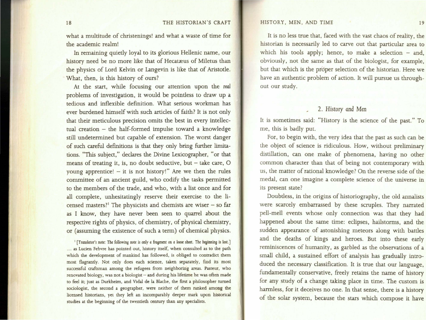 18 THE HISTORIAN'S CRAFT what a multitude of christenings! and what a waste of time for the academic realm! In remaining quietly loyal to its glorious Hellenic name, our history need be no more like that of Hecatmore than a commentary: "History is not the accumulation of events of every kind which happened in the past. It is the science of human societies. " But this is, perhaps, to curtail the role of the individual too much in history; man in society, and societies, are not precisely equivalent ideas. 22 THE HISTORIAN'S CRAFT than the singular, favoring abstraction, the plural which is the grammatical form of relativity is fitting for the science of change. Behind the features of landscape, behind tools or machinery, behind what appear to be the most formalized written documents, and behind institutions, which seem al most entirely detached from their founders, there are men, and it is men that history seeks to grasp.3 Failing that , it will be at best but an exercise in erudition. The good historian is like the giant of the fairy tale . He knows that wherever he catches the scent of human flesh, there his quarry lies. From the character of history as the knowledge of men derives its peculiar situation as regards the problem of expres sion. Is it "science" or "art"? About 1800, our great-grand.fa thers delighted in solemn debates on this question. Later, about 1890, saturated with the aura of a rather primitive positivism, the methodologists were indignant that the public should attach an excessive importance to what they called "form" in historical works. Art versus science, form versus matter: the history of scholarship abounds with such fme debates! There is no less beauty in a precise equation than in a felicitous phrase, but each science has its appropriateapart from history is conceivable. For the pure Deist, it is enough to have the inner light to believe in God. But not to believe in the God of the Christians. For Christianity, as I have already pointed out, is essentially a historical religion: a religion, that is, whose prime dogmas are based on events. Read over your creed: "I believe in Jesus Christ ... who was crucified under Pontius Pilate . . . and who rose from the dead on the third day." Here the beginnings of the faith are also its foundations. Now, this preoccupation with origins, justifiable in a certain type of religious analysis, has spread in a doubtlessly inevitable contagion into other fields of research where its legitimacy is far more debatable. Moreover, history oriented towards origins was put to the service of value judgments. What else did Taine intend, in tracing the "origins" of the France of his day, but a denunciation of the political ill consequences of what he considered a false philosophy of man? And whether the subject was the Germanic invasions or the Norman conquest of England, the past was so assiduously used as an explanation of the present only in order that the present might be the better justified or condemned. So in many cases the demon of origins has been, perhaps, only the incarnation of that other satanic enemy of true history: the mania for making judgments. But let us return to our Christian studies. It is one thing for a troubled and self-searching conscience to determine its attitude toward the Catholic religion by some such code as is daily laid down in our churches; it is quite another for the historian to explain present-day Catholicism as an observed fact. A knowledge of their beginnings is indispensable to HISTORY , MEN, AND TIME 27 understand, but insufficient to account for, the actual religious phenomena. To simplify our problem, we must postpone the question as to how far the creed, identical in name, is the same in substance. Even assuming our religious tradition entirely unchanging, we must find reasons for its preservation. Human reasons, that is, for the assumption of divine intervention would be unscientific. In a word, the question is no longer whether Jesus was first crucified and then resurrected, but how it came to pass that so many fellow humans today believe in the Crucifixion and Resurrection. Now, wherever fidelity to a belief is to be found, all evidences agree that it is but one aspect of the general life of a group. It is like a knot in which are intertwined a host of divergent characteristics of the structure and mentality of a society. In short, a religious creed involves the whole problem of the human environment. Great oaks from little acorns grow. But only if they meet favorable conditions of soil and climate, conditions which are entirely beyond the scope of embryology. Religious history has here been cited only by way of example. In any study, seeking the origins of a human activity, there lurks the same danger of confusing ancestry with expla nation. It is very like the illusion of certain old etymologists who thought they had said all when they set down the oldest known meaning of a word opposite its present sense, having shown, for example, that bureau originally meant a coarse woolen cloth, or that tirnbre4 meant a drum. As if the main problem were not to understand how and why the transition had taken place. As if, above all , the meaning of any word were influenced more by its own past than by the contempo- • A postage stamp. 28 THE HISTORIAN'S CRAFT rary state of the vocabulary which, in its turn, is determined by the social conditions of the moment. Bureaux in bureaux de ministere means a bureaucracy. When I ask for timbres at my post office window, I am able to use that term only because of recent technical changes, such as the organization of the postal service itself, and the substitution of a little gummed picture for the stamping of a postmark, which have revolutionized human communications. It is because the different acceptations of the old word, particularized according to profession, are today so widely different that there is no risk of confusion between the timbre which I glue on 