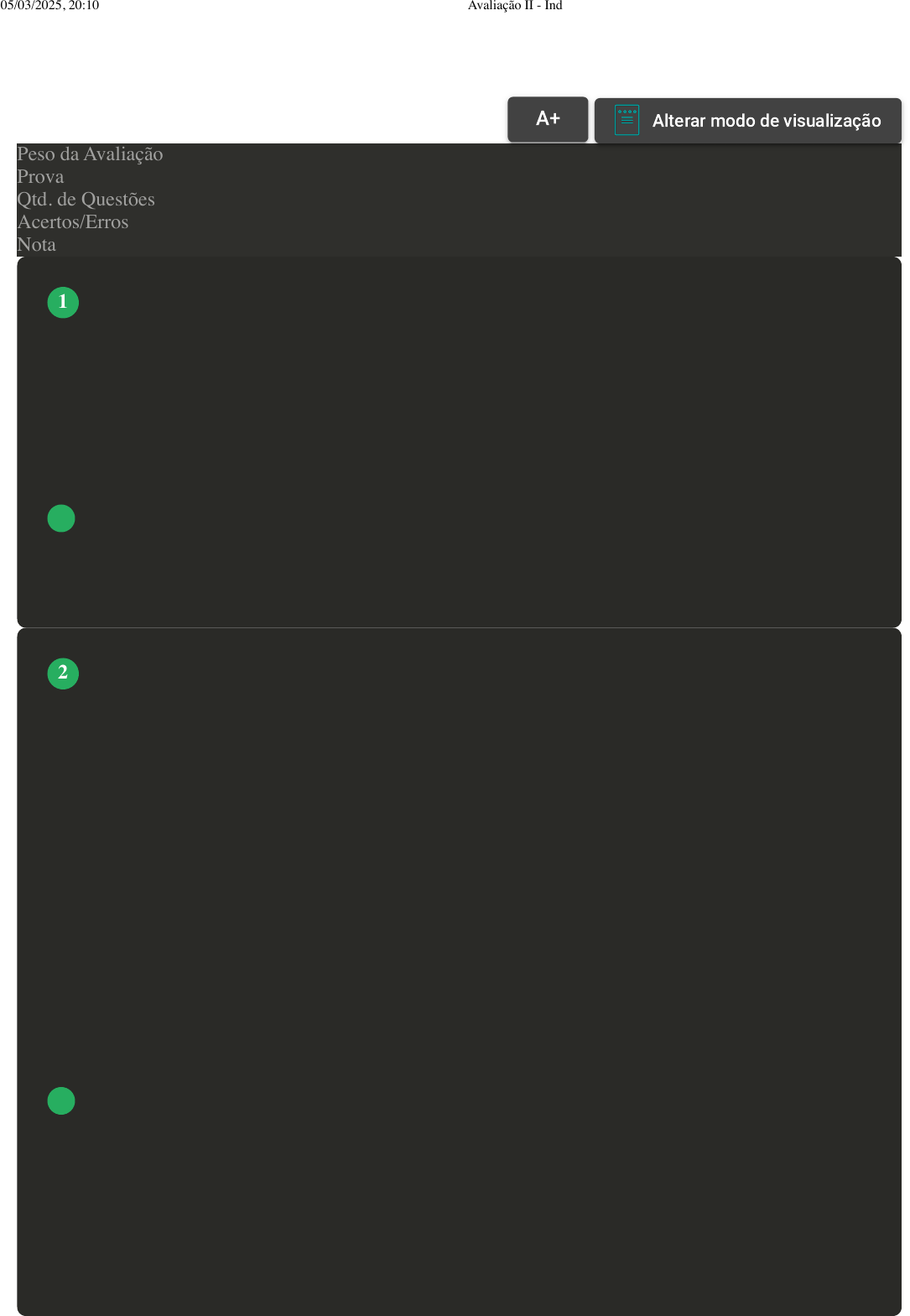 Prova Impressa GABARITO | Avaliação II - Individual (Cod.:1018932) Peso da Avaliação 2,00 Prova 94289508 Qtd. de Questões 10 Acertos/Erros 9/1 Nota 9,00 Existem diversos tipos de nado na natação. Um nado específico caracteriza-se por ser o nado mais veloz em termos de Natação Oficial. Acerca desse estilo de nado, assinale a alternativa CORRETA: A Peito. B Borboleta. C Craw. D Costa. As técnicas de natação sofreram modificações ao longo dos anos. Por exemplo, a substituição do nado peito como o estilo mais praticado, papel hoje atribuído ao nado crawl. O estilo crawl é o mais utilizado nas provas de nado livre que, em piscina, variam entre as distâncias de 50 m a 1500 m (MORÉ, 2008). Sobre o nado crawl, classifique V para as sentenças verdadeiras e F para as falsas: ( ) O estilo crawl da natação é conhecido no mundo todo por ser de mais difícil aprendizagem. ( ) O nado crawl se desenvolveu como o mais rápido dos estilos competitivos. ( ) O nado crawl, como estilo de natação, não é encontrado nos regulamentos oficiais da Federation Internationale de Natation Amateur (FINA), mas o documento apresenta o estilo livre. ( ) O crawl é a forma de nadar utilizada nas provas de nado livre, sem sofrer, no tocante à execução do estilo, a ação fiscalizadora dos chamados juízes de percurso. Assinale a alternativa que apresenta a sequência CORRETA: FONTE: MORÉ, Felipe Coleares. Determinação da coordenação de nado por meio da cinética e cinemática no estilo Crawl. 2008. Dissertação (Mestrado) - Curso de Educação Física, Ciências da Saúde, Escola de Educação Física na Universidade Federal do Rio Grande do Sul, Porto Alegre, 2008. Disponível em: . Acesso em: 14 fev. 2018. A F - V - V - V. B V - F - V - F. C V - F - F - V. D F - V - F - V. VOLTAR A+ Alterar modo de visualização 1 2 05/03/2025, 20:10 Avaliação II - Individual about:blank 1/4 Segundo Catteau e Garoff (1990, p. 123), “toda a evolução dos nados esportivos parece caminhar no mesmo sentido, a saber, que os nados procuram uma colocação ótima nas articulações dos membros superiores e inferiores, de forma a pôr em jogo, numa profundidade ótima, ações de grande amplitude que tendem a se afastar o mínimo possível do eixo de deslocamento”. Acerca do nado considerado o mais rápido na atualidade, assinale a alternativa CORRETA: FONTE: CATTEAU, R.; GAROFF, G. O Ensino da natação. São Paulo: Manole, 1990. A Costas. B Crawl. C Borboleta. D Peito. O crawl moderno é a modalidade de natação que, atualmente, no que se refere à velocidade, se apresenta como capaz de conseguir maior rendimento. Com relação às características do nado crawl, analise as sentenças a seguir: I- Posição ventral do corpo (barriga voltada para baixo). II- Movimentos simultâneos e coordenados das extremidades superiores e inferiores. III- Rosto fora da água, olhando para frente e para cima. IV- Um ciclo consiste numa braçada simultânea, seguida de uma pernada simultânea. Assinale a alternativa CORRETA: A Somente a sentença III está correta. B As sentenças I e II estão corretas. C Somente a sentença I está correta. D As sentenças II e IV estão corretas. Um determiando estilo de nado denota-se quando nos referimos ao nado livre. Acerca desse estilo de nado, assinale a alternativa CORRETA: A Costas. B Medley. C Borboleta. D Crawl. 3 4 Revisar Conteúdo do Livro 5 05/03/2025, 20:10 Avaliação II - Individual about:blank 2/4 O estilo crawl da natação é conhecido no mundo todo por ser de mais fácil aprendizado, sendo, atualmente, a modalidade de nado praticada nas provas de nado livre. Sobre o descrito, assinale a alternativa CORRETA: A De acordo com alguns autores, não fazem parte das principais características do nado crawl: a posição ventral do corpo e movimentos alternados e coordenados das extremidades superiores e inferiores. B A sigla SW5.1 significa nado livre, em que numa prova assim denominada, o competidor pode nadar qualquer nado, exceto nas provas de medley individual ou revezamento quatro estilos. C Quando tratamos do nado costas, existem algumas técnicas possíveis de utilização durante as competições desse estilo, por exemplo: o nado borboleta e o nado crawl. D A sigla SW5.2 refere-se a que o nadador não precisa tocar a parede ao completar cada volta como támbem no final da prova. Este estilo da natação é conhecido no mundo todo por ser de fácil aprendizagem, sendo atualmente a modalidade de nado praticada nas provas de nado livre, pois se caracteriza como o mais rápido dos estilos competitivos. Assinale a alternativa CORRETA que apresenta o nome desse estilo de nado: A Nado borboleta. B Nado costas. C Nado crawl. D Nado peito. Os nados competitivos são classificados em quatro tipos. Há determinada modalidade praticada nas provas de nado livre, que se caracteriza por ser a forma mais rápida de nado. Acerca dessa modalidade, assina a alternativa CORRETA: A Nado Borboleta. B Nado Peito. C Nado Costas. D Nado Crawl. Derterminado fundamento é responsável por 70% da propulsão aquática, sendo composta por fases aérea e aquática. Acerca desse fundamento, assinale a alternativa CORRETA: 6 7 8 9 05/03/2025, 20:10 Avaliação II - Individual about:blank 3/4 A Braçada. B Mergulho. C Flutuação. D Pernada. A natação representa um deslocamento aquático, para isso o nadador tem a opção por quatro estilos diferentes. Acerca dos quatro estilos, assinale a alternativa CORRETA que idenfica o mais rápido: A Nado Crawl. B Nado Borboleta. C Nado Costas. D Nado Livre. 10 Imprimir 05/03/2025, 20:10 Avaliação II - Individual about:blank 4/4