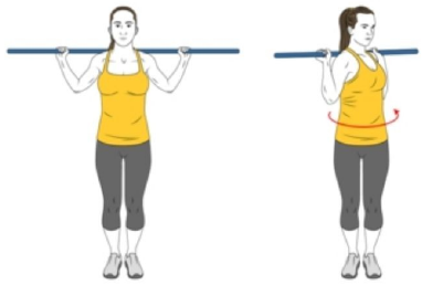 EXERCÍCIOS COM O BASTÃO 1. ROTAÇÃO DE TRONCO COM BASTÃO: · POSIÇÃO DO PACIENTE: Em pé, com os pés afastados na largura dos ombros. O bastão deve estar apoiado sobre os ombros, segurado com ambas as mãos. · COMO EXECUTAR: Vire seu corpo em direção ao seu lado direito girando seu tronco. Volte para a posição inicial e vire seu corpo para o outro lado. · MÚSCULOS: Oblíquos externos e internos, reto abdominal · REFERÊNCIA: https://www.workoutsprograms.com/exercises/trunk-rotations-with-stick 2. ALONGAMENTO DE BRAÇOS E OMBROS COM BASTÃO: · POSIÇÃO DO PACIENTE: Em pé, com os pés afastados na largura dos ombros. Segure o bastão com ambas as mãos à frente do corpo. · COMO EXECUTAR: Levante o bastão acima da cabeça e tente levar os braços o mais para trás possível sem forçar. Mantenha os cotovelos retos e controle o movimento. · MÚSCULOS: Deltoide e tríceps · REFERÊNCIA: https://workoutlabs.com/exercise-guide/shoulder-pole-broomstick-stretch/ 3. ALONGAMENTO LATERAL COM BASTÃO: · POSIÇÃO DO PACIENTE: Em pé, com os pés afastados na largura dos ombros. Segure o bastão com ambas as mãos acima da cabeça. · COMO EXECUTAR: Incline o tronco lateralmente para um lado, alongando a lateral oposta do corpo. Retorne à posição inicial e repita para o outro lado. · MÚSCULOS: Oblíquos e deltoide · REFERÊNCIA: https://fitwill.app/exercise/2120/standing-side-stretch-with-stick/ 4. ALONGAMENTO COM BASTÃO: · POSIÇÃO DO PACIENTE: Em pé, com os pés afastados na largura dos ombros. Segure o bastão à frente do corpo com ambas as mãos. · COMO EXECUTAR: Incline-se para frente, dobrando o quadril, e leve o bastão em direção ao chão. Mantenha as costas retas e alongue o tronco. Ao levantar os braços, você deve sentir um estiramento através das dorsais e todo o lado lateral da parte superior das costas. · MÚSCULOS: Grande dorsal · REFERÊNCIA: https://fitwill.app/exercise/5400/stick-lat-stretch/ 5. MOBILIZAÇÃO DE TORNOZELOS COM BASTÃO: · POSIÇÃO DO PACIENTE: Em uma posição de meio ajoelhado (um joelho no chão e o outro pé à frente). O bastão é segurado com ambas as mãos. · COMO EXECUTAR: Mantenha o bastão à frente e use-o para apoio. Movimente o tornozelo do pé à frente, levando o joelho em direção ao bastão e retornando à posição inicial. · MÚSCULOS ATIVADOS: Tibial anterior e gastrocnêmio · REFERÊNCIA:https://www.functionalmovement.com/Exercises/8/dorsiflexion_from_half_kneeling_with_dowel 6. AGACHAMENTO COM BASTÃO: · POSIÇÃO DO PACIENTE: Em pé, com os pés afastados na largura dos ombros. O bastão é segurado com ambas as mãos à frente do corpo. · COMO EXECUTAR: Flexione os joelhos e o quadril, abaixando o corpo em direção ao chão como em um agachamento, mantendo o tronco reto. O bastão ajuda a manter o equilíbrio durante o movimento. · MÚSCULOS: Quadríceps, glúteos máximos e adutores do quadril · REFERÊNCIA: https://www.wikihow.fitness/Improve-a-Squat image3.jpeg image4.png image5.jpeg image6.jpg image1.png image2.jpeg