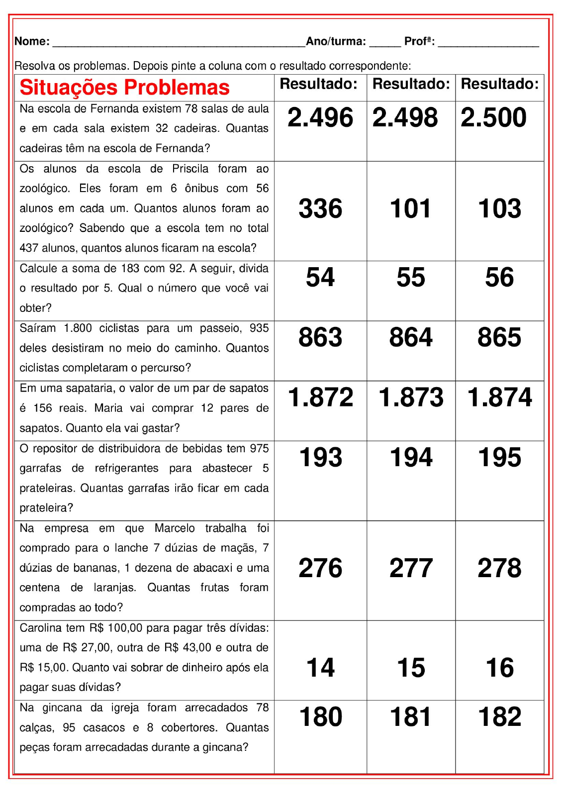 Nome: Ano/turma: Resolva os problemas. Depois pinte a coluna com o resultado correspondente: Situações Problemas Resultado: Resultado: Resultado: Na escola de Fernanda existem 78 salas de aula 2.496 2.498 2.500 e em cada sala existem 32 cadeiras. Quantas cadeiras têm na escola de Fernanda? Os alunos da escola de Priscila foram ao zoológico. Eles foram em 6 ônibus com 56 alunos em cada um. Quantos alunos foram ao 336 101 103 zoológico? Sabendo que a escola tem no total 437 alunos, quantos alunos ficaram na escola? Calcule a soma de 183 com 92. A seguir, divida 54 55 56 o resultado por 5. Qual o número que você vai obter? Saíram 1.800 ciclistas para um passeio, 935 863 864 865 deles desistiram no meio do caminho. Quantos ciclistas completaram o percurso? Em uma sapataria, o valor de um par de sapatos 1.872 1.873 1.874 é 156 reais. Maria vai comprar 12 pares de sapatos. Quanto ela vai gastar? O repositor de distribuidora de bebidas tem 975 193 194 195 garrafas de refrigerantes para abastecer 5 prateleiras. Quantas garrafas irão ficar em cada prateleira? Na empresa em que Marcelo trabalha foi comprado para o lanche 7 dúzias de maçãs, 7 dúzias de bananas, 1 dezena de abacaxi e uma 276 277 278 centena de laranjas. Quantas frutas foram compradas ao todo? Carolina tem R$ 100,00 para pagar três dívidas: uma de R$ outra de R$ 43,00 e outra de R$ 15,00. Quanto vai sobrar de dinheiro após ela 14 15 16 pagar suas dívidas? Na gincana da igreja foram arrecadados 78 180 181 182 calças, 95 casacos e 8 cobertores. Quantas peças foram arrecadadas durante a gincana?Nome: Ano/turma: Resolva os problemas. Depois pinte a coluna com o resultado correspondente: Situações Problemas Resultado: Resultado: Resultado: Uma merendeira preparou 558 pães que foram 30 31 32 distribuídos igualmente em 18 cestas. Quantos pães foram colocados em cada cesta? Felipe quer comprar um tênis que custa R$ 211 212 213 485,00. Ela possui R$ 272,00. Quantos reais faltam para ele comprar o tênis? Com 8 prestações iguais de R$ 185,00 posso 1.480 1.481 1.482 comprar um celular. Quanto vou pagar por esse celular? Uma pessoa deu R$ 280,00 de entrada em uma 2.439 2.440 2.441 televisão e pagou mais 12 prestações de 180,00. Quanto custou essa televisão? Três tênis custam Qual é o preço de 121 122 123 cada tênis? Ana Luíza tem 675 brindes para distribuir para 45 46 47 15 crianças. Quantos brindes recebe cada criança? Um jardineiro tem 975 mudas de rosas para 37 38 39 plantar igualmente em 25 fileiras. Quantos pés de rosas ele plantará em cada fileira? Ana quer distribuir 450 brigadeiros para 25 18 19 20 pessoas. Quantos brigadeiros irá receber cada pessoa? Uma escola recebeu a doação de 3 caixas com 1.000 livros, mais 8 caixas com 100 livros, mais 5 pacotes de 10 livros, mais 9 livros. Quantos 3.857 3.858 3.859 livros esta escola recebeu? Numa fazenda havia 524 bois. Na feira de gado, 607 608 609 o fazendeiro vendeu 183de seus bois e comprou mais 266. Quantos bois há agora na fazenda? Em Belo Horizonte ontem a temperatura máxima foi de 28,3 graus, e hoje, é de 26,7 graus. De quantos graus é a diferença entre as duas 15 16 17 temperaturas?Nome: Ano/turma: Resolva os problemas. Depois pinte a coluna com o resultado correspondente: Situações Problemas Resultado: Resultado: Resultado: Lucas precisa arrumar 1.345 livros em uma estante com 5 prateleiras. Os livros precisam ser distribuídos igualmente nessas prateleiras. 269 270 271 Quantos livros ficarão em cada prateleira? A produção diária de uma fábrica é de 912 lápis. Os lápis são embalados em caixas com 12 unidades. Quantos lápis ficam em cada caixa? 74 75 76 Duas pessoas tem o mesmo peso. Elas pesam 56 57 58 juntos 112 quilos. Qual é o peso de cada uma? Quantas vezes um grupo de 9 pessoas cabem 1.089 1.090 1.091 em um grupo de 9.819? Se eu der R$ 30.000 para pagar uma despesa 3.600 3.601 3.602 de R$ 26.400. Qual a quantia que irei receber de troco? Em uma loja um aparelho custa R$ 11.085. Em 614 615 616 outra loja, o mesmo aparelho custa R$ 11.700. Qual a diferença entre o preço das duas lojas? Felipe tem 95 reais e quer comprar uma máquina fotográfica que custa 1.530 reais. Quantos reais faltam para ele comprar a 1.435 1.436 1.437 máquina? De acordo com o Censo de uma cidade, a população era de 79.412 habitantes. Alguns anos depois, verificou-se que a população dessa 14.657 14.658 14.659 cidade passou a ser de 94.070 habitantes. Qual foi o aumento da população dessa cidade? Uma indústria tinha 10.635 empregados. Em virtude de uma crise econômica dispensou 1.880 funcionários. Com quantos funcionários a 8.755 8.756 8.757 indústria ficou? Qual a diferença entre 10.000 e 5.995? 4.004 4.005 4.006 Quantas unidades faltam a 499 para atingir 1 499 500 501 (unidade de milhar)?Nome: Ano/turma: Resolva os problemas. Depois pinte a coluna com o resultado correspondente: Situações Problemas Resultado: Resultado: Resultado: A fase final do torneio de voleibol da liga nacional é disputado por 4 equipes. Cada equipe pode inscrever 12 jogadores. Quantos 48 49 50 jogadores serão inscritos para disputar a fase final desse torneio? Para uma demonstração de ginástica, um professor de Educação Física prepara 64 grupos de alunos. Cada grupo é formado por 25 alunos. 1.600 1.601 1.602 Quantos alunos devem participar dessa demonstração? Um colégio levou 72 alunos numa excursão ao jardim zoológico e para isso repartiu igualmente os alunos em 4 ônibus. Quantos alunos ficaram 17 18 19 em cada ônibus? Qual é o número natural que você vai obter 20.607 20.608 20.609 quando multiplicar 736 por 28? Um livro tem 216 páginas. Quero terminar a leitura desse livro em 18 dias, lendo o mesmo número de páginas todos os dias. Quantas 10 11 12 páginas preciso ler por dia? Um carro bem regulado percorre 12 quilômetros com um litro de gasolina. Se numa viagem foram consumidos 46 litros, qual a distância em 552 553 554 quilômetr
