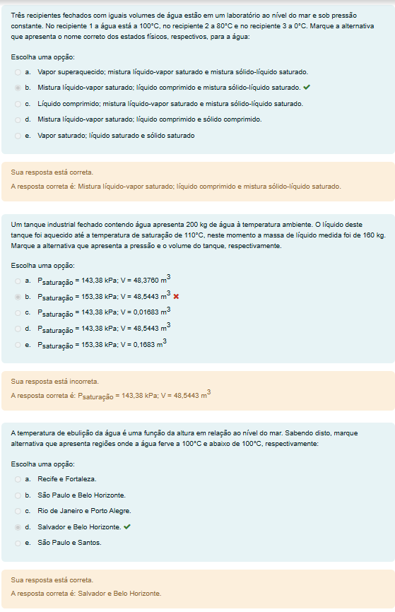 Três recipientes fechados com iguais volumes de água estão em um laboratório ao nível do mar e sob pressão constante. No recipiente 1 a água está a no recipiente 2 a 80°C e no recipiente 3 a Marque a alternativa que apresenta o nome correto dos estados físicos, para a água: Escolha uma opção: a. Vapor mistura líquido-vapor saturado e mistura saturado. b. Mistura líquido-vapor saturado; líquido comprimido e mistura sólido-liquido Líquido mistura líquido-vapor saturado e mistura sólido-liquido saturado. d. Mistura líquido-vapor saturado; líquido comprimido e sólido comprimido. e. Vapor saturado; líquido saturado e sólido saturado Sua resposta está correta. A resposta correta é: Mistura líquido-vapor líquido comprimido e mistura saturado. Um tanque industrial fechado contendo água apresenta 200 kg de água à temperatura ambiente. líquido deste tanque foi aquecido até a temperatura de saturação de 110°C. neste momento a massa de líquido medida foi de 160 kg. Marque a alternativa que apresenta a pressão e volume do Escolha uma opção: a. Psaturação = 143.38 V 48,3760 b. Psaturação 153.38 48,5443 Psaturação 143.38 d. Psaturação 143.38 V 48,5443 e. Psaturação . 153.38 kPa: Sua resposta A resposta correta Psaturação 48,5443 A temperatura de ebulição da água é uma função da altura em relação ao nível do mar. Sabendo disto, marque alternativa que apresenta regiões onde a água ferve a 100°C e abaixo de respectivamente: Escolha uma opção: a. Recife e b. São Paulo e Belo c. Rio de Janeiro e Porto Alegre. d. Salvador e Belo e. São Paulo e Santos. Sua resposta está correta. A resposta correta é: Salvador e Belo