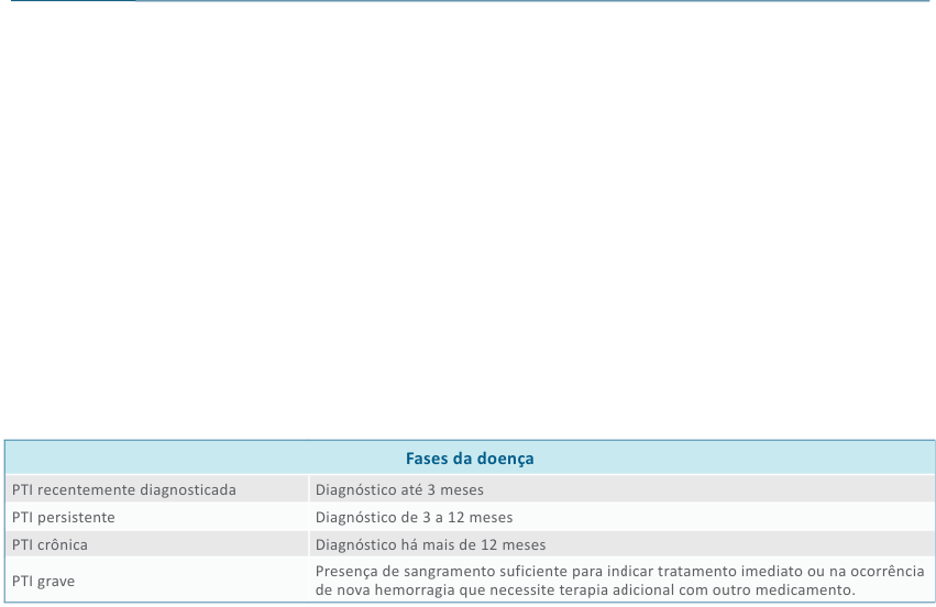 Resumo PDCT: Púrpura trombocitopênica idiopática (PTI) É uma doença geralmente benigna e de causa desconhecida, que se caracteriza por trombocitopenia (baixas contagens de plaquetas). Reconhecem-se autoanticorpos, geralmente da classe da IgG, direcionados a antígenos da membrana plaquetária. Uma vez que a plaqueta apresenta um anticorpo aderido à sua membrana, é reconhecida por macrófagos localizados no baço e em outras áreas de tecido reticuloendotelial, sendo então destruídas, o que acarreta um menor tempo de vida médio plaquetário e, consequentemente, menores contagens de plaquetas circulantes; Classificação da PTI · Incidência anual em torno de 4,1 a 9,5/100 mil crianças, com maior número entre 1 e 5 anos de idade e leve predomínio no sexo masculino; · Apresentação clínica: ocorrência de sangramentos em pacientes previamente saudáveis; · Os pacientes assintomáticos e com contagem plaquetária acima de 30.000/mm³ tendem a seguir um curso clínico favorável, sendo o tratamento restrito aos poucos casos que evoluem para trombocitopenia grave ou com contagens persistentemente abaixo de 20.000/mm³. · Diagnóstico: presença de trombocitopenia (menos de 100.000 plaquetas/mm³) isoladas, sem alterações nas outras séries de hemograma e no esfregaço de sangue periférico; ausência de outras condições clínicas que cursam com trombocitopenia, como infecções, doenças autoimunes, neoplasias, efeitos adversos de medicamentos, entre outras. · Não é recomendado fazer dosagem de anticorpos antiplaquetários devido à baixa acurácia diagnóstica. · PTI crônica e refratária em crianças e adolescentes: contagem de plaquetas abaixo de 20.000/mm3 de forma persistente por pelo menos 12 meses após o diagnóstico; ausência de resposta aos corticosteroides e IVIg; e ausência de resposta ou contraindicação a esplenectomia. Causas comuns de PTI Emergência: presença de sangramento intracraniano ou mucoso (digestivo, geniturinário ou respiratório), com instabilidade hemodinâmica ou respiratória. Tratamento: o objetivo é reduzir o risco de sangramento relevante. Recomendado se plaquetasou refratariedade aos demais. Medicamento Dose Duração Monitorização Doença aguda Prednisona 1 mg/kg/dia, por via oral 14-21 dias Dexametasona 20 mg/m2/dia (até 40 mg/dia), por via oral ou intravenosa 4-8 dias Metilprednisolona 15-30 mg/kg/dia, por via intravenosa 3 dias Imunoglobulina humana 0,8 g/kg a 1 g/kg por dia, por via intravenosa 1-2 dias (se plaquetometria 50.000/mm3 até dose máxima de 75 mg/dia. TGP + TGO + bilirrubina antes de iniciar o tratamento e a cada 2 semanas. Plaquetas 1 vez por semana no primeiro mês. Vincristina 1,4 mg/m2 (dose máxima de 2 mg), por via intravenosa, uma vez por semana quatro semanas consecutivas, a cada seis semanas Hemograma a cada 6 semanas para avaliar leucopenia/neutropenia. Monitorizar a cada 6 semanas neuropatia periférica. Resumo: Púrpura trombocitopênica trombótica hereditária (TTP) · Doença autossômica recessiva rara, associada às mutações ADAMTS13; · Resulta na ausência, ou deficiência grave, da metaloprotease plasmática ADAMTS13, que é necessária para clivagem de multímeros do fator de von Willebrand (que promove a adesão plaquetária à parede do endotélio). · Resulta em diminuição dos multímeros do fator de von Willebrand e aumento do risco de trombose microvascular. · Localização do ADAMTS13: cromossomo 9q34; · Prevalência: mais comum no leste asiático, Finlândia e, em seguida, o restante da Europa. · Fontes: células endoteliais e células estreladas hepáticas; · O único substrato conhecido da ADAMTS13 é o fator de von Willebrand (vWF), sintetizado por células endoteliais e megacariócitos. · Mecanismo: Após sua síntese, o vWF é armazenado como multímeros ultragrandes nas células endoteliais. Sob estímulos como estresse de cisalhamento, catecolaminas, citocinas ou histamina, esses multímeros são secretados, permanecendo na superfície endotelial ou sendo liberados na circulação. · O fluxo sanguíneo expõe os sítios de ligação plaquetária nos domínios A1 e os sítios de clivagem pelo ADAMTS13 nos domínios A2 do vWF. A ligação do ADAMTS13 ao vWF ativa a enzima, que cliva os multímeros ultragrandes em formas menores, reduzindo sua capacidade de ligar e agregar plaquetas. Na ausência de ADAMTS13, os multímeros ultragrandes persistem, resultando em adesão e agregação plaquetária espontânea, o que pode levar a complicações trombóticas. · Condições com aumento da síntese do fator de vW, como infecção, uso de desmopressina, inflamação, consumo de álcool excessivo, uso de drogas e gravidez, as moléculas de vW ultragrandes circulantes com seu grande número de plaquetas obstruem o fluxo sanguíneo e causam trombose; · Períodos de maior risco de trombose microvascular: primeiros dias de vida e gravidez. · A pesquisa por PTT deve ser realizada em todos os neonatos com hiperbilirrubinemia grave, especialmente na presença de trombocitopenia. Tratamento com transfusão de plasma é curativo. · Manifestações clínicas: aumento do risco de ataque isquêmico transitório e derrame. Anormalidades que podem passar despercebidas, como dores de cabeça, letargia, desconforto abdominal, perda de atenção transitória ou síncope breve. · TTP adquirido é mais comum em adultos do que em crianças, enquanto TTP hereditário é mais diagnosticado em crianças. É um episódio imunológico, causado por inibição mediada por autoanticorpos da atividade do ADAMTS13 ou depuração da proteína ADAMTS13. · TTP hereditário: ataque isquêmico transitório pode ocorrer sem trombocitopenia ou evidência de hemólise. A trombocitopenia pode não ser grave, e podem apresentar IRA. Após poucas trocas plasmáticas, se recuperam. · Tratamento: infusão de plasma para episódios agudos. A longo prazo, infusões profiláticas de plasma são adequadas, em u