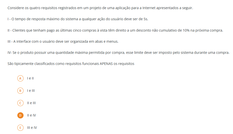 Considere os quatro requisitos registrados em um projeto de uma aplicação para a Internet apresentados a seguir. I - tempo de resposta máximo do sistema a qualquer ação do usuário deve ser de 5s. II - Clientes que tenham pago as últimas cinco compras à vista têm direito a um desconto não cumulativo de 10% na próxima compra. III - A interface com usuário deve ser organizada em abas e menus. IV- Se O produto possuir uma quantidade máxima permitida por compra, esse limite deve ser imposto pelo sistema durante uma compra. São tipicamente classificados como requisitos funcionais APENAS os requisitos A B I III II III D II IV E III e IV