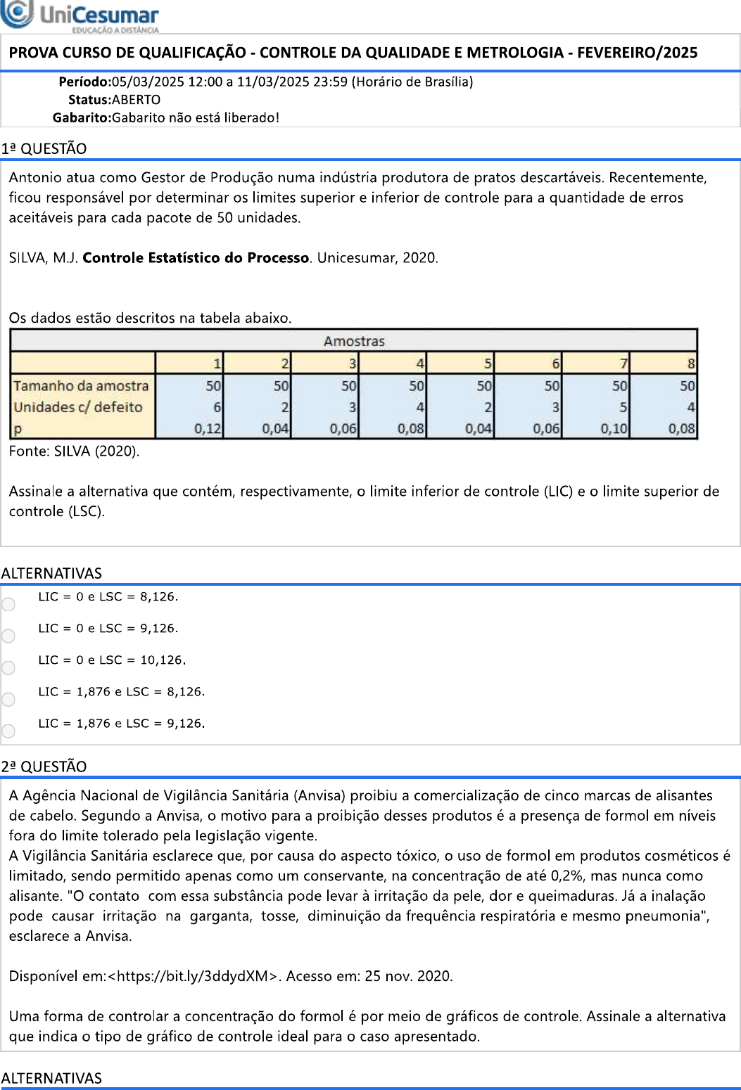 UniCesumar EDUCAÇÃO A DISTÂNCIA PROVA CURSO DE QUALIFICAÇÃO CONTROLE DA QUALIDADE E METROLOGIA FEVEREIRO/2025 Período:05/03/2025 12:00 a 11/03/2025 23:59 (Horário de Brasília) Status:ABERTO não está liberado! QUESTÃO Antonio atua como Gestor de Produção numa indústria produtora de pratos descartáveis. Recentemente, ficou responsável por determinar os limites superior e inferior de controle para a quantidade de erros aceitáveis para cada pacote de 50 unidades. SILVA, M.J. Controle Estatístico do Processo. Unicesumar, 2020. Os dados estão descritos na tabela abaixo. Amostras 1 2 3 4 5 6 7 8 Tamanho da amostra 50 50 50 50 50 50 50 50 Unidades c/ defeito 6 2 3 4 2 3 5 4 p 0,12 0,04 0,06 0,08 0,04 0,06 0,10 0,08 Fonte: SILVA (2020). Assinale a alternativa que contém, respectivamente, o limite inferior de controle (LIC) e o limite superior de controle (LSC). ALTERNATIVAS LIC = 0 e LSC = 8,126. LIC = 0 e LSC 9,126. LIC = 0 e LSC = 10,126. LIC = 1,876 e LSC = 8,126. LIC = 1,876 e LSC = 9,126. QUESTÃO A Agência Nacional de Vigilância Sanitária (Anvisa) proibiu a comercialização de cinco marcas de alisantes de cabelo. Segundo a Anvisa, o motivo para a proibição desses produtos é a presença de formol em níveis fora do limite tolerado pela legislação vigente. A Vigilância Sanitária esclarece que, por causa do aspecto tóxico, o uso de formol em produtos cosméticos é limitado, sendo permitido apenas como um conservante, na concentração de até 0,2%, mas nunca como alisante. "O contato com essa substância pode levar à irritação da pele, dor e queimaduras. Já a inalação pode causar irritação na garganta, tosse, diminuição da frequência respiratória e mesmo pneumonia", esclarece a Anvisa. Disponível em: Acesso em: 25 nov. 2020. Uma forma de controlar a concentração do formol é por meio de gráficos de controle. Assinale a alternativa que indica o tipo de gráfico de controle ideal para o caso apresentado. ALTERNATIVASGráfico de controle relativo. Gráfico de controle de variáveis. Gráfico de barras ou pizza. Gráfico de controle para atributos. Gráfico de controle para unidades. QUESTÃO Durante a fase de Medir do DMAIC, a coleta de dados é fundamental para diagnóstico do processo. As métricas e indicadores definidos ajudam a mapear as variações e identificar áreas que necessitam de melhorias. A precisão na coleta de dados impacta diretamente na qualidade da análise futura. Fonte: Elaborado pelo professor. Com base no contexto, assinale a alternativa que melhor representa o impacto da coleta de dados durante a fase de Medir no sucesso do DMAIC: ALTERNATIVAS A coleta precisa de dados imprecisos para testar hipóteses, aumentando a flexibilidade do processo. A coleta de dados define as métricas de desempenho, permitindo uma análise precisa e fundamentada. A coleta de dados na fase de Medir é irrelevante, pois não afeta a análise futura. A coleta de dados serve apenas para quantificar falhas, sem relação com a melhoria do processo. A coleta de dados deve ser realizada após a análise do processo, para garantir mais precisão. QUESTÃO Abaixo é demonstrado gráfico de controle de um processo. Gráfico de Controle 27 25 23 21 19 17 15 1 2 3 4 5 6 7 8 9 10 11 12 14 15 Dados Média LIE LSE Elaborado pelo professor, 2020. Com base no que está apresentado no gráfico, assinale a alternativa que expõe uma afirmação correta a respeito do processo. ALTERNATIVASo gráfico apresentado é conhecido como grafico de colunas, ao qual representa uma linha do tempo com a quantidade que representa ccada unidade de tempo. Considerando a quantidade de pontos apresentada, deve-se usar a combinação de gráficos x-S para avaliar o processo. Os pontos extrapolaram os limites de controle, o que torna o processo visivelmente problemático. processo em questão não deve ser considerado como controlado. limite inferior de controle para este gráfico é igual a 17. QUESTÃO Na figura abaixo são apresentados os gráficos referentes a três processos. SILVA. M. J da. Controle estatístico do processo. Unicesumar, 2020. Processo Processo II 290 290 285 285 280 280 275 275 270 270 265 265 260 260 255 255 250 250 1 2 3 4 5 6 7 8 9 10 11 12 13 14 15 1 2 3 4 5 6 7 8 9 10 11 12 13 14 15 Dados Média LIE LSE Dados Média LIE LSE Processo III 290 285 280 275 270 265 260 255 250 1 2 3 4 5 6 7 8 9 10 11 12 13 14 15 Dados Média LIE LSE A respeito dos três processos, a partir da interpretação dos gráficos, assinale a alternativa correta. ALTERNATIVAS o processo I está funcionando adequadamente. Os processos II e III estão fora de controle, enquanto o processo I está controlado. o processo I está fora de controle, enquanto os processos II e III estão controlados. Os processos I e III estão sob controle, enquanto o processo II está fora de controle. É visível um padrão no processo III, o que configura o mesmo como fora de controle. QUESTÃOUma análise de dados de um processo de fabricação de peças metálicas utilizou histogramas para monitorar a variação no peso final das peças. O histograma revelou uma concentração maior próxima ao limite inferior de especificação, acompanhada de baixa variabilidade nos dados, indicando uma potencial subutilização do material. Com base no uso do histograma e na análise dos dados, avalie as asserções a seguir e a relação proposta entre elas. I. O histograma é uma ferramenta essencial para identificar desvios em processos e auxilia na tomada de decisões relacionadas à conformidade dos produtos com os limites de especificação. PORQUE II. A análise visual de histogramas permite identificar não apenas a dispersão dos dados, mas também a presença de padrões de variação que indicam a predominância de causas comuns sobre causas especiais. A respeito dessas asserções, assinale a alternativa correta: ALTERNATIVAS As asserções I e II são proposições verdadeiras, e a II é uma justificativa