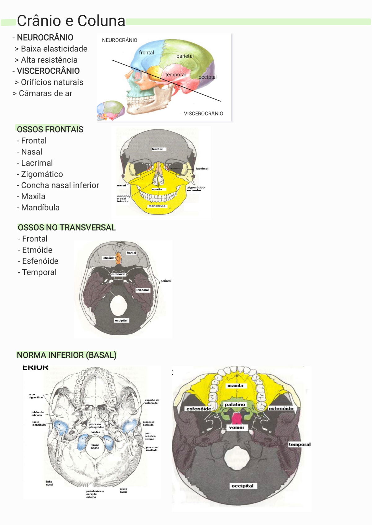 - NEUROCRANIO > Baixa elasticidade frontal parietal > Alta resistência - VISCEROCRÂNIO temporal occiptal > Orifícios naturais > Câmaras de ar VISCEROCRÂNIO ossos FRONTAIS - Frontal frontal - Nasal - Lacrimal lacrimal - Zigomático - Concha nasal inferior nasal zigomático maxila ou malar - Maxila concha nasal inferior mandibula - Mandíbula ossos NO TRANSVERSAL - Frontal - Etmóide frontal - Esfenóide - Temporal parietal temporal occipital NORMA INFERIOR (BASAL) ERIOR maxila arco espinha do esfenóide palatino esfenóide esf articular fossa processo mandibular processo pterigoídeo vomer condilo poro acústico externo forame processo magno mastóide linha nucal occipital crista protuberância nucalACIDENTES ANATÔMICOS -> Servem de passagem para os nervos cranianos e grandes vasos. 1- - Lamina Crivosa 2- Canal Optico 3- Fissura orbital superior 4- Forama Redondo 2 3 5- Forame Oval 4 6- Forame Espinhoso 7- Forama Lacerado 8- Meato Acústico Interno 8 9- Sela Turca 11 FORAME OVAL FORAME ESPINHOSO CANAL CARÓTICO (OBS: *FORAME LACERADO) FORAME JUGULAR CONDILOS OCIPTAIS MEATO ACÚSTICO EXTERNO FORAME CANAIS CONDILARES FORAME MAGNO CANAL DO NERVO HIPOGLOSSO (seta branca) processo fossa MANDÍBULA - Corpo da mandíbula: é em froma de ramo ferradura. - Ramo: uma parte mais retangular que tuberosidade masseterica forame corpo ascende após esse corpo. mentoniano -> Tem ramo esquerdo e direito. processo vista lateral fossa - A região da cabeça é justamente a parte que vai ter a articulação com o linha colo forame mandibular osso temporal, formando a articulação fossa temporo-temporal. fossa submandibularosso HIÓIDE corno menor corno maior Coluna Vertebral Vértebras Disco intervetebral imagem: vista anterior da coluna. - imagem: vista posterior da coluna, on vejo as pontas que são o processo espinh - imagem: vista lateral. Chamapara os forames intervertebrais acompanhando lateralmente a coluna e se localizam entre vértebras. Esses forames que vão permitir passagem dos nervos espinhais. Forames intervertebrais -> A coluna é formada por uma sequência de vértebras que são as estruturas ósseas q vão formar a coluna vertebral e pelas estruturas de fibrocartilagem que ficam interpost entre as vértebras, que são os discos intervertebrais. - SEGMENTAÇÃO DA COLUNA VERTEBRAL 1° segmento: é formado por 7 vértebras cervicais. 2° segmento: é formado por 12 vértebras COLUNA VERTEBRAL torácicas. Segmentação da coluna: 3° segmento: 5 vértebras lombares. segmento: 5 vértebras sacrais. 7 vértebras cervicais 5° segmento: 3 ou 4 vértebras coccígeas 12 vértebras torácicas 5 vértebras lombares 5 vértebras sacraisConcha nasal superior Lâmina perpendicular etmóide Processo zigomático da maxila Concha nasal inferior Vômer ANATOMIA - MARLANA Forame jugular Canal do nervo hipogloso Forame magno Forame óptico Forame redondo Forame oval Forame espinhoso Meato acústico interno Forame lacerado Forame jugular canal do n. hipoglosoANATUMIA - Forame oval Forame lacerado Forame espinhoso Processo estilóide Canal carótico Forame jugular Forame Fossa mandibula Processo mastóide Forame condilar Fossa incisiva Palato duro Forames palatinos maior e menor Espinha nasal posterior Coâno Vômer Lâminas lateral e medial do processo Forame oval pterigóide Forame espinhoso Fossa mandibular Forame estilomastóideo Forame lacerado Canal carótico Côndilo occipital Forame jugular Tubérculo faríngeoNasal. Frontal Frontal; Superior Zigomático (malar); Frontal; Lacrimal; Parietal; Nasal; Occipital. Concha nasal inferior; Maxila; Inferior Mandíbula. Maxila; Palatino; Lateral Esfenoide; Frontal; Etmoide; Parietal; Vômer; Esfenoide; Temporal; Zigomático; Occipital. Temporal; Occipital; Mandíbula; Maxila; Lacrimal;