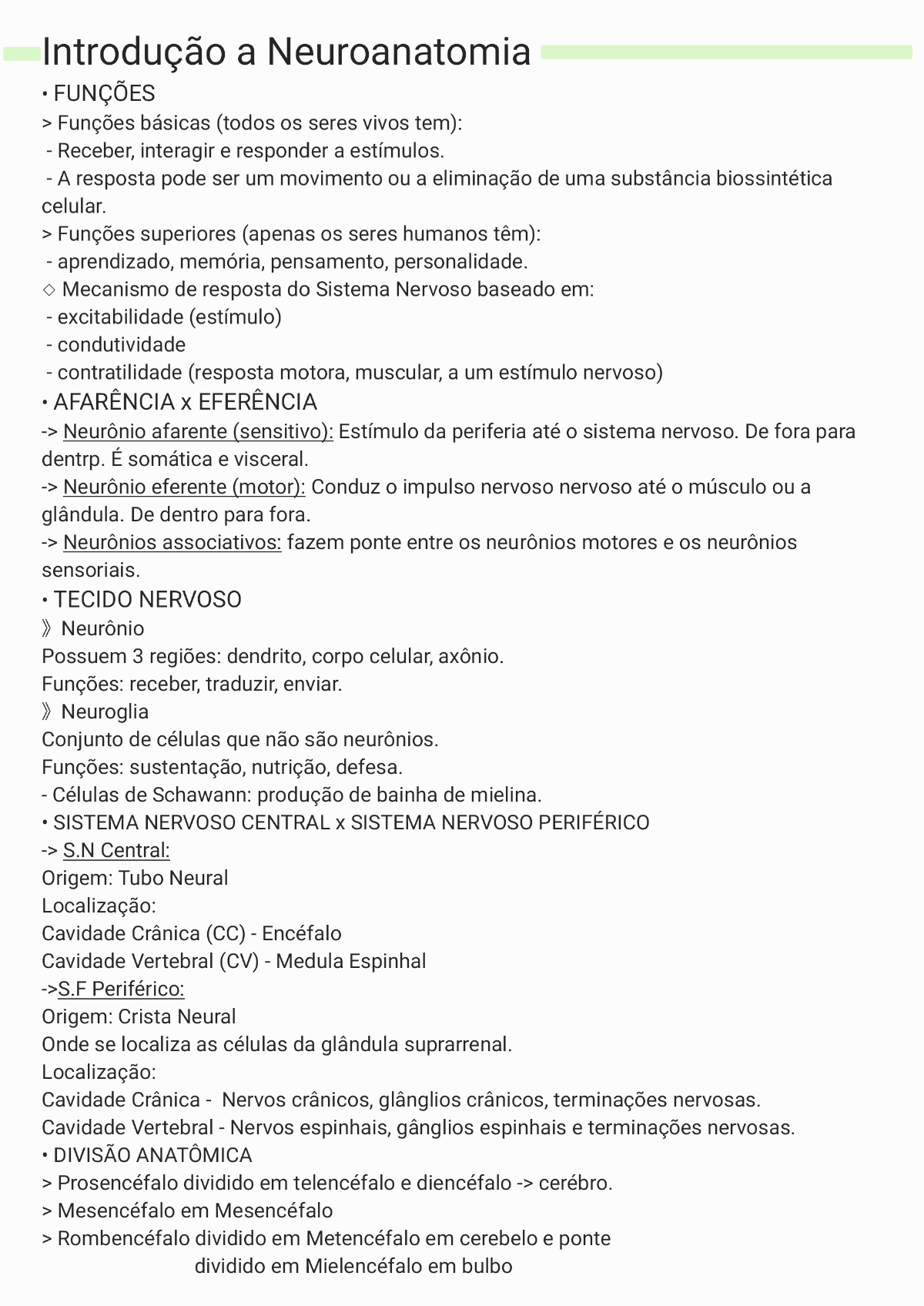 Introdução a Neuroanatomia FUNÇÕES > Funções básicas (todos os seres vivos - Receber, interagir e responder a estímulos. - A resposta pode ser um movimento ou a eliminação de uma substância biossintética celular. > Funções superiores (apenas os seres humanos têm): - aprendizado, memória, pensamento, personalidade. Mecanismo de resposta do Sistema Nervoso baseado em: - excitabilidade (estímulo) - condutividade - contratilidade (resposta motora, muscular, a um estímulo nervoso) AFARÊNCIA X EFERÊNCIA -> Neurônio afarente (sensitivo): Estímulo da periferia até o sistema nervoso. De fora para dentrp. É somática e visceral. -> Neurônio eferente (motor): Conduz o impulso nervoso nervoso até o músculo ou a glândula. De dentro para fora. -> Neurônios associativos: fazem ponte entre os neurônios motores e os neurônios sensoriais. TECIDO NERVOSO Neurônio Possuem 3 regiões: dendrito, corpo celular, axônio. Funções: receber, traduzir, enviar. Neuroglia Conjunto de células que não são neurônios. Funções: sustentação, nutrição, defesa. - Células de Schawann: produção de bainha de mielina. SISTEMA NERVOSO CENTRAL X SISTEMA NERVOSO PERIFÉRICO -> S.N Central: Origem: Tubo Neural Localização: Cavidade Crânica (CC) Encéfalo Cavidade Vertebral (CV) Medula Espinhal ->S.F Periférico: Origem: Crista Neural Onde se localiza as células da glândula suprarrenal. Localização: Cavidade Crânica - Nervos crânicos, glânglios crânicos, terminações nervosas. Cavidade Vertebral - Nervos espinhais, gânglios espinhais e terminações nervosas. DIVISÃO ANATÔMICA > Prosencéfalo dividido em telencéfalo e diencéfalo -> cerébro. > Mesencéfalo em Mesencéfalo > Rombencéfalo dividido em Metencéfalo em cerebelo e ponte dividido em Mielencéfalo em bulboTELENCÉFALO CÉREBRO ENCÉFALO DIENCÉFALO CENTRAL MESENCÉFALO TRONCO ENCEFÁLICO PONTE BULBO CEREBELO MEDULA ESPINHAL Prosencephalon Mesencephalon Rhombencephalon TERMINAÇÕES NERVOSAS PERIFÉRICO Crânicos Espinhais NERVOS 28 days S.N.C. TELENCÉFALO DIENCÉFALO MESENCÉFALO PONTE BULBO CEREBELO MEDULA ESPINHAL DESENVOLVIMENTO DO S.N.P. Neural crest Migração de Neurônios da Crista Neural Ganglioblasts Sympathetic anlage Melanoblasts Adrenal anlage Myenteric plexus anlageSUBSTÂNCIA BRANCA X SUBSTÂNCIA CINZA >> Branca: predominam corpos celulares, dendritos e axônios com mielina. Nervos } SNP Trato SNC Lemnisco Cinzenta: predominam axônios sem mielina. Núcleo SNC Córtex Gânglio} SNP DIVISÃO SEGMENTAR DO SISTEMA NERVOSO CENTRAL - Sistema Nervoso Segmentar: emite neuronios. Medula espinhal - nervos espinhais. Tronco encefálico nervos crânicos. - Sistema Nervoso Supra Segmentar: não emite nervos. Cerebelo Cérebro - Diencefálico (nervo óptivo) e Telencefálico (nervo oufatório) DIVISÃO FUNCIONAL DO SISTEMA NERVOSO - Sistema Nervoso Somático: controla a vida de relação do ser vivo com o meio externo. Inerva: pele, musc. estriado esq. e articulações. Divido em aferente e eferente. - Sistema Nervoso Visceral: controla as relações internas do ser vivo. Inerva: vasos sanguíneos, visceras, glândulas, musculo estriado cardiaco. Dividido em afarente e eferente, onde o aferente tambem pode ser dividido em Sistema Nervosa Autonomo, que se divide em simpático e parasimpático. Retira o corpo de homeostase Colocar o corpo em homeostase. - Noradrenalina e adrenalina. - Acetilcolina VIAS - Via Sensorial: começa no ambiente e termina no SNC. A ligação entre neurônios são os circuitos neuronais. Via Motora: começa no SNC e termina no ambiente. SNC->neurônio->efetor->ambiente (resposta) DIFERENCIAÇÃO E ORGANIZAÇÃO DOS NEURÔNIOS >> Proliferação neuronal >> Migração neuronal (SNC se forma na perferia e migra para a porção interna no decorrer do desenvolvimento) >> Diferenciação neuronal >> Sinaptogênese e formação de circuitos >> Mielinização (área pré-frontal é a última a se 30 anos - maioridade cerebral) >> Eliminação programada (neuronios/sinapses)