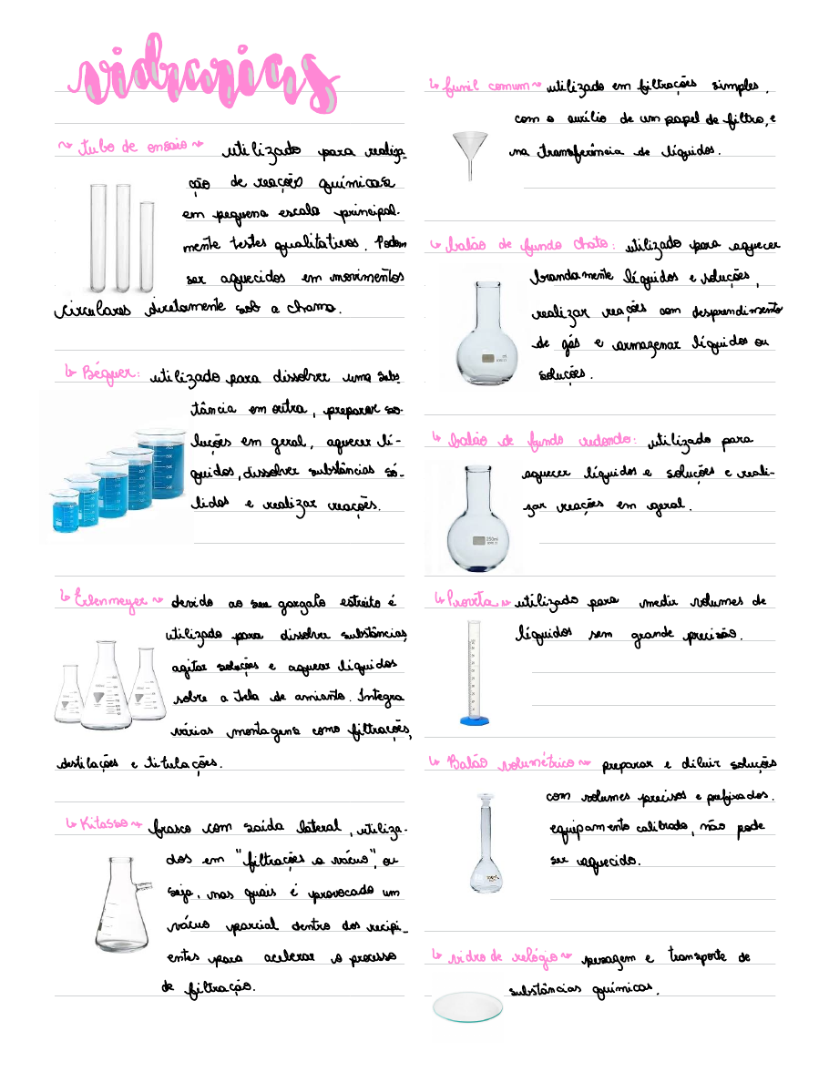 viris ↳ funil comum e utilizado em filtrações simples, com o auxílio de um papel de filtro,e ~ tubo de ensaios utilizado para realiza na transferência de líquidos. ção de reações químicas em pequena escala principal. mente testes qualitativos . Poder · balão de fundo chato : utilizado para aquecer ser aquecidos em movimentos brandamente líquidos e soluções, circulares diretamente sob a charso. realizar reações com desprendimento de gás e armazenar líquidos o ↳ Béquer: utilizado para dissolver uma subs soluções . I tância em outra , preparar so lucões em geral , aquerer li- ↳ balão de fundo redondo : utilizado para I quidos,dissolver substâncias só aquecer líquidos e soluções e realiz / lidas e realizar reações. zar reações em geral. I ↳ Erbnmeyer vo devido ao ser gargalo estreito é Provetais utilizado para medir volumes de utilizado para dissolver substâncias, líquidos sem grande precisão. agitar soluções e aquear liquidos sobre a tela de amianto. Integra várias montagens como filtrações, destilações e titulações. L Balão volumétricos preparar e diluir soluções com volumes precisos e prefixados. ↳Kitassos frasco com saida Lateral , utiliza equipamento calibrado, não pode dos em "filtrações a vácuo." ou ser aquecido. seja , nas quais é provocado um vácuo parcial dentro dos recipi entes para acelerar o processo ↳ vidro de relógios pesagem e transporte de de filtração. substâncias químicas, ↳Pipeta graduado o utilizada para medida de la Bastão de vidro a utilizado para agitação de volumes variáveis de liquidos Soluções e de liquidos, na dissolução com boa precisão dentro de de sólidos,no auxílio de transferên uma determinada escala. cia Equipamento calibrado. Não agrecer. ↳ Placa de petri vo utilizada para seragem de L Pipeta volumétrica s medir com grande precisão substâncias. desenvolvimento de um volume fixo de líquidos . culturou e fungos. Calibrado. Não aquecer. ↳ Tubo de Thiele s utilizado na determinação I de ponto de fusão das substan ↳ Buretae medir volumes precisos de li- cias quidos, permite o escoamento con- trolado através da torneira. Utili zado em titulações . Calibrado, ↳ dessecador es guardar substâncias em atmosfera não aquecer. com baixa umidade ↳ Funil de Separação/decantação s separar liqui dos imissiveis e na extração liqui do - líquido. Funil de bromo. ↳ Funil de Büchner e utilizado em filtrações a vácuo junto ao Ritasso. L condensador e condensar os vapores produzidos no processo de destilação ou aque. L cadinho n calcinações de substâncias, no aque cimento sob refluxo. aimento e fusão de Sólidos a altas temperaturas. ↳ cápsula : evaporação de liquidos . Pode ser S aquecido diretamente nachama. ↳ almofariz/pistilo utilizado para trituração 3 pinça metálica es segurar objetos gaventes. e pulverização de sólidos. ↳ tela de amiantos utilizado para distribuir pisseta/frasco lavador e lavagem de diversos uniforme o calor recebido da Cha materiais, normalmente com água desti ma lada or alcool 70%. 3 Argola ou and utilizado parasuporte de femil de vidro. ↳ espátula transporte de Substâncias sólidas. ↳ garra metálicas utilizado para fixar os diver sos equipamentos ↳ tromba de vácuo e utilizado para reduzir a pressão no interior de um frasco. ↳ pinça de madeira es utilizado para segurar os tubos de ensaio. ↳ pipeta de borracha encher pipeta por sucção ↳ agitador magnético e para agitar soluções e I ↳ suporte para tubos de ensaio e s segurar tubo líquidos. Podem ser só de agitação e/ou com aquecimento. ↳ tripé s utilizado para dar sustentação à tela l manta aquecedora es para aguncimento de liqui. de amianto de ao triângulo de por dos inflamáveis contidos em um balão clana de fundo redondo. ↳ suporte universal es sustentação aos materiais balança e para pesagem, extremamente precisa. do lab. Boas práticas laboratoriais Conceito: As Boas Práticas de Laboratório (BPL) formam um conjunto de princípios que asseguram a qualidade e a confiabilidade de um laboratório no uso seguro de produtos químicos em relação à saúde humana, à vida vegetal, animal e ao meio ambiente. As BPL têm por objetivo a organização dos processos e das condições sob as quais os estudos de laboratório são planejados, executados, monitorados, registrados e relatado Princípios � Divulgar e conscientizar os usuários do laboratório sobre a necessidade da utilização de BPL � Estabelecer e manter um padrão de segurança � Reduzir a quantidade de resíduos químicos � Dispor os resíduos gerados de forma segura SINAIS DE ADVERTÊNCIA � Como no trânsito, é comum a utilização de sinais de advertência em laboratórios e rótulos de reagentes para informar aos usuários sobre a natureza do produto utilizado. O conhecimento desses sinais é desejável (e necessário) para as BPL. � Garantir prestação de serviço de forma segura: � Certifique-se de estar utilizando os equipamentos de proteção adequados: individual (EPI) e coletivo (EPC). Lembre-se que o uso desses equipamentos é essencial para garantir sua segurança durante o trabalho experimental. O EPI básico de um laboratório de ciências é constituído por avental (bata) de mangas compridas, óculos de proteção e luvas de borracha. � Evite utilizar os óculos nos pescoço ou sobre a cabeça, eles devem proteger os olhos. Cabelos compridos devem estar sempre presos com elástico ou prendedores. � Os usuários devem calçar sapatos fechados e utilizar calças compridas. � Nunca ingira ou cheire diretamente uma substância que será utilizada na experiência. Nunca prove ou manuseie substâncias desconhecidas, sob risco de envenenamento. � Experiências não são brincadeiras! Portanto, mantenha uma postura serena para evitar acidentes. Não aplicar lentes de contato nem maquiagem dentro do laboratório � Não colocar a