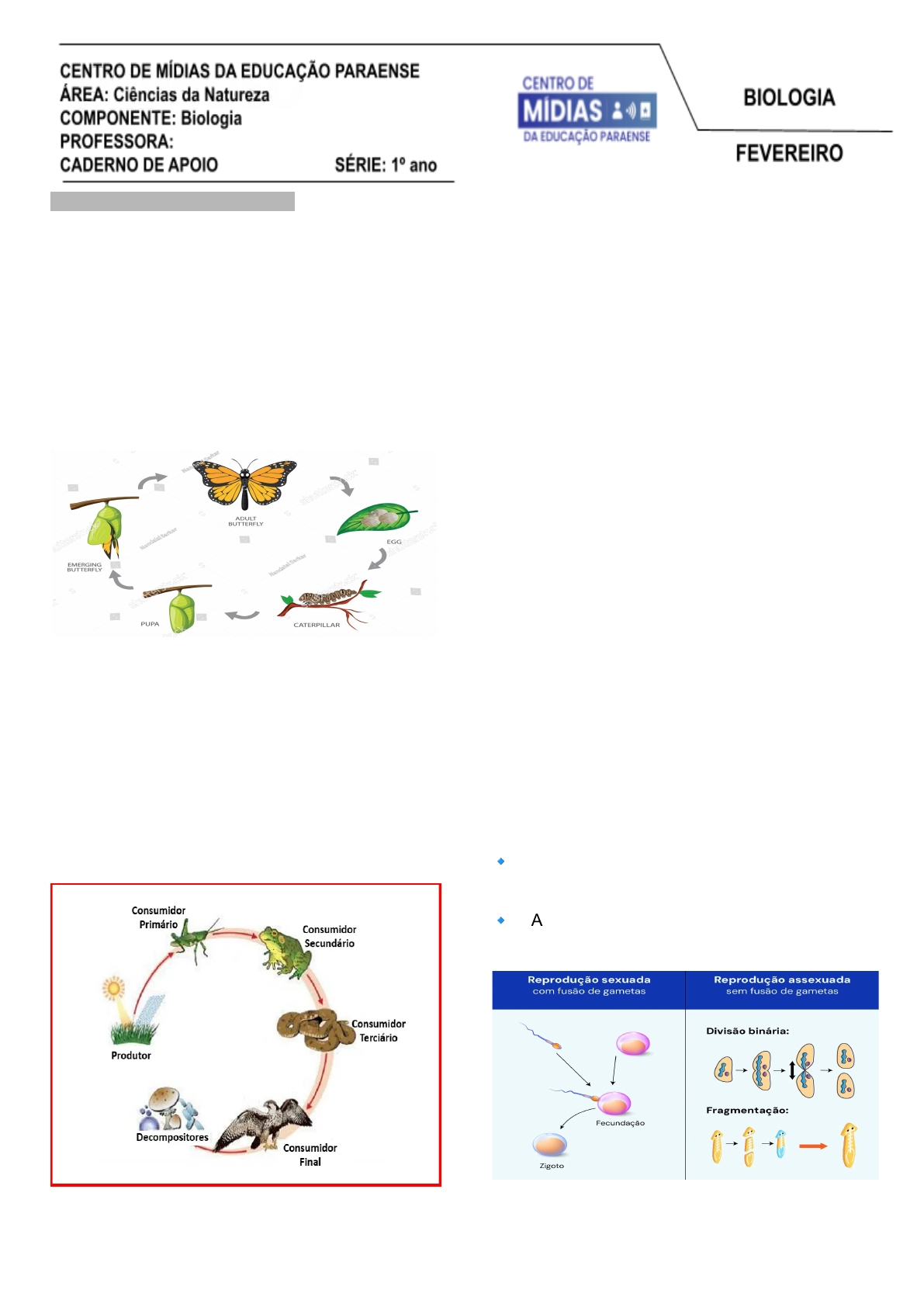 AULA 01 – Período: 27 a 31/01 Objetivos de aprendizagem: Relembrar as características gerais de um ser vivo, conseguindo diferenciá-lo de uma estrutura não viva. Diferenças: os seres vivos possuem propriedades que os distinguem de elementos inanimados. Essas propriedades incluem organização celular, metabolismo, crescimento, reprodução e resposta a estímulos ambientais. Ciclo da Vida: definição: O ciclo da vida representa as fases que um organismo atravessa desde seu nascimento até a reprodução e morte. Exemplo clássico é o ciclo da borboleta, que passa por quatro estágios: ovo, larva (lagarta), pupa (crisálida) e adulto. O tempo de cada fase pode variar conforme a espécie e o ambiente. Importante: Todos os organismos passam por ciclos de vida distintos, influenciados por fatores genéticos e ambientais. Os organismos interagem no ambiente de diferentes maneiras, formando relações ecológicas intraespecíficas (entre seres da mesma espécie) e interespecíficas (entre espécies diferentes). Cadeia Alimentar e teia alimentar Níveis Tróficos: 1⃣ Produtores: Seres autotróficos, como plantas e algas, que produzem seu próprio alimento. 2⃣ Consumidores: organismos que se alimentam direta ou indiretamente dos produtores. 3⃣ Decompositores: Fungos e bactérias que reciclam matéria orgânica. Tipos de consumidores: 1⃣ Consumidores primários: Alimentam-se dos produtores (herbívoros). 2⃣ Consumidores secundários: Alimentam-se dos primários (carnívoros). 3⃣ Consumidores terciários: Alimentam-se dos secundários (predadores de topo). Exemplo: O lobo-guará é um consumidor terciário que se alimenta de pequenos mamíferos e frutas. Decompositores e Reciclagem da Matéria: os decompositores (fungos e bactérias) desempenham um papel fundamental no ciclo da vida. Eles decompõem matéria orgânica, transformando-a em nutrientes que retornam ao solo. Esses organismos garantem a fertilidade do solo e a continuidade dos ciclos ecológicos. Reprodução: a reprodução garante a continuidade da vida e pode ocorrer de duas formas: 🔹 Sexuada: Envolve gametas (óvulo e espermatozóide), promovendo variabilidade genética. 🔹 Assexuada: Um único organismo gera descendentes idênticos, sem troca de material genético. Conclusão: Seres Vivos x Matéria Bruta 1 A principal diferença entre um ser vivo e uma estrutura inanimada é a capacidade de: ✅ Reproduzir-se; ✅ Metabolizar nutrientes; ✅ Responder a estímulos; ✅ Crescer e se desenvolver. Os seres vivos seguem padrões biológicos organizados, enquanto a matéria bruta não possui essas características. AULA 02 – Período: 27 a 31/01 Objetivos de aprendizagem: Relembrar os diferentes níveis de organização dos seres vivos, desde o mais simples ao mais complexo. A vida apresenta diferentes níveis de organização, que vão do átomo (menor unidade da matéria) até a biosfera (conjunto de todos os ecossistemas). Os principais níveis de organização da vida são: ✅ Átomo → Menor unidade da matéria; ✅ Molécula → Conjunto de átomos organizados; ✅ Organela → Estruturas especializadas dentro das células; ✅ Célula → Unidade fundamental dos seres vivos; ✅ Tecido → Grupo de células especializadas; ✅ Órgão → Estrutura composta por tecidos; ✅ Sistema → Conjunto de órgãos com função específica; ✅ Organismo → Ser vivo completo; ✅ População → Conjunto de indivíduos da mesma espécie; ✅ Comunidade → Conjunto de diferentes populações; ✅ Ecossistema → Interação entre os seres vivos e o meio ambiente; ✅ Biosfera → Conjunto de todos os ecossistemas da Terra. Conclusão: ✅ Os níveis de organização biológica vão do átomo à biosfera. ✅ Cada organismo ocupa um nicho ecológico dentro do ecossistema. ✅ A interação entre os seres vivos garante o equilíbrio ambiental. AULA 03 – Período: 03 a 07/02 Tema: A composição química dos seres vivos. Objetivo: Compreender a importância dos elementos químicos na constituição dos organismos vivos. → Os seres vivos são compostos por diversos elementos químicos, mas 4 deles representam 96,2% do peso corporal humano: Carbono (C); Hidrogênio (H); Oxigênio (O); Nitrogênio (N). Esses elementos são conhecidos pelo acrônimo CHON. 📖 Na matéria viva, certos tipos de elementos químicos estão sempre presentes: carbono (C), hidrogênio (H), oxigênio (O), nitrogênio (N), fósforo (P) e enxofre (S). Sem esses elementos, a vida como conhecemos não seria possível! 📖 Moléculas orgânicas são compostas por milhões de átomos unidos por ligações químicas. 📌 O DNA contém o código genético dos seres vivos, e o RNA auxilia na produção de proteínas. 📖 As proteínas são compostas por aminoácidos e desempenham funções estruturais, enzimáticas, de transporte, defesa e regulação no organismo, e são fundamentais para várias funções biológicas: Enzimas: Aceleram reações químicas; Anticorpos: Defendem o organismo contra doenças; Hemoglobina: Transporta O2 no sangue. 📖 Carboidratos são compostos de carbono, hidrogênio e oxigênio e representam a principal fonte de energia para os organismos. 2 📌 Carboidratos: Monossacarídeos: Açúcares simples, como glicose e frutose. Polissacarídeos: Carboidratos complexos, como amido e celulose. 📖 Lipídios são compostos orgânicos insolúveis em água, formados por ácidos graxos e glicerol. 📌 Funções dos lipídios: Reserva de energia – Armazenam energia a longo prazo. ✅ Isolamento térmico – Protegem contra variações de temperatura. ✅ Estrutural – Fazem parte das membranas celulares. 📌 Tipos de colesterol: 🔹 HDL (colesterol bom) – Ajuda a remover gordura do sangue. 🔹 LDL (colesterol ruim) – Pode se acumular nas artérias e causar doenças cardiovasculares. 💡 Importante: O consumo equilibrado de lipídios é essencial para a saúde. 📖 Os seres vivos são compostos por milhare