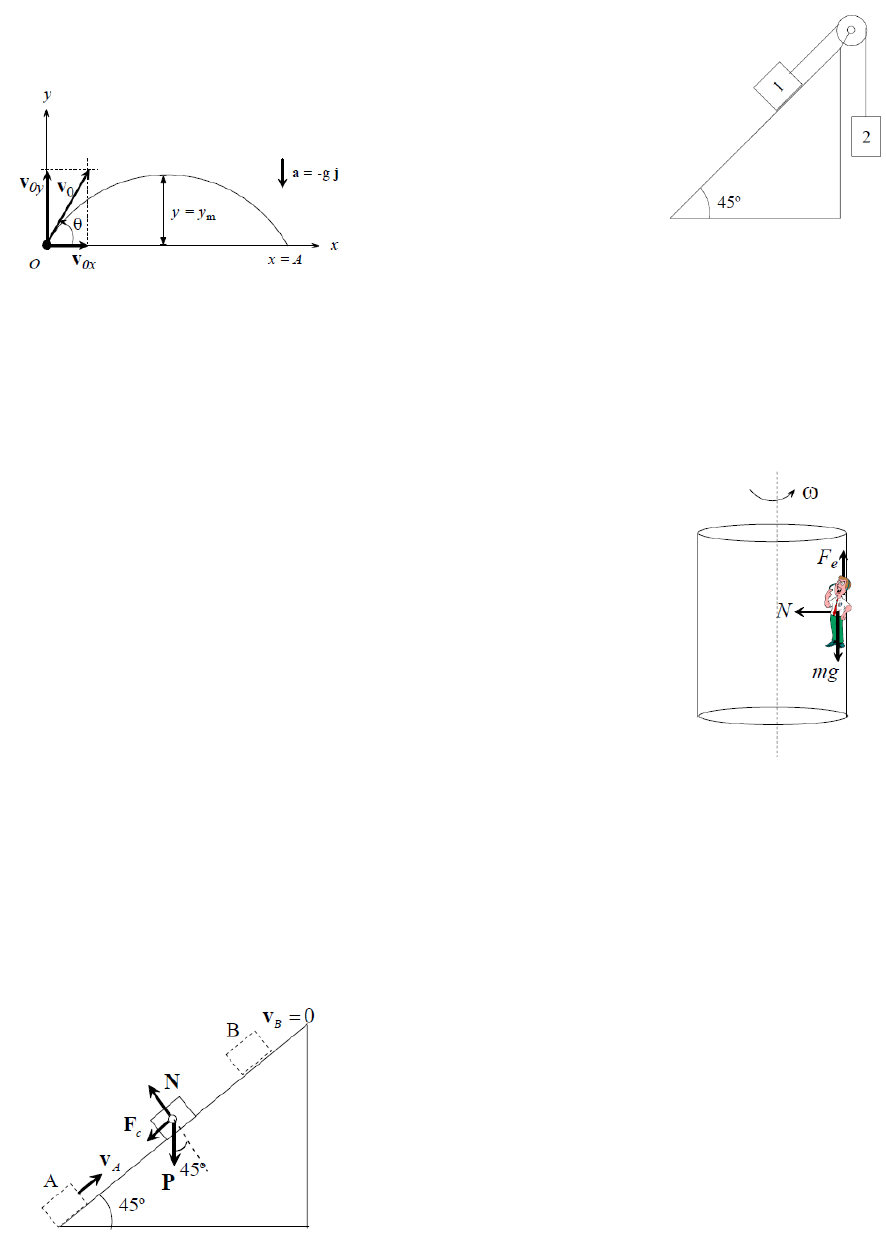 Física I – Prof. Edson – Lista 1 1) (Problema 1 Cap 3) Um projétil é disparado com velocidade de 600 m/s, num ângulo de 60° com a horizontal. Calcular: (a) o alcance horizontal (31,8 km), (b) a altura máxima (13.775,5 m), (c) a velocidade (225,6 m/s) e a altura 30s após o disparo (11,2 km), (d) a velocidade e o tempo decorrido quando o projétil está a 10 km de altura (407 m/s, 25 s e 81 s). 2) (Problema 5 Cap 3) Calcular a velocidade angular de um disco que gira com movimento uniforme de 13,2 rad a cada 6s. Calcular, também, o período e a freqüência do movimento. (ω = 2,2 rad/s; T = 2,9s; f = 0,34s−1). 3) (Problema 9 Cap 3) A velocidade angular de um volante aumenta uniformemente de 20 rad/s para 30rad/s em 5 s. Calcular a aceleração angular e o ângulo total que o volante gira nesse intervalo de tempo. (2 rad/s2; 125 rad). 4) (Problema 10 Cap 3) Um ponto descreve uma circunferência de acordo com a lei s(t) = t3 + 2t2, onde s é medido em metros ao longo da circunferência e t, em segundos. Se a aceleração total do ponto é 16(2)1/2 m/s2, quando t = 2 s, calcular o raio R da circunferência. (25m). 5) (Problema 7 Cap 5) Um bloco é lançado para cima, com velocidade de 5 m/s, sobre uma rampa de 45° de inclinação. O coeficiente de atrito cinético entre o bloco e a rampa é 0,3. (a) Qual é a distância máxima atingida pelo bloco na rampa? (Δx = 1,39 m). (b) Quanto tempo leva o bloco para subir a rampa? (ts = 0,56 s) (c) Quanto tempo leva para descer a rampa? (td = 0,76 s) (d) Com que velocidade final chega ao pé da rampa? (v = 3,69 m/s). 6) (Problema 15 Cap 5) No sistema, o bloco 1 tem massa de 10 kg e seu coeficiente de atrito estático com o plano inclinado é 0,5. Entre que valores mínimo e máximo pode variar a massa m2 para que o sistema permaneça em equilíbrio? (m2min = 3,54 kg; m2max = 10, 6 kg). 7) (Problema 16 Cap 5) 0 coeficiente de atrito estático entre as roupas de uma pessoa e a parede cilíndrica de uma centrífuga de parque de diversões de 2 m de raio é 0,5. Qual é a velocidade angular mínima (em rotações por minuto) da centrífuga para que a pessoa permaneça coloda à parede, suspensa acima do chão? (29,9 rpm). 8) (Problema 17 Cap 5) Uma curva semicircular horizontal numa estrada tem 30 m de raio. Se o coeficiente de atrito estático entre os pneus e o asfalto é 0,6, qual é a velocidade máxima que um carro pode fazer a curva sem derrapar? (47,8.km/h)