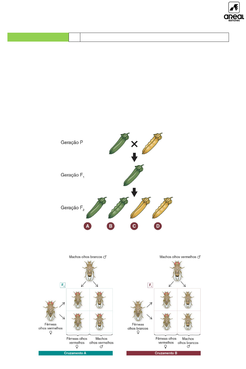 BIOFOCO 12 QUESTÕES DE AULA © Areal Editores 1 Os trabalhos de Gregor Mendel, na segunda metade do século XIX, sobre a hibridização de plantas, constituem um dos grandes contributos para a Genética, ciência que estuda a hereditariedade. Mendel resolveu cruzar ervilheiras, estudando o modo de transmissão de sete características de Pisum sativum. Inicialmente, analisou o modo de transmissão de cada característica isoladamente e, em seguida, debruçou- se sobre a transmissão simultânea de duas características. A Figura 1 representa um dos cruzamentos realizados por Mendel entre linhas puras. Mais tarde, Thomas Morgan foi o principal responsável pela fusão entre a genética mendeliana e a teoria cromossómica da hereditariedade, ao utilizar como material biológico a mosca-da-fruta, Drosophila melanogaster. Os trabalhos de Morgan permitiram compreender que os fatores hereditários de Mendel se encontram nos cromossomas. A Figura 2 representa um dos cruzamentos realizados por Morgan entre linhas puras. QUESTÃO DE AULA 4 Os trabalhos de Mendel e Morgan Figura 1 – Representação esquemática da transmissão genética da cor e da forma da vagem de Pisum sativum: cruzamento entre uma ervilheira de vagens lisas (L) e verdes (V) e outra de vagens rugosas (l) e amarelas (v). Figura 2 – Representação esquemática da transmissão genética da cor dos olhos de Drosophila melanogaster. BIOFOCO 12 QUESTÕES DE AULA © Areal Editores 2 1. O cruzamento da Figura 1 é um caso de (A) monoibridismo, com segregação independente dos alelos. (B) diibridismo, com segregação independente dos alelos. (C) diibridismo, com segregação fatorial dos alelos. (D) monoibridismo, com segregação fatorial dos alelos. 2. LlVv corresponde ao _______ dos indivíduos da _______ do cruzamento da Figura 1. (A) genótipo ... geração P (B) fenótipo ... geração P (C) genótipo ... geração F1 (D) fenótipo ... geração F1 3. Os organismos representados pela letra D no cruzamento da Figura 1 são (A) homozigóticos dominantes para a cor e para a forma da vagem. (B) homozigóticos recessivos para a cor e para a forma da vagem. (C) heterozigóticos para a forma da vagem e homozigóticos dominantes para a cor da vagem. (D) heterozigóticos para a cor da vagem e homozigóticos recessivos para a forma da vagem. 4. Refira, justificando através de um xadrez mendeliano, a proporção fenotípica da geração F2 da Figura 1. 5. Selecione, de entre as afirmações relativas à análise da Figura 2, as três afirmações corretas. Considere as designações W+ e W para as características dominante e recessiva, respetivamente. I. Ao contrário das fêmeas, os machos de Drosophila melanogaster apresentam a extremidade do abdómen negra. II. As fêmeas da geração F2 do cruzamento B podem ser Xw+Xw+ ou Xw+Xw. III. O genótipo dos machos da geração parental do cruzamento A é XwY. IV. O progenitor macho da geração parental do cruzamento B pode produzir gâmetas Xw+ ou Y. V. Os progenitores de ambos os cruzamentos são heterozigóticos. 6. Os resultados da geração F1, apresentados no _______ da Figura 2, estão de acordo com os previstos por Mendel, uma vez que _______. (A) cruzamento A ... toda a descendência manifesta a característica dominante (B) cruzamento A ... toda a descendência manifesta a característica recessiva (C) cruzamento B ... apenas os machos manifestam a característica recessiva (D) cruzamento B ... apenas as fêmeas manifestam a característica dominante BIOFOCO 12 QUESTÕES DE AULA © Areal Editores 3 7. A partir do cruzamento entre dois indivíduos da geração F1 do cruzamento A, é possível obter a seguinte descendência (A) machos de olhos vermelhos e fêmeas de olhos vermelhos ou brancos. (B) machos de olhos brancos e fêmeas de olhos vermelhos ou brancos. (C) machos de olhos vermelhos ou brancos e fêmeas de olhos brancos. (D) machos de olhos vermelhos ou brancos e fêmeas de olhos vermelhos. 8. As afirmações seguintes dizem respeito às características anteriormente analisadas. Selecione a alternativa que as avalia corretamente. I. A cor e a forma da vagem de Pisum sativum são características heterossómicas. II. A realização do cruzamento recíproco permitiu concluir que o gene responsável pela cor dos olhos de Drosophila melanogaster estaria localizado no cromossoma X. III. Os genes dos cromossomas X das fêmeas de Drosophila melanogaster expressam-se de forma idêntica aos genes localizados nos autossomas. (A) III é verdadeira; I e II são falsas. (B) II é verdadeira; I e III são falsas. (C) II e III são verdadeiras; I é falsa. (D) I e III são verdadeiras; II é falsa. 9. Suponha que se encontrava uma fêmea de Drosophila melanogaster de olhos vermelhos, depois da realização dos cruzamentos A e B. Explique como deveria proceder-se para se identificar o seu genótipo. 10. Em seguida, Morgan estudou a transmissão genética de duas características, a cor do corpo e o tamanho das asas, de Drosophila melanogaster: • C – alelo responsável pelo corpo cinzento; • c – alelo responsável pelo corpo negro; • L – alelo responsável pelas asas longas; • l – alelo responsável pelas asas vestigiais. Para isso, realizou o cruzamento entre duas moscas heterozigóticas para as duas características, tendo constatado que a descendência se verificava na seguinte proporção: ¾ moscas de corpo cinzento e asas longas e ¼ de moscas de corpo negro e asas vestigiais. 10.1. Os genes que determinam a cor do corpo e o tamanho das asas (A) estão localizados em cromossomas diferentes. (B) encontram-se ligados fatorialmente. (C) sofreram recombinações durante a meiose. (D) são segregados independentemente. BIOFOCO 12 QUESTÕES DE AULA © Areal Editores 4 10.2. Os indivíduos da geração parental podem produzir os seguintes gâmetas (A) CL, Cl, cL ou cl. (B) CL ou Cl. (C) CL ou cl. (D) cL ou cl. 10.3. Quando os alelos estão localizados no mesmo cromossoma