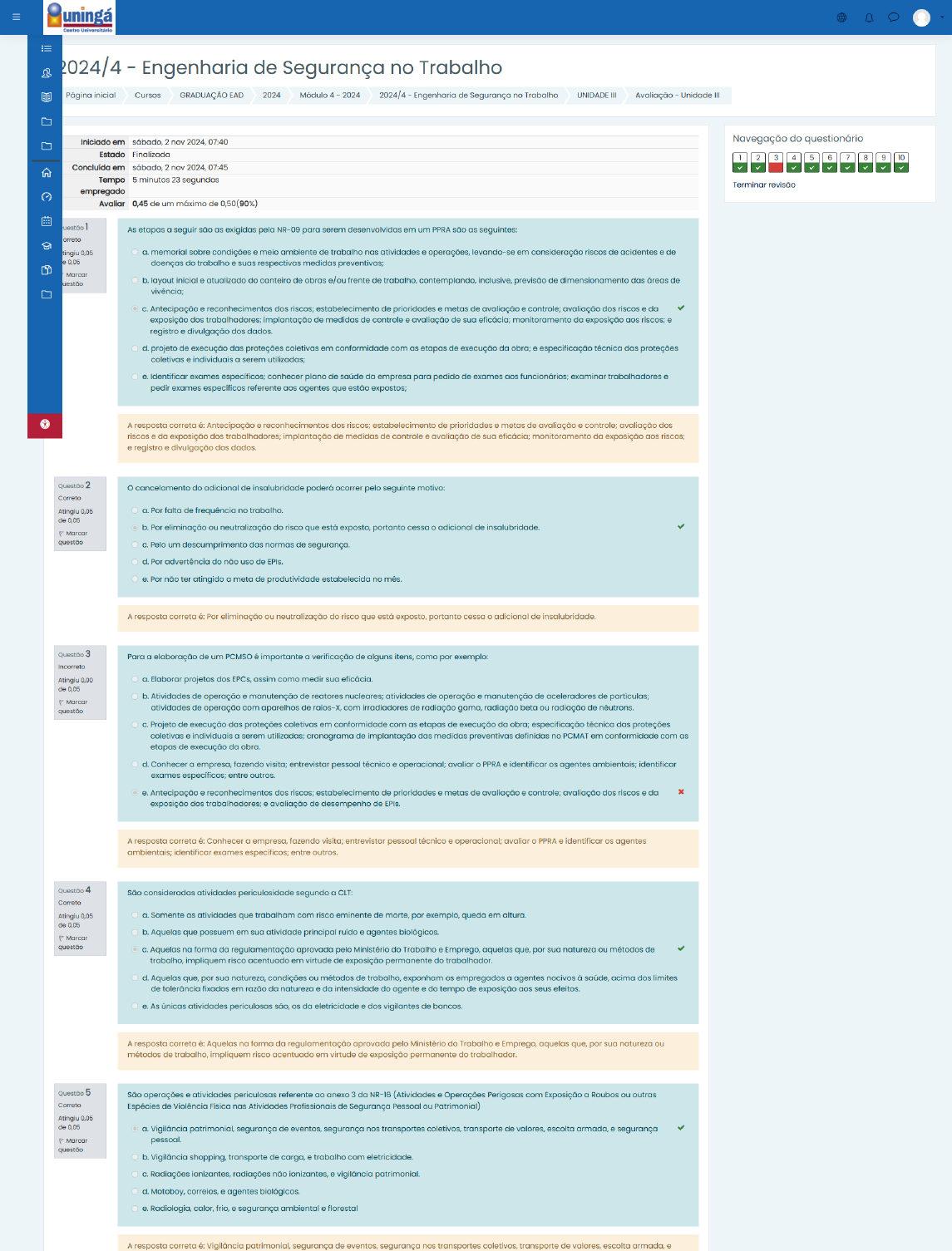 2024/4 Engenharia de Segurança no Trabalho Página inicial Cursos GRADUAÇÃO EAD 2024 Módulo 4 2024/4 Engenharia de Segurança no Trabalho UNIDADE III Avaliação Unidade III Iniciado em sábado nov 07:40 Navegação do questionário Estado 2 3 4 5 6 7 8 9 10 em sábado, 2 nov 2024 07:45 Tempo 5 minutos 23 segundos Terminar revisão empregado Avaliar 0,45 de um de 0,50(90%) As etapas a seguir são as exigidas pela NR-09 para serem desenvolvidas em um PPRA são as seguintes: lorreto memorial sobre condições e meio ambiente de trabalho nas atividades e operações levando-se em consideração riscos de acidentes e de doenças do trabalho e suas respectivas medidas preventivas; Marcar uestão b. layout inicial e atualizado do canteiro de obras e/ou frente de trabalho, contemplando, inclusive, previsão de dimensionamento das áreas de Antecipação e reconhecimentos dos de prioridades e metas de avaliação e controle; avaliação dos riscos e da exposição dos implantação de medidas de controle e avaliação de sua monitoramento do exposição riscos; e registro e divulgação dos d. projeto de execução das proteções coletivas em conformidade com as etapas de execução da obra; e especificação técnica das proteções coletivas e individuais a serem utilizadas: e. Identificar exames específicos; conhecer plano de saúde empresa para pedido de exames examinar trabalhadores e pedir exames específicos referente aos agentes que estão expostos; A resposto correta é: Antecipação e reconhecimentos dos riscos; estabelecimento de prioridades e metas de avaliação e controle; avaliação dos riscos e da exposição dos implantação de medidas de controle e avaliação de sua monitoramento do exposição riscos; e registro e divulgação dos Questão 2 cancelamento do adicional de insalubridade poderá ocorrer pelo seguinte motivo: Correto 0,05 Por falta de frequência no de b. Por eliminação ou neutralização do risco que está exposto, portanto cessa o adicional de Marcar questão Pelo um descumprimento das normas de segurança. d. Por advertência do não uso de Por não ter atingido a meta de produtividade estabelecida no mês. A resposta correta é: Por eliminação ou neutralização do risco que está exposto, portanto adicional de Questão 3 Para a elaboração de um PCMSO é importante a verificação de alguns itens, como por exemplo: Incorreto Atingiu Elaborar projetos dos EPCs assim como medir sua de b. Atividades de operação e manutenção de reatores nucleares; atividades de operação e manutenção de aceleradores de Marcar questão atividades de operação com aparelhos de com irradiadores de radiação gama, radiação beto ou radiação de Projeto de execução das proteções coletivas em conformidade com as etapas de execução do obra; especificação das proteções coletivas e individuais a serem utilizadas; de implantação das medidas preventivas definidas no PCMAT em conformidade com as etapas de execução do obra. d. Conhecer a empresa, fazendo entrevistar pessoal técnico e operacional; avaliar o PPRA e identificar os agentes identificar exames específicos; entre Antecipação e dos riscos; estabelecimento de prioridades e metas de avaliação e avaliação dos riscos e exposição dos e avaliação de desempenho de EPIs. A resposta correta Conhecer a empresa, fazendo visita; entrevistar pessoal técnico e operacional; avaliar PPRA e identificar os agentes ambientais; identificar exames específicos; entre outros. Questão 4 São consideradas atividades periculosidade segundo a CLT: Correto Atingiu Somente as atividades que trabalham com risco eminente de morte, por exemplo, quedo em de 0.05 b. Aquelas que possuem em sua atividade principal ruído e agentes Marcar questão Aquelas na forma da regulamentação aprovado pelo Ministério do Trabalho e Emprego, aquelas que, por sua natureza ou métodos de trabalho, impliquem risco acentuado em virtude de exposição permanente do trabalhador. d. Aquelas que, por sua natureza, condições ou métodos de exponham os empregados agentes nocivos à acimo dos limites de tolerância fixados em razão da natureza e do intensidade do agente e do tempo de exposição gos seus efeitos. As únicas atividades periculosas são, os eletricidade e dos vigilantes de A resposta correta Aquelas na forma regulamentação aprovada pelo Ministério do Trabalho e Emprego, aquelas que por suo natureza ou métodos de trabalho, impliquem risco acentuado em virtude de exposição permanente do Questão 5 São operações e atividades periculosas referente ao anexo 3 do NR-16 (Atividades e Operações Perigosas com Exposição Roubos ou outras Correto Espécies de Violência nas Atividades Profissionais de Segurança Pessoal ou Patrimonial) Atingiu 0,05 de a Vigilância patrimonial, segurança de eventos, segurança nos transportes coletivos, transporte de valores, escolto armada, e segurança Marcar pessoal. questão b. Vigilância shopping, transporte de carga, e trabalho com Radiações ionizantes, radiações não ionizantes, e vigilância patrimonial. Motoboy, correios e agentes Radiologia, calor, frio e segurança ambiental e florestal A resposta correta é: Vigilância patrimonial, segurança de eventos, nos transportes coletivos, transporte de valores, escolta armada, esegurança pessoal. Questão 6 São operações e atividades periculosas referentes ao anexo do Correto Atingiu 0,05 Trabalho com eletricidade alta tensão; e ruído de impacto. de b. Bombeiro civil: e poeiras e Marcar questão No armazenamento de explosivos; no transporte de explosivos e na detonação de explosivo. d. No armazenamento de inflamáveis; no transporte de e transporte de água. No manuseio de produtos químicos; e A resposta correta é: No armazenamento de explosivos; no transporte de explosivos e no detonação de explosivo. Questão 7 São riscos ambientais segundo a NR-09: Correto Atingiu 0,05 a Riscos Acidentes e de b. Riscos Quími