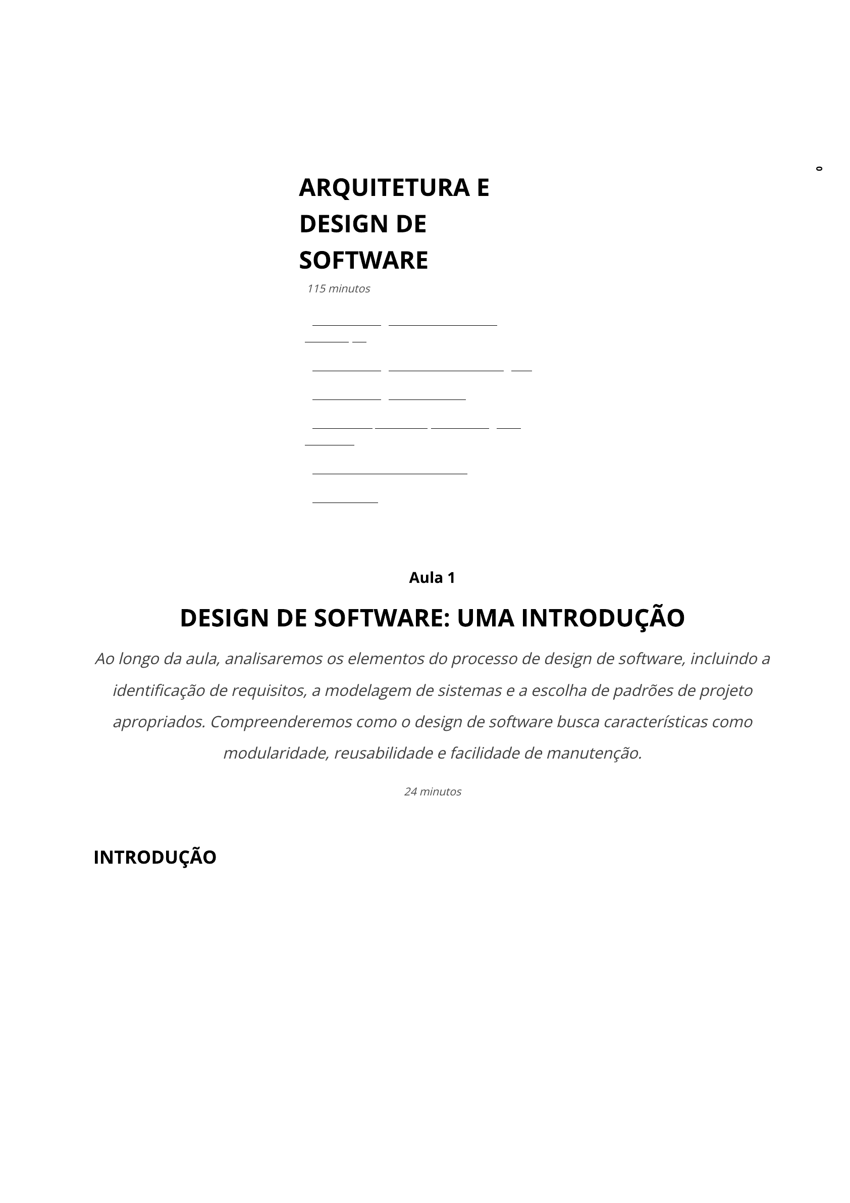 Olá, estudante! Nesta aula, você aprenderá sobre o conceito principal do design de software e suas características essenciais. Exploraremos como o design de software contribui para a criação de soluções tecnológicas e�cientes e de qualidade. Ao longo da aula, analisaremos os elementos do processo de design de software, incluindo a identi�cação de requisitos, a modelagem de sistemas e a escolha de padrões de projeto apropriados. Compreenderemos como o design de software busca características como modularidade, reusabilidade e facilidade de manutenção. Ao longo da aula, analisaremos os elementos do processo de design de software, incluindo a identi�cação de requisitos, a modelagem de sistemas e a escolha de padrões de projeto apropriados. Compreenderemos como o design de software busca características como modularidade, reusabilidade e facilidade de manutenção. 24 minutos Aula 1 - Design de software: uma introdução Aula 2 - Design de software: visão geral Aula 3 - Design de software Aula 4 - Implementação do design de software Aula 5 - Revisão da unidade Referências 115 minutos V er a n o ta çõ es wlldd_232_u2_arq_sof https://conteudo.colaboraread.com.br/202302/WHITE_LABEL/ARQUITETUR... 1 of 27 01/03/2024, 10:04 https://conteudo.colaboraread.com.br/202302/WHITE_LABEL/ARQUITETURA_DE_SOFTWARE/LIVRO/U4/index.html#aula1 https://conteudo.colaboraread.com.br/202302/WHITE_LABEL/ARQUITETURA_DE_SOFTWARE/LIVRO/U4/index.html#aula1 https://conteudo.colaboraread.com.br/202302/WHITE_LABEL/ARQUITETURA_DE_SOFTWARE/LIVRO/U4/index.html#aula1 https://conteudo.colaboraread.com.br/202302/WHITE_LABEL/ARQUITETURA_DE_SOFTWARE/LIVRO/U4/index.html#aula1 https://conteudo.colaboraread.com.br/202302/WHITE_LABEL/ARQUITETURA_DE_SOFTWARE/LIVRO/U4/index.html#aula1 https://conteudo.colaboraread.com.br/202302/WHITE_LABEL/ARQUITETURA_DE_SOFTWARE/LIVRO/U4/index.html#aula1 https://conteudo.colaboraread.com.br/202302/WHITE_LABEL/ARQUITETURA_DE_SOFTWARE/LIVRO/U4/index.html#aula1 https://conteudo.colaboraread.com.br/202302/WHITE_LABEL/ARQUITETURA_DE_SOFTWARE/LIVRO/U4/index.html#aula2 https://conteudo.colaboraread.com.br/202302/WHITE_LABEL/ARQUITETURA_DE_SOFTWARE/LIVRO/U4/index.html#aula2 https://conteudo.colaboraread.com.br/202302/WHITE_LABEL/ARQUITETURA_DE_SOFTWARE/LIVRO/U4/index.html#aula2 https://conteudo.colaboraread.com.br/202302/WHITE_LABEL/ARQUITETURA_DE_SOFTWARE/LIVRO/U4/index.html#aula2 https://conteudo.colaboraread.com.br/202302/WHITE_LABEL/ARQUITETURA_DE_SOFTWARE/LIVRO/U4/index.html#aula3 https://conteudo.colaboraread.com.br/202302/WHITE_LABEL/ARQUITETURA_DE_SOFTWARE/LIVRO/U4/index.html#aula3 https://conteudo.colaboraread.com.br/202302/WHITE_LABEL/ARQUITETURA_DE_SOFTWARE/LIVRO/U4/index.html#aula3 https://conteudo.colaboraread.com.br/202302/WHITE_LABEL/ARQUITETURA_DE_SOFTWARE/LIVRO/U4/index.html#aula3 https://conteudo.colaboraread.com.br/202302/WHITE_LABEL/ARQUITETURA_DE_SOFTWARE/LIVRO/U4/index.html#aula4 https://conteudo.colaboraread.com.br/202302/WHITE_LABEL/ARQUITETURA_DE_SOFTWARE/LIVRO/U4/index.html#aula4 https://conteudo.colaboraread.com.br/202302/WHITE_LABEL/ARQUITETURA_DE_SOFTWARE/LIVRO/U4/index.html#aula4 https://conteudo.colaboraread.com.br/202302/WHITE_LABEL/ARQUITETURA_DE_SOFTWARE/LIVRO/U4/index.html#aula4 https://conteudo.colaboraread.com.br/202302/WHITE_LABEL/ARQUITETURA_DE_SOFTWARE/LIVRO/U4/index.html#aula4 https://conteudo.colaboraread.com.br/202302/WHITE_LABEL/ARQUITETURA_DE_SOFTWARE/LIVRO/U4/index.html#aula4 https://conteudo.colaboraread.com.br/202302/WHITE_LABEL/ARQUITETURA_DE_SOFTWARE/LIVRO/U4/index.html#aula4 https://conteudo.colaboraread.com.br/202302/WHITE_LABEL/ARQUITETURA_DE_SOFTWARE/LIVRO/U4/index.html#aula5 https://conteudo.colaboraread.com.br/202302/WHITE_LABEL/ARQUITETURA_DE_SOFTWARE/LIVRO/U4/index.html#aula5 https://conteudo.colaboraread.com.br/202302/WHITE_LABEL/ARQUITETURA_DE_SOFTWARE/LIVRO/U4/index.html#aula5 https://conteudo.colaboraread.com.br/202302/WHITE_LABEL/ARQUITETURA_DE_SOFTWARE/LIVRO/U4/index.html#aula5 https://conteudo.colaboraread.com.br/202302/WHITE_LABEL/ARQUITETURA_DE_SOFTWARE/LIVRO/U4/index.html#referencias https://conteudo.colaboraread.com.br/202302/WHITE_LABEL/ARQUITETURA_DE_SOFTWARE/LIVRO/U4/index.html#referencias Essa aula contribuirá para o seu aprendizado, fornecendo uma base sólida em design de software e capacitando você a criar soluções robustas e e�cazes. Ao aplicar os princípios aprendidos, você poderá desenvolver sistemas escaláveis e intuitivos. Lembre-se de que o aprendizado contínuo é essencial para o crescimento pro�ssional. Aproveite ao máximo esta aula, mantenha-se motivado e curioso para explorar as aplicações práticas do design de software em sua carreira. Bom aprendizado! V er a n o ta çõ es wlldd_232_u2_arq_sof https://conteudo.colaboraread.com.br/202302/WHITE_LABEL/ARQUITETUR... 2 of 27 01/03/2024, 10:04 De acordo com Martin (2019), o design de software é um conceito crucial na área da tecnologia, abrangendo a criação e o planejamento de programas e sistemas. O objetivo é organizar e estruturar esses sistemas de forma aprimorada, garantindo um funcionamento e�ciente e facilitando sua manutenção ao longo do ciclo de vida do software. No contexto do design de software, os elementos referem-se aos componentes essenciais e princípios fundamentais que compõem um sistema bem projetado. Esses elementos desempenham um papel crucial na criação de software de qualidade, sustentável e adaptável. Um dos principais elementos do design de software é a modularidade. A modularidade envolve dividir o código em componentes coesos e independentes, conhecidos como módulos. Cada módulo possui uma responsabilidade única e bem de�nida, facilitando alterações isoladas e reduz o impacto em outras partes do sistema. A modularidade promove a reutilização de módulos em diferentes contextos, tornando o sistema mais �exível e escalável. Outro elemento fundamental é a reusabilidade. Ela incent