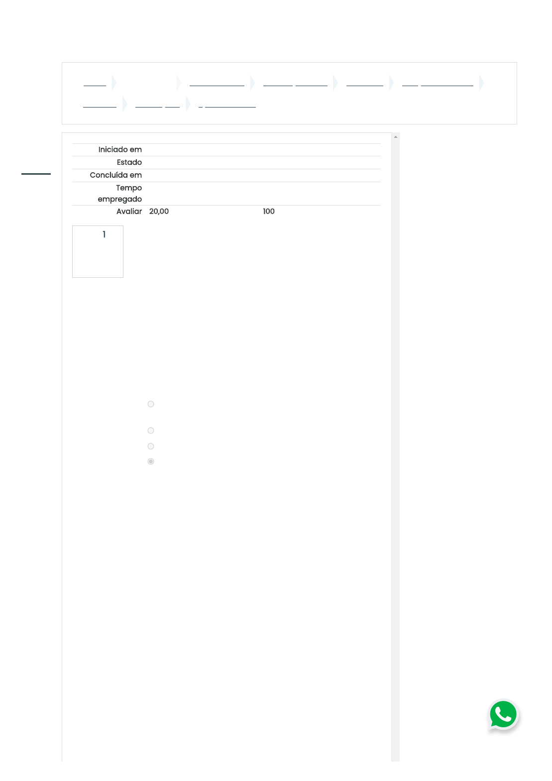 14/05/2022 20:23 QUESTIONÁRIO 1 https://ava.funec.br/mod/quiz/review.php?attempt=269684&cmid=5916 1/7 Painel Meus cursos CURSOS FUNEC Graduação - EAD Aluno EAD JUNÇÕES DE TURMA Genética AVALIAÇÕES QUESTIONÁRIO 1 Questão 1 Completo Atingiu 2,00 de 2,00 Iniciado em Saturday, 14 May 2022, 19:52 Estado Finalizada Concluída em Saturday, 14 May 2022, 21:23 Tempo empregado 1 hora 30 minutos Avaliar 20,00 de um máximo de 20,00(100%) Preto, azul, vermelho e creme são as cores mais comuns nessa categoria de pelagem, além de chocolate, lilás e canela, tida como uma das mais raras. Os pelos variam no corpo todo do animal entre as cores preta e vermelha, podendo contar com outros tons que incluem azul, creme e suas variações. Sabe-se que, em determinada raça de gatos, a pelagem preta uniforme é condicionada por um gene dominante B e a pelagem branca uniforme, pelo seu alelo recessivo b. Do cruzamento de um casal de gatos pretos, ambos heterozigotos, espera-se que nasçam: Escolha uma opção: a. 25% de gatos pretos, 50% de malhados e 25% de brancos b. 100% de gatos brancos c. 100% de gatos pretos d. 75% de gatos pretos e 25% de gatos brancos 14/05/2022 20:23 QUESTIONÁRIO 1 https://ava.funec.br/mod/quiz/review.php?attempt=269684&cmid=5916 2/7 Questão 2 Completo Atingiu 2,00 de 2,00 Questão 3 Completo Atingiu 2,00 de 2,00 A genética é ciência voltada para o estudo da hereditariedade, bem como da estrutura e das funções dos genes. Um estudante, ao iniciar o curso de Genética, anotou o seguinte: I. Cada caráter hereditário é determinado por um par de fatores e, como estes se separam na formação dos gametas, cada gameta recebe apenas um fator do par II. Cada par de alelos presentes nas células diploides separa-se na meiose, de modo que cada célula haploide só recebe um alelo do par III. Antes da divisão celular se iniciar, cada molécula de DNA se duplica e, na mitose, as duas moléculas resultantes se separam, indo para células diferentes A primeira lei de Mendel está expressa em: Escolha uma opção: a. II e III, somente b. I e II, somente c. I, somente d. II, somente Mendel realizou diversos experimentos com ervilhas a fim de demonstrar os mecanismos de hereditariedade. Ele resolveu utilizar as ervilhas porque elas realizam autofecundação, possuem ciclo de vida curto, são cultivadas facilmente e produzem um grande número de descendentes. Cruzando- se ervilhas verdes vv com ervilhas amarelas VV, os descendentes serão: Escolha uma opção: a. 25% Vv, amarelas; 50% vv, verdes; 25% VV, amarelas b. 100% VV, amarelas c. 50% Vv, amarelas; 50% vv, verdes d. 100% vv, verdes 14/05/2022 20:23 QUESTIONÁRIO 1 https://ava.funec.br/mod/quiz/review.php?attempt=269684&cmid=5916 3/7 Questão 4 Completo Atingiu 2,00 de 2,00 Questão 5 Completo Atingiu 2,00 de 2,00 As semelhanças existentes entre as características dos pais e dos filhos (altura, cor da pele, etc.) intrigaram o homem desde os tempos mais remotos, levando-o a procurar incessantemente as razões deste fato. Ora, durante muitos séculos, as justificativas encontradas eram pouco convincentes e nem mesmo Darwin, o pai da teoria da evolução, conseguiu explicar tais semelhanças. Só em meados do século XIX o frade Gregor Mendel, com as suas experiências sobre cruzamentos de plantas, trouxe, pela primeira vez, luz sobre o assunto. Ele formulou os princípios que regem a transmissão dessas características, hoje conhecidos como as leis da hereditariedade, que revolucionaram a biologia e lançaram as bases da genética. Desta maneira, a proporção de 3 fenótipos amarelos para 1 fenótipo verde (3:1), obtida nas auto fecundações de ervilhas híbridas realizadas por Gregor Mendel no século XIX, demonstrou: Escolha uma opção: a. a existência de fatores pares na determinação de características hereditárias b. a base matemática científica para a descoberta do núcleo celular c. que a recombinação de alelos ocorre em função da permutação d. a função dos cromossomos como material genético dos organismos Os coelhos passam por duas grandes trocas de pelos anualmente, nas quais apresentam uma enorme queda de pelos. Geralmente, essas trocas começam no final das estações de 'transição', isto é, outono e primavera. Os coelhos normalmente têm pelos longos e curtos. O gene autossômico que condiciona pelos curtos é dominante em relação ao gene que determina pelos longos. Do cruzamento entre coelhos heterozigotos nasceram 480 coelhinhos, dos quais 360 tinham pelos curtos. Entre esses coelhinhos de pelos curtos, o número esperado de heterozigotos é: Escolha uma opção: a. 240 b. 120 c. 90 d. 180 14/05/2022 20:23 QUESTIONÁRIO 1 https://ava.funec.br/mod/quiz/review.php?attempt=269684&cmid=5916 4/7 Questão 6 Completo Atingiu 2,00 de 2,00 Drosophila melanogaster é uma espécie de mosca (ordem taxonômica Diptera) na família Drosophilidae. A espécie também é conhecida como mosca-das-frutas ou mosca- do-vinagre. A espécie é amplamente utilizada como um organismo modelo, principalmente em pesquisas de genética e apresenta alguns fenótipos mutantes facilmente detectáveis em laboratório. Duas mutações recessivas, observáveis nessa mosca, são a das asas vestigiais (v) e a do corpo escuro (e). Após o cruzamento de uma fêmea com asas vestigiais com um macho de corpo escuro, foi obtido o seguinte: F1 - todos os machos e fêmeas com fenótipo selvagem. F2 - 9/16 selvagem; 3/16 asas vestigiais; 3/16 corpo escuro; 1/16 asas vestigiais e corpo escuro. Assinale com V (verdadeiro) ou F (falso) as afirmações abaixo, referentes aos resultados obtidos para o cruzamento descrito. ( ) As proporções fenotípicas obtidas em F2 indicam ausência de dominância, pois houve alteração nas proporções esperadas. ( ) Os resultados obtidos em F2 indicam um diibridismo envolvendo dois genes autossômicos com segregação independente. ( ) As proporções obtidas em F2 estão de acordo com a segunda Lei 