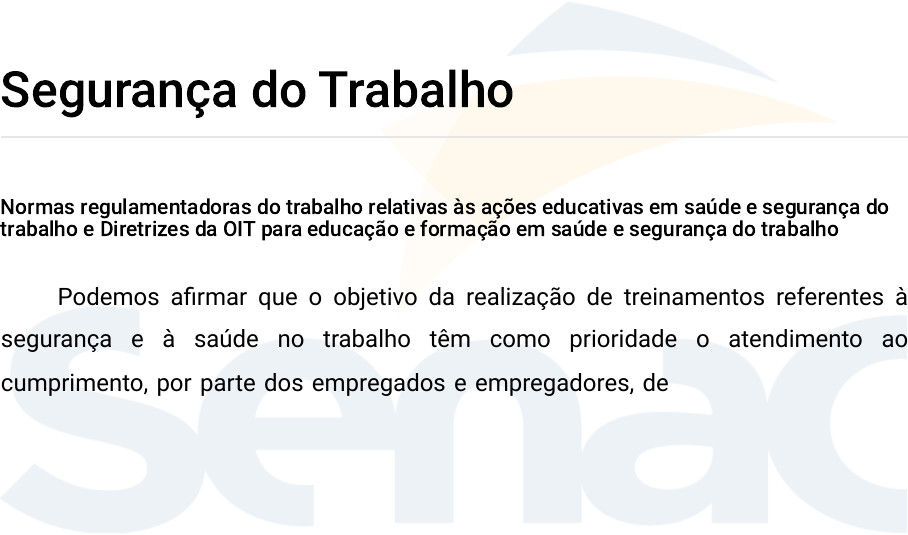 Segurança do Trabalho Normas regulamentadoras do trabalho relativas às ações educativas em saúde e segurança do trabalho e Diretrizes da OIT para educação e formação em saúde e segurança do trabalho Podemos afirmar que o objetivo da realização de treinamentos referentes à segurança e à saúde no trabalho têm como prioridade o atendimento ao cumprimento, por parte dos empregados e empregadores, de normas e legislações em vigência no Brasil. A Lei 6.514/77, lei do trabalho, através da Portaria 3.214/78, contempla cursos, treinamentos e capacitações necessárias de acordo com cada caso, podendo ocorrer conforme atividade exercida, risco presente, função, produtos ou formação de grupos de trabalho ou ações ou campanhas específicas. Já as normas do Ministério do Trabalho e Emprego (atualmente Secretaria Especial do Trabalho) visam garantir a segurança e o bem-estar dos trabalhadores em seu local de trabalho e meio ambiente. Neste tópico, destacaremos essas normas, ou seja, as normas regulamentadoras – NRs relativas às ações educativas em saúde e segurança do trabalho. A Norma Regulamentadora 1 – NR-1 é a norma que determina as disposições gerais e trata sobre conceitos que devem ser levados em consideração na hora de ministrar treinamentos no âmbito de todas as NRs. O empregador deve promover capacitação e treinamento dos trabalhadores em conformidade com o disposto nas NRs. Ao término dos treinamentos previstos nas NRs, deve ser emitido certificado contendo o nome e a assinatura do trabalhador, o conteúdo programático, a carga horária, a data, o local de realização do treinamento, o nome e a qualificação dos instrutores e a assinatura do responsável técnico do treinamento. A capacitação deve incluir: treinamento inicial, treinamento periódico e treinamento eventual. O treinamento inicial deve ocorrer sempre antes de o trabalhador iniciar suas funções. A periodicidade dos treinamentos assim como o conteúdo programático serão estabelecidos nas próprias NRs específicas. O treinamento eventual deve ocorrer: quando houver mudança nos procedimentos, nas condições ou nas operações de trabalho, que impliquem em alteração dos riscos ocupacionais; na ocorrência de acidente grave ou fatal, que indique a necessidade de novo treinamento; após retorno de afastamento ao trabalho por período superior a 180 dias. Algumas normas podem estabelecer um tempo menor em relação à periodicidade dos treinamentos para os casos de afastamento, como, por exemplo, a NR-10, que estabelece um período de três meses de afastamento para realizar o treinamento. Nesse caso, deve-se levar em consideração a NR específica sempre, e aquilo que não constar na NR específica, aplica-se da NR geral, esse é o princípio hermenêutico das normas regulamentadoras. Quando o treinamento não apresentar prazos de periodicidades, poderão ser utilizados os DDS (diálogo diário de segurança) para justificar a continuidade nas informações de riscos prestadas aos operadores. A figura a seguir resume diversos critérios: A carga horária, o prazo para sua realização e o conteúdo programático do treinamento eventual devem atender à situação que motivou o treinamento. O tempo despendido em treinamentos previstos nas NRs é considerado como de trabalho efetivo. Após o término do treinamento, um certificado deverá ser emitido e entregue ao trabalhador, e uma cópia arquivada na empresa. Essa cópia poderá ser também digitalizada. Os treinamentos previstos em NR podem ser ministrados em conjunto com outros treinamentos da organização, observados os conteúdos e a carga horária previstos na respectiva norma regulamentadora. O aproveitamento de conteúdos de treinamento poderá ocorrer na mesma organização. O treinamento sobre os riscos químicos, físicos e biológicos antes de o trabalhador dar início as suas atividades já é estabelecido na NR-1 e NR-9. Trata-se do mesmo treinamento. A NR-26 também sugere o mesmo treinamento com o adendo das fichas de segurança dos produtos químicos, ensinando os trabalhadores como deve consultar as Fichas de Informação de Segurança para Produtos Químicos – FISPQs. Não é necessário ministrar três treinamentos diferentes, basta um treinamento que acompanhe o conteúdo específico dos treinamentos das normas. É permitido o aproveitamento de conteúdos de treinamentos ministrados na mesma organização, desde que: O conteúdo e a carga horária requeridos no novo treinamento estejam compreendidos no treinamento anterior O conteúdo do treinamento anterior tenha sido ministrado no prazo inferior ao estabelecido em NR ou há menos de dois anos, quando não estabelecida essa periodicidade Sejam validados pelo responsável técnico do treinamento Outro exemplo poderia ser o treinamento de brigadistas realizados para os profissionais que combatem o fogo e para os que trabalham com produtos inflamáveis. Diversos conteúdos relativos ao princípio do fogo, triângulo do fogo são semelhantes nos dois treinamentos. Por isso, caso o trabalhador tenha recebido o treinamento de produtos inflamáveis por um período inferior a um ano (periodicidade para produtos inflamáveis no caso do avançado), poderá aproveitar esse conteúdo no treinamento de brigadista. A NR-1 definiu essa nova consideração. O treinamento aproveitado deve constar no certificado do novo treinamento ministrado. A validade do novo treinamento considera a data do treinamento mais antigo aproveitado, ou seja, se o treinamento aproveitado tiver uma data muito antiga, isso poderá ocasionar um prazo de validade muito pequeno para o novo treinamento. Dependendo do caso, poderá ser economicamente mais viável o treinamento sem aproveitamento. Os treinamentos de outras organizações também podem ser aproveitados. Isso significa que o trabalhador que muda de empresa poderá utilizar o certificado emitido pela empresa anterior. Essa reg