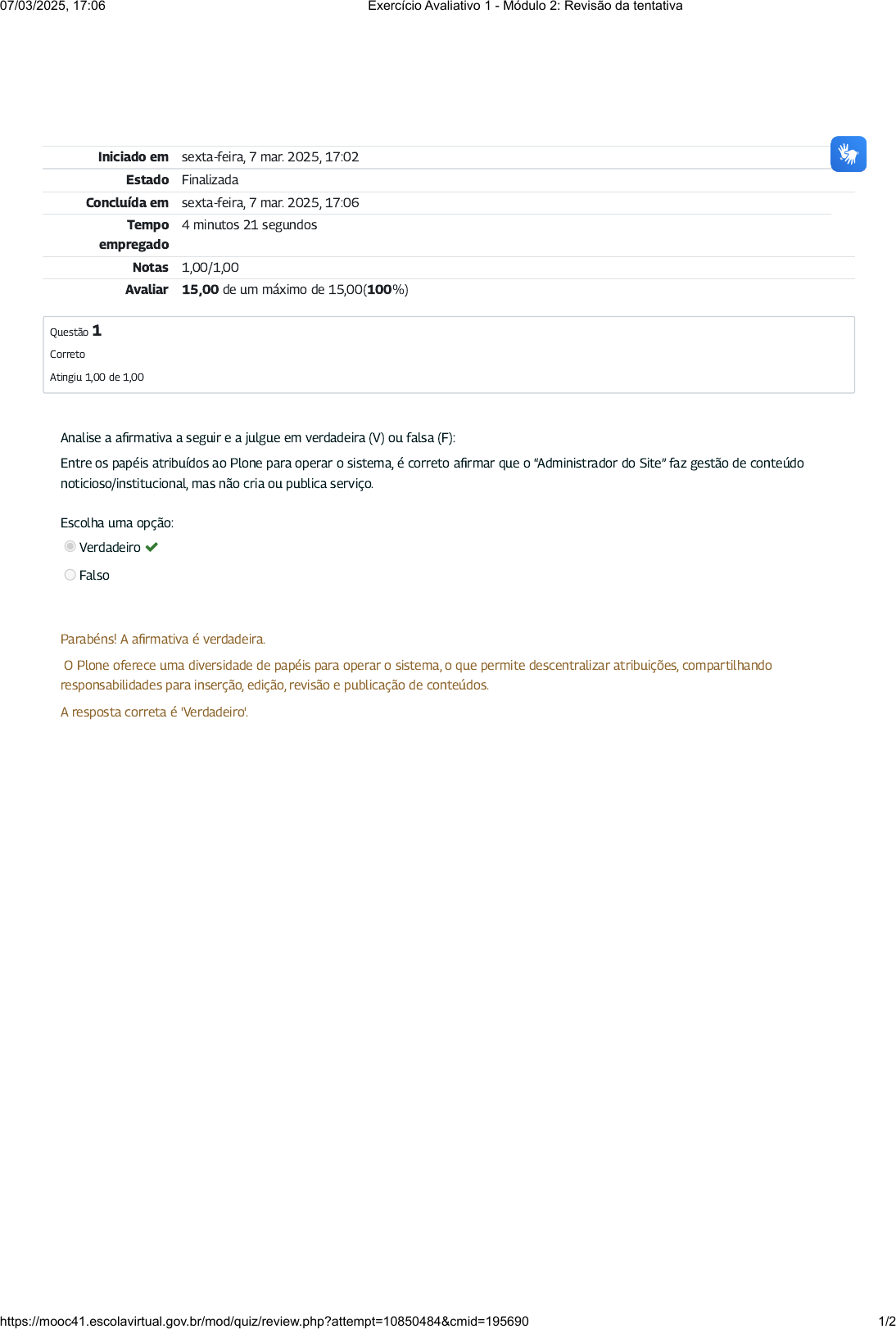 Iniciado em sexta-feira, 7 mar. 2025, 17:02 Estado Finalizada Concluída em sexta-feira, 7 mar. 2025, 17:06 Tempo empregado 4 minutos 21 segundos Notas 1,00/1,00 Avaliar 15,00 de um máximo de 15,00(100%) Questão 1 Correto Atingiu 1,00 de 1,00 Analise a afirmativa a seguir e a julgue em verdadeira (V) ou falsa (F): Entre os papéis atribuídos ao Plone para operar o sistema, é correto afirmar que o “Administrador do Site” faz gestão de conteúdo noticioso/institucional, mas não cria ou publica serviço. Escolha uma opção: Verdadeiro Falso Parabéns! A afirmativa é verdadeira. O Plone oferece uma diversidade de papéis para operar o sistema, o que permite descentralizar atribuições, compartilhando responsabilidades para inserção, edição, revisão e publicação de conteúdos. A resposta correta é 'Verdadeiro'. 07/03/2025, 17:06 Exercício Avaliativo 1 - Módulo 2: Revisão da tentativa https://mooc41.escolavirtual.gov.br/mod/quiz/review.php?attempt=10850484&cmid=195690 1/2 07/03/2025, 17:06 Exercício Avaliativo 1 - Módulo 2: Revisão da tentativa https://mooc41.escolavirtual.gov.br/mod/quiz/review.php?attempt=10850484&cmid=195690 2/2