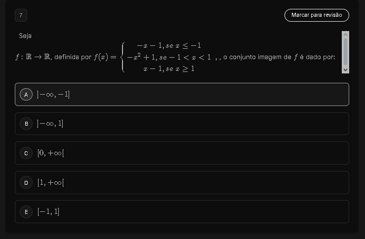 7 Marcar para revisão Seja IR, definida por f(x) : x2 conjunto imagem de f é dado por: A C [0, D [1, E [-1,1]