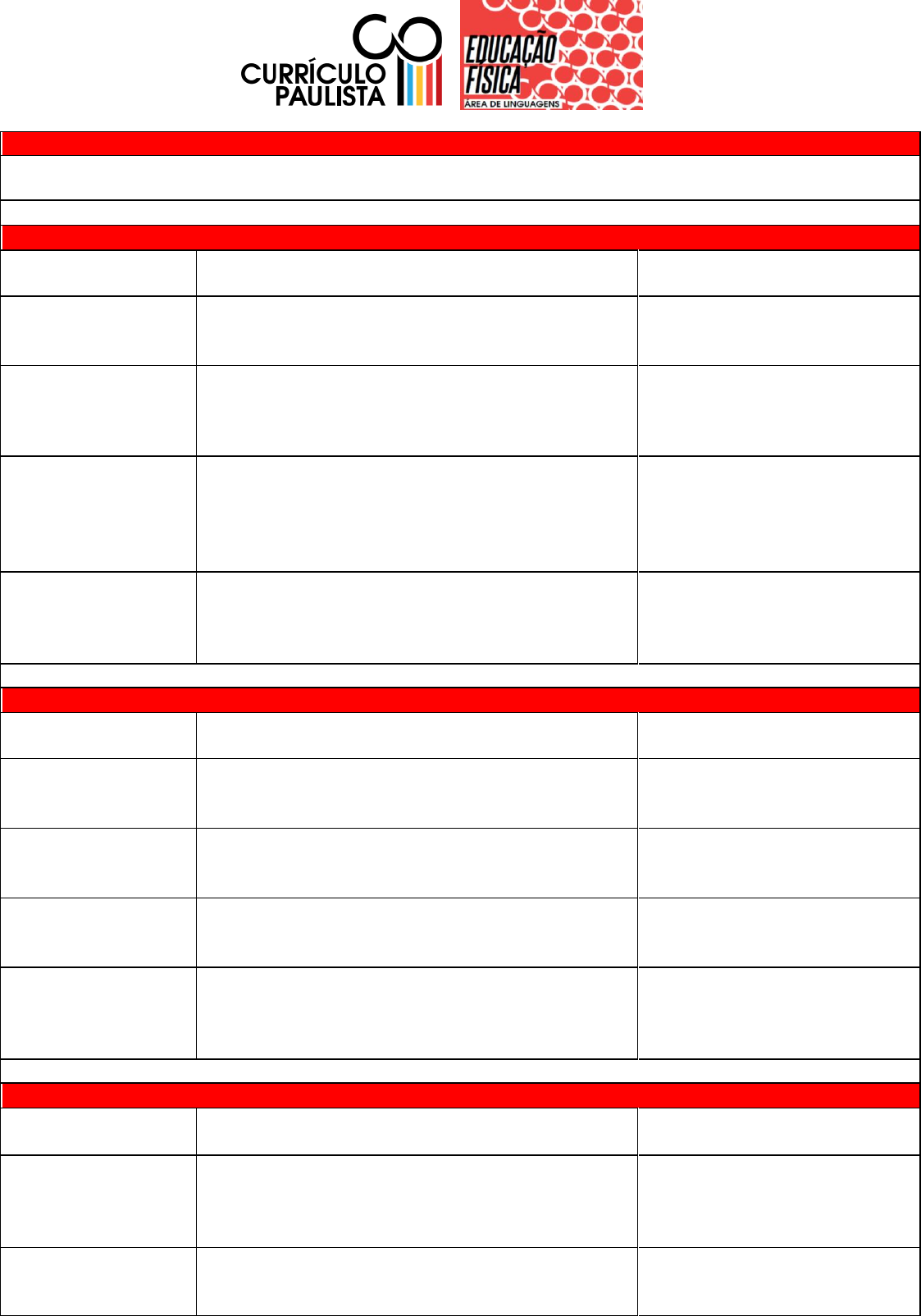 EDUCACÃO FÍSICA 6º ANO - ENSINO FUNDAMENTAL 1º BIMESTRE UNIDADES TEMÁTICAS HABILIDADES OBJETOS DE CONHECIMENTO Esporte (EF06EF03) Experimentar e fruir esportes de marca e invasão valorizando o trabalho coletivo e o protagonismo. Esporte de marca e invasão Esporte (EF06EF04) praticar um ou mais esporte de marca e invasão oferecido pela escola, usando habilidades técnico-táticas básicas e respeitando regras. Esporte de marca e invasão Esporte (EF06EF05) planejar e utilizar estratégias para solucionar os desafios técnicos e táticos, tanto nos esportes de marca, e invasão, como nas modalidades esportivas escolhidas para praticar. Esporte de marca e invasão Esporte (EF06EF22*) vivenciar um ou mais esportes paralímpicos, respeitando as diferenças individuais e valorizando a importância dessa prática. Esporte paralimpico. 2º BIMESTRE (no Currículo) UNIDADES TEMÁTICAS HABILIDADES OBJETOS DE CONHECIMENTO Dança (EF06EF11) experimentar, fruir e recriar danças urbanas, identificando seus elementos constitutivos (ritmo, espaço, gestos). Danças Urbanas Dança (EF06EF12) planejar e utilizar estratégias para aprender elementos constitutivos (ritmo, espaço, gestos) das danças urbanas. Danças Urbanas Ginástica (EF06EF08) experimentar e fruir exercícios físicos da ginástica de condicionamento físico que solicitem diferentes capacidades físicas Ginástica de Condicionamento Fisico Ginástica (EF06EF09) construir, coletivamente, procedimentos e normas de convívio que viabilizem a participação de todos na prática de exercícios físicos. Ginástica de Condicionamento Fisico 3º BIMESTRE UNIDADES TEMÁTICAS HABILIDADES OBJETOS DE CONHECIMENTO Práticas corporais de aventura (EF06EF18) experimentar e fruir diferentes práticas corporais de aventura urbanas, valorizando a própria segurança e integridade física, bem como as dos demais. Práticas Corporais de aventura urbana Práticas corporais de aventura (EF06EF21) identificar a origem das práticas corporais de aventura e as possibilidades de recriá-las, reconhecendo as características Práticas Corporais de aventura urbana (instrumentos, equipamentos de segurança, indumentária, organização) e seus tipos de práticas. Corpo, movimento e saúde. (EF06EF23*) identificar as capacidades físicas predominantemente mobilizadas na prática dos esportes e da ginástica, relacionando a melhoria do desempenho ao desenvolvimento das mesmas. Capacidades fisicas Corpo, movimento e saúde. (EF06EF25*) identificar e diferenciar exercício físico de atividade física Exercicio fisico e atividade fisica 4º BIMESTRE UNIDADES TEMÁTICAS HABILIDADES OBJETOS DE CONHECIMENTO Brincadeiras e jogos (EF06EF01) experimentar e fruir, na escola e fora dela, jogos eletrônicos diversos, identificando os sentidos e significados atribuídos a eles por diferentes grupos sociais e etários. Jogos Eletrônicos Brincadeiras e jogos (EF06EF24*) praticar um ou mais jogos de tabuleiro, utilizando as habilidades técnico- táticas básicas e respeitando as regras. Jogos de Tabuleiro Lutas (EF06EF14) experimentar, fruir e recriar diferentes lutas do brasil, valorizando a própria segurança e integridade física, bem como as dos demais. Lutas do Brasil Lutas (EF06EF16) identificar as características (códigos, rituais, elementos técnico-táticos, indumentária, materiais, instalações, instituições) das lutas do brasil. Lutas do Brasil EDUCAÇÃO FÍSICA 7º ANO - ENSINO FUNDAMENTAL 1º BIMESTRE UNIDADES TEMÁTICAS HABILIDADES OBJETOS DE CONHECIMENTO Brincadeiras e jogos (EF07EF02) Identificar as transformações nas características dos jogos eletrônicos em função dos avanços das tecnologias. Jogos eletrônicos Lutas (EF07EF14) Experimentar e recriar diferentes lutas do Brasil, valorizando a própria segurança e integridade física, bem como as dos demais. Lutas do Brasil Lutas (EF07EF17) Problematizar preconceitos e estereótipos relacionados ao universo das lutas e demais práticas corporais, propondo alternativas para superá-los, com base na solidariedade, na justiça, na equidade e no respeito. Lutas do Brasil Práticas Corporais de Avenura (EF07EF21) Recriar as práticas corporais de aventura, reconhecendo as características Práticas corporais de aventura urbanas (instrumentos, equipamentos de segurança, indumentária, organização) e seus tipos de práticas. 2º BIMESTRE UNIDADES TEMÁTICAS HABILIDADES OBJETOS DE CONHECIMENTO Danças (EF07EF11) Experimentar, fruir e recriar danças urbanas, identificando seus elementos constitutivos (ritmo, espaço, gestos). Danças Urbanas Danças (EF07EF13) Diferenciar as danças urbanas das demais manifestações da dança, valorizando e respeitando os sentidos e significados atribuídos a elas por diferentes grupos sociais. Danças Urbanas Ginástica (EF07EF08) Propor e Vivenciar exercícios físicos que solicitem diferentes capacidades físicas, identificando seus tipos (força, velocidade, resistência, flexibilidade, agilidade). Ginástica de Condicionamento fisico Ginástica (EF07EF10) Propor alternativas para a prática de exercícios físicos dentro e fora do ambiente escolar. Ginástica de Condicionamento fisico 3º BIMESTRE UNIDADES TEMÁTICAS HABILIDADES OBJETOS DE CONHECIMENTO Esporte (EF07EF03) Experimentar, fruir e Identificar os diferentes elementos que constituem os esportes de precisão e técnico combinatórios, valorizando o trabalho coletivo e o protagonismo. Eporte de precisão e esporte técnico combinatório Esporte (EF07EF04) Praticar um ou mais esportes de precisão e técnico combinatórios oferecidos pela escola, usando habilidades técnico-táticas básicas e respeitando regras. Eporte de precisão e esporte técnico combinatório Esporte (EF07EF05) Planejar e utilizar estratégias para solucionar os desafios técnicos e táticos, tanto nos esportes de precisão e técnico combinatórios como nas modalidades esportivas escolhidas para praticar. Eporte de precisão 