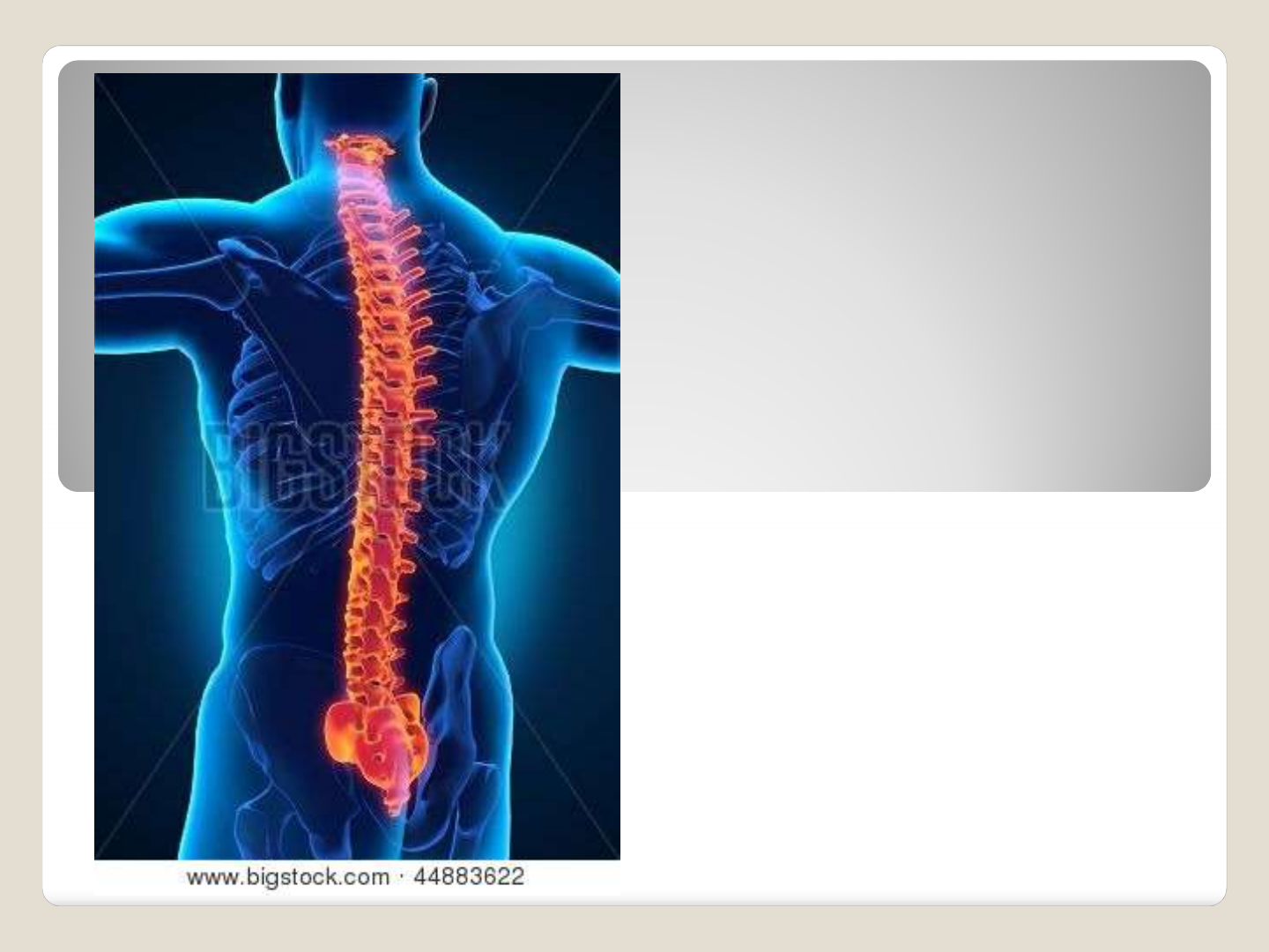Coluna Vertebral OSSOS E ARTICULAÇÕES FUNÇÕES- COLUNA VERTEBRAL Oferece um canal de proteção mecânica à medula espinal Eixo de sustentação para outras partes do esqueleto Mobilidade entre os segmento corporais Ponto de fixação de diversos músculos Participa da estabilização do eixo de gravidade Anterior Lateral esquerda Posterior Constituição 7 cervicais 33 vértebras 12 torácicas 5 lombares 5 sacrais * 4 coccígeas* CURVATURAS FISIOLÓGICAS Curvaturas PRIMÁRIAS- TÓRAX- SACRO-COCCÍGRA SEGUNDÁRIAS- CERVICAL- LOMBAR Curvaturas Fisiológicas 1 – cifose sacral (concavidade anterior) 2 – lordose lombar (concavidade posterior) 3 – cifose torácica (concavidade anterior) 4 – lordose cervical (concavidade posterior) Kapanji, 2000 Características Gerais- Vértebras Típicas Corpo Arco Vertebral CORPO E ARCO VERTEBRAL Corpo - apoiar discos intervertebrais Arco vertebral: PEDÍCULOS – incisura vertebral superior\ inferior * FORAME INTERVERTEBRAL LÂMINAS - PROCESSO ESPINHOSO FORAME VERTEBRAL PROCESSO ESPINHOSO PROCESSO TRANSVERSO PROCESSOS ARTICULARES SUPERIORES PROCESSOS ARTICULARES INFERIORES O corpo das vértebras aumenta de volume da porção cervical à lombar (as vértebras inferiores têm maior sobrecarga); Entre os corpos vertebrais apresenta um disco intervertebral fibrocartilaginoso (absorve os aumentos de pressão e confere mobilidade entre as vértebras)- anel fibroso - núcleo pulposo Apresenta curvaturas no sentido ântero - posterior – indispensáveis para a manutenção do equilíbrio e postura ereta (1) corpo vertebral (2) arco posterior tem a forma de uma ferradura. (3 e 4) apófises articulares (5 e 6) processos transversos (8 e 9) pedículos (10 e 11) lâminas atrás do maciço das apófises articulares (7) processo espinhoso Incisuras vertebrais (superior e inferior) Forame intervertebral (passagem dos nervos espinhais e vasos) Características regionais das vértebras Vértebras cervicais 1ª e 2ª = vértebras atípicas 1ª = atlas 2ª = áxis 3ª a 7ª = vértebras típicas 7ª = possui algumas particularidades ATLAS Não possui corpo vertebral Forame vertebral – forma losangular Arcos anterior e posterior Tubérculos anterior e posterior Fóvea articular superior e inferior Processos transversos Forame transverso (passagem da artéria vertebral) Faceta articular para o dente do àxis NÃO TEM PROCESSO ESPINHOSO Áxis Serve de eixo para a rotação do atlas com o crânio. Dente do áxis + face articular do dente do áxis; Fóveas articulares superiores e inferiores Processo espinhoso é bifurcado 3ª à 6ª- Vértebras Cervicais Corpo pequeno ; Forame vertebral grande e triangular; Processos transversos pequenos; Forames transversos (passagem da artéria vertebral); Tubérculos anterior e posterior; Processos espinhosos – curtos, bifurcados e pouco inclinados; Facetas articulares dos processos articulares situam- se mais horizontalmente. 7ª vértebra cervical Aspectos particulares Conhecida como vértebra proeminente Processo espinhoso é longo e não bifurcado Forame transverso pode não existir Vértebras cervicais: C1 à C4 Fóvea articular da articulação atlânto-occipital Forame transverso Forame vertebral Processo espinhoso Processo transverso Vértebras torácicas 1ª vértebra torácica tende a assemelhar- se à última cervical As últimas podem apresentar aspectos encontrados nas vértebras lombares Características das vértebras torácicas Fóvea costal superior Fóvea costal inferior Fóvea costal transversa (articula-se com o tubérculo da costela) Processos espinhosos – muito inclinados Corpos vertebrais possuem um volume intermediário em relação as vértebras cervicais e lombares Facetas articulares situam-se plano frontal Vértebra torácica Processo espinhoso Processo transverso Fóvea costal Transversa Faceta articular superior Fóvea costal superior Corpo vertebral Forame vertebral Pedículo Lâmina Características das vértebras lombares vértebras + volumosas da coluna vertebral Corpo vertebral – formato de rim (reniforme) processos espinhosos – curtos e quadriláteros e situam-se no mesmo plano dos corpos vertebrais Não apresenta fóvea costal e forame transverso Facetas articulares – plano ântero-posterior Sacro Formado pela fusão de 5 vértebras que diminuem de tamanho no sentido crânio-caudal - Base – superior - Ápice – inferior - Concavidade – anterior - Abertura do canal sacral - Asa do sacro - Forames sacrais dorsais (nervos sacrais) - Forames sacrais pélvicos Sacro Processo articular hiato sacral Crista sacral mediana (fusão dos processos espinhosos) Tubérculos espinhosos Crista sacral intermédia (fusão dos processos articulares) Crista sacral lateral Faceta auricular (articula-se com íllio) Sacro – vista anterior Base do sacro Faceta articular ou processo art. superior Linha transversa Forame sacral anterior Ápice do sacro Asa lateral do sacro Promontório sacral Sacro – vista posterior Canal sacral processo articular superior Crista sacral lateral Forame sacral posterior Ápice do sacro Faceta auricular Crista sacral mediana Crista sacral intermédia ou medial Tuberosidade sacral Hiato sacral Cóccix Fusão de 3 ou 4 peças coccígeas - Osso irregular - Representa o vestígio da cauda - Articula-se com o sacro por meio de um disco intervertebral