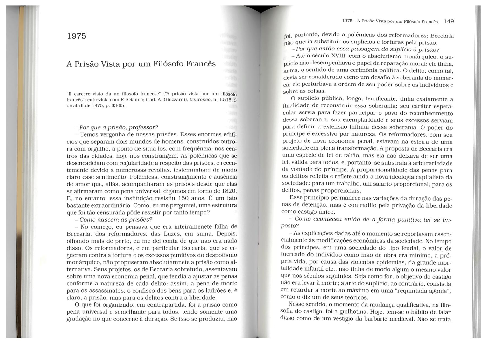 1975 A Prisão Vista por um Filósofo Francês 149 1975 foi, portanto, devido a polêmicas dos reformadores; Beccaria não queria substituir os suplícios e torturas pela prisão. Por que então essa passagem do suplício à prisão? Até século XVIII, com absolutismo su- A Prisão Vista por um Filósofo Francês plício não desempenhava papel de reparação moral; ele tinha, antes, sentido de uma cerimônia política. delito, como tal, devia ser considerado como um desafio à soberania do monar- ca: ele perturbava a ordem de seu poder sobre os indivíduos e sobre as coisas. "Il carcere visto da un filosofo francese" ("A prisão vista por um filósofo entrevista com Scianna: trad. A. Ghizzardi), n. 1.515, 3 suplício público, longo, terrificante, tinha exatamente a de abril de 1975, p. 63-65. finalidade de reconstruir essa soberania; seu caráter espeta- cular servia para fazer participar povo do reconhecimento dessa soberania; sua exemplaridade e seus excessos serviam Por que a prisão, professor? para definir a extensão infinita dessa soberania. O poder do Temos vergonha de nossas prisões. Esses enormes edifi- é excessivo por natureza. Os reformadores, com seu cios que separam dois mundos de homens, construídos outro- projeto de nova economia penal, estavam na esteira de uma ra com orgulho, a ponto de situá-los, com frequência, nos cen- sociedade em plena transformação. A proposta de Beccaria era tros das cidades, hoje nos constrangem. As polêmicas que se uma espécie de lei de talião, mas ela não deixava de ser uma desencadeiam com regularidade a respeito das prisões, e recen- lei, válida para todos, e, portanto, se substraia à arbitrariedade temente devido a numerosas revoltas, testemunham de modo da vontade do príncipe. A proporcionalidade das penas para claro esse sentimento. Polêmicas, constrangimento e ausência os delitos refletia e reflete ainda a nova ideologia capitalista da de amor que, aliás, acompanharam as prisões desde que elas sociedade: para um trabalho, um salário proporcional; para os se afirmaram como pena universal, digamos em torno de 1820. delitos, penas proporcionais. no entanto, essa instituição resistiu 150 anos. É um fato Esse princípio permanece nas variações da duração das pe- bastante extraordinário. Como, eu me perguntei, uma estrutura nas de detenção, mas é contradito pela privação da liberdade que foi tão censurada pôde resistir por tanto tempo? como castigo único. Como nascem as prisões? Como aconteceu então de a forma punitiva ter se im- No começo, eu pensava que era inteiramenete falha de posto? Beccaria, dos reformadores, das Luzes, em suma. Depois, As explicações dadas até o momento se reportavam essen- olhando mais de perto, eu me dei conta de que não era nada cialmente às modificações econômicas da sociedade. No tempo disso. Os reformadores, e em particular Beccaria, que se er- dos em uma sociedade do tipo feudal, o valor de gueram contra a tortura e os excessos punitivos do despotismo mercado do indivíduo como mão de obra era mínimo, a pró- não propuseram absolutamnete a prisão como al- pria vida, por causa das violentas epidemias, da grande mor- ternativa. Seus projetos, os de Beccaria sobretudo, assentavam talidade infantil etc., não tinha de modo algum mesmo valor sobre uma nova economia penal, que tendia a ajustar as penas que nos séculos seguintes. Seja como for, objetivo do castigo conforme a natureza de cada delito: assim, a pena de morte não era levar à a arte do suplício, ao contrário, consistia para os assassinatos, o confisco dos bens para os ladrões e, é em retardar a morte ao máximo em uma "requintada claro, a prisão, mas para os delitos contra a liberdade. como diz um de seus teóricos. que foi organizado, em contrapartida, foi a prisão como Nesse sentido, momento da mudança qualificativa, na filo- pena universal e semelhante para todos, tendo somente uma sofia do castigo, foi a guilhotina. Hoje, tem-se hábito de falar gradação no que concerne à duração. Se isso se produziu, não disso como de um vestígio da barbárie medieval. Não se trata150 Michel Foucault Ditos e Escritos 1975 A Prisão Vista por um Filósofo Francês 151 disso. Em sua época, a guilhotina foi uma engenhosa pequena jogo do sistema, tal como continuam a entrar nele em certas máquina que transformou suplício em execução capital, que se realidades econômicas e sociais particularmente atrasadas. efetuava como um relâmpago, de modo quase abstrato, verda- Lauro dizia que o contrabando em Nápoles é a Fiat do deiro grau zero do sofrimento. Apelava-se sempre ao povo para Sul. que ele assistisse ao ritual teatral da pena, mas somente a fim de Exatamente. Mas no fim do século XVIII a burguesia, com ratificar a execução, e não para que ele participasse dela. as novas exigências da sociedade industrial, com uma maior Com a nova estrutura econômica da sociedade, a bur- subdivisão da propriedade, não pôde mais tolerar os ilegalis- guesia precisa organizar sua chegada ao poder com a ajuda mos populares; ela buscou novos métodos de coação do indi- de uma nova tecnologia penal muito mais eficaz do que a víduo, de controle, de enquadramento e de vigilância. Os refor- precedente. madores da época das Luzes propunham uma nova economia De todo modo, mais suave. penal, não a nova tecnologia de que se A "suavidade" das penas não tem nada a ver com a efi- Em que tradição se enterram as raízes culturais da cácia do sistema penal. É preciso desembaraçar-se da ilusão prisão? segundo a qual a atribuição das penas se faz com o objetivo de A forma prisão nasce muito antes de sua introdução no reprimir os delitos: as medidas punitivas não desempenham sistema penal. Nós a encontramos em estado embrionário em somente papel negativo de repressão, mas também "po- toda ciência do corpo, de sua "correção", de sua aprendiza- sitivo" de legitimar o poder que edita as regras. Pode-