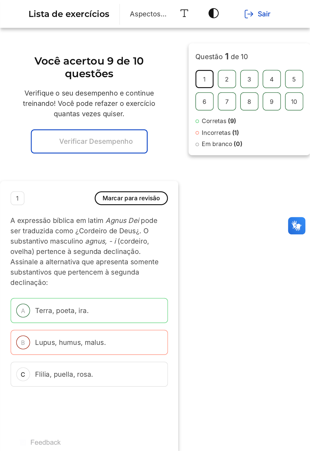 Você acertou 9 de 10 questões Verifique o seu desempenho e continue treinando! Você pode refazer o exercício quantas vezes quiser. Verificar Desempenho A B C 1 Marcar para revisão A expressão bíblica em latim Agnus Dei pode ser traduzida como ¿Cordeiro de Deus¿. O substantivo masculino agnus, - i (cordeiro, ovelha) pertence à segunda declinação. Assinale a alternativa que apresenta somente substantivos que pertencem à segunda declinação: Terra, poeta, ira. Lupus, humus, malus. Flilia, puella, rosa. Questão 1 de 10 Corretas (9) Incorretas (1) Em branco (0) 1 2 3 4 5 6 7 8 9 10 Lista de exercícios Aspectos… Sair Feedback D E A B C Ancilla, fama, fortuna. Inimica, silva, regina. Resposta incorreta Opa! A alternativa correta é a letra A. Confira o gabarito comentado! Gabarito Comentado Somente esta a alternativa traz palavras da segunda declinação. As demais alternativas apresentam palavras da primeira declinação. ----- 2 Marcar para revisão Considerando que o verbo esse é um verbo irregular, assinale a alternativa que traz a tradução correta para a oração a seguir: Petrus est bonus. Pedro sou bom. Pedro és bom. Pedro é bom. D E Pedro sois bom. Pedro somos bons. Resposta correta Parabéns, você selecionou a alternativa correta. Confira o gabarito comentado! Gabarito Comentado A frase Petrus est bonus contém o verbo esse no presente, na terceira pessoa do singular. Petrus é um nome próprio que traduzimos como Pedro, enquanto bonus é o adjetivo que significa bom. Portanto, a alternativa C, "Pedro é bom", é a tradução correta. As outras opções apresentam traduções incorretas do verbo. Além disso, a alternativa E também traduz erroneamente o adjetivo. 3 Marcar para revisão Você certamente conhece a oração do Pai Nosso. Vamos ver como é a forma, em latim, escrita pelo evangelista Mateus (Mt. 6: 9-13)? "Pater noster, qui in caelis es, sanctificetur nomen tuum; veniat regnum tuum; fiat voluntas tua sicut in caelo et in terra. Panem nostrum supersubstantialem da nobis hodie. Et dimitte nobis debita nostra sicut et nos dimissimus debitoribus nostris. Et ne inducas nos in temptationem sed libera nos a malo." Agora marque a opção que traz uma palavra da primeira e da segunda declinações, A B C D E respectivamente. Terra, - ae; pater, - tris Terra, -ae; caelum, -i Terra, -ae; panis, -is Caelum, -i; voluntas, -atis Terra, -ae; voluntas, -atis Resposta correta Parabéns, você selecionou a alternativa correta. Confira o gabarito comentado! Gabarito Comentado O genitivo é o caso que identifica a declinação. Na primeira declinação, o genitivo singular é -ae, como ocorre em 'terra, -ae'. Na segunda declinação, o genitivo singular é -i, como ocorre em 'caelum,-i'. Portanto, apenas na alternativa B encontramos um substantivo de segunda declinação. As alternativas A, C e E estão incorretas porque 'pater', 'panis' e 'voluntas' são da terceira declinação. A opção D está incorreta porque primeiro aparece uma palavra da segunda declinação e depois uma palavra da terceira declinação. Assim, a alternativa correta é a B, que apresenta uma palavra da primeira declinação (terra, -ae) e uma A B C D E da segunda declinação (caelum, -i), respectivamente. 4 Marcar para revisão O caso latino é associado à função sintática da língua portuguesa, mas diferenças importantes devem ser consideradas quando fazemos essa comparação. Marque a alternativa que demonstra uma diferença. Em latim, as palavras são fixas na oração por causa do caso, enquanto em português podemos mudar as palavras de lugar como quisermos. Os nomes latinos possuem uma terminação que indica a função sintática, enquanto em português a posição da palavra indica sua função. Na língua portuguesa o sujeito fica sempre antes do verbo, enquanto em latim o caso nominativo do sujeito o posiciona depois do verbo. O substantivo em língua portuguesa só pode funcionar como sujeito, enquanto em latim ele sofre variação em seis casos. A função sintática, em português, dá mobilidade aos substantivos na oração, enquanto o caso latino fixa a palavra na oração. Resposta correta Parabéns, você selecionou a alternativa correta. Confira o gabarito comentado! Gabarito Comentado A alternativa correta é a letra B. A principal diferença entre o latim e o português é a maneira como a função sintática é determinada. No latim, a terminação do nome, também conhecida como caso, define a função sintática da palavra, independentemente de sua posição na frase. Isso significa que a ordem das palavras em uma frase em latim pode ser alterada sem mudar o significado da frase. Por outro lado, no português, a função sintática de uma palavra é geralmente determinada por sua posição na frase. Portanto, ao mudar a posição de uma palavra em uma frase em português, podemos alterar o significado da frase. 5 Marcar para revisão Analise as afirmativas a seguir: I - Há cinco grupos de declinação, cada um apresentando flexões para o singular e plural a partir dos seis casos. II - Apenas o substantivo pode ser flexionado no latim, não havendo flexão de outras formas nominais. III - Os adjetivos também podem ser flexionados, devendo o adjetivo concordar em número, gênero e caso com o substantivo. Está correto o que se afirma em: A B C D E I, apenas. II, apenas. I e III, apenas II e III, apenas. I, II e III. Resposta correta Parabéns, você selecionou a alternativa correta. Confira o gabarito comentado! Gabarito Comentado As afirmativas I e III estão corretas. Na língua latina, existem cinco grupos de declinação, cada um com suas próprias flexões para o singular e plural, considerando os seis casos. Além disso, não apenas os substantivos, mas também os adjetivos podem ser flexionados. Quando isso ocorre, o adjetivo deve concordar em número, gênero e caso com o substantivo ao qual se refere. Portanto, a afirmativa II está incorreta, pois contr