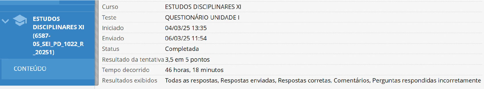 Curso ESTUDOS DISCIPLINARES XI ESTUDOS Teste QUESTIONÁRIO UNIDADE I DISCIPLINARES XI Iniciado 04/03/25 13:35 (6587- Enviado 06/03/25 11:54 05_SEI_PD_1022_R Status Completada Resultado da tentativa 3,5 em 5 pontos CONTEÚDO Tempo decorrido 46 horas, 18 minutos Resultados exibidos Todas as respostas, Respostas enviadas, Respostas corretas, Comentários, Perguntas respondidas incorretamentePergunta 1 em pontos Leia o texto a seguir. Piaget preocupou-se em explicar que a e consequentemente a se processa pelo contato do ser humano com meio e que essa relação é a responsável pelo desenvolvimento de novas estruturas cognitivas. Para conhecimento não é uma cópia da Conhecer um objeto ou um evento não é simplesmente observá-lo e fazer uma cópia mental mas atuar sobre transformá-lo e compreender processo dessa transformação e, como compreender como está Essa proposição inspirou a construção de um arcabouço teórico denominado que teve Piaget como um dos principais (GAMEZ L Psicologia do educação. Rio de Janeiro: 2013. p. 51) Sobre a teoria construtivista de avalie as construtivismo preconiza que conhecimento é construído pelo e não é apenas adquirido. II. A construção do conhecimento se segundo por meio da criação de estruturas cognitivas ou III. Uma estratégia didática adequada ao construtivismo é a exposição centrada no que detém o e a cobrança do conteúdo nas avaliações. É correto o que se afirma em: Resposta Selecionada: d. le Respostas: b. apenas. d. II, e. III, Comentário da Resposta: D. resposta: o construtivismo defende o papel ativo do sujeito na criação e na modificação de suas representações do objeto do conhecimento. Na concepção construtivista, a aprendizagem não é apenas um resultado: é o próprio desenvolvimento do aluno. Nesse a a acomodação e a equilibração são conceitos Para desenvolvimento cognitivo da criança passa por quatro estágios: pré-operatório; operatório operatórioPergunta 2 em pontos Leia texto seguir. A formação docente vai muito além da transmissão de pensar sobre esta formação em um contexto reflexivo e e que forma pesquisadores para atuar na educação através dos conteúdos que são ministrados, em uma ação tornando seus alunos críticos diante de uma sociedade opressora. Essa formação visa, antes de tudo, ao envolvimento com a prática saindo do modelo técnico de profissional, que só repete que está estabelecido, para ser aquele que busca enriquecer suas ações e habilidades como seja na sala de aula ou até mesmo para a (Disponível em: 10 ago. 2024.) Com base na leitura e nos seus conhecimentos, avalie as afirmativas. texto enfatiza a importância de se rejeitar modelo técnico de ensino em prol de uma abordagem mais dinâmica e enriquecedora das disciplinas, que torna obsoleta a discussão das bases teóricas que permeiam o processo de ensino e aprendizagem. II. A contextualização histórica promove a formação de cidadãos mais informados e críticos ao proporcionar a discussão das origens e das razões presentes na estrutura social política da atualidade. III. A formação docente deve ter como objetivo não apenas melhorar as práticas educacionais na sala de aula, mas também contribuir para desenvolvimento pessoal e profissional do educador. Assim, a formação docente deve in além do contexto acadêmico imediato. correto que se afirma em: Resposta Selecionada: d. II III, apenas. Respostas: a apenas. b. lell, apenas. d. apenas. e. Comentário da resposta: Resposta: D Comentário: A formação docente deve deve ter mera finalidade utilitária: ela é fundamental para desenvolvimento pessoal e profissional do educador.Pergunta 3 em pontos Leia texto seguir: Às vezes a pessoa se vê diante de uma situação nova que traz mas percebe que a mesma solução dada para um problema vivido anteriormente pode ser também a saída para problema do momento. Isso se chama transferência de Outras vezes julga-se cabível aplicar determinada aprendizagem anterior a certas situações que não a Por exemplo: usando os conhecimentos de querer traduzir a palavra inglesa por quando ela na maioria das Um terceiro aspecto da transferência de aprendizagem a em situações das mais abstratas e livrescas adquiridas em sala de aula. Em todos os estamos nos referindo à em determinada de aprendizagem realizada em outra isto a transferência de Na atividade espera-se que aluno, a partir de um número reduzido de conceitos e possa facilmente realizar a tarefa de conseguir novas aprendizagens. a influência das experiências anteriores favorecendo a aprendizagem do assim como a aprendizagem do momento deve favorecer aprendizagens futuras. Ao ensinar a professor conta com conhecimento anterior da adição para aluno entender que a multiplicação é uma adição abreviada. Na medida em que aluno não tiver dominado conceito de encontrará mais dificuldade para dominar de produto. conceito de produto será necessário para aprender de potência. Há transferências que, poderiamos ocorrem naturalmente [...]: a criança familiarizada com o aprenderá mais facilmente a dominar a macaco habituado a lidar com varas resolverá com mais facilidade problema de como alcançar a Nesses ganho representado pela situação anterior fica de tal modo incorporado ao e a situação atual é de tal modo dependente da que a transferência se realiza de forma praticamente Nos casos em que essas condições estão a transferência é (adaptado de M. Psicologia da São Paulo: 1988. p. Com base na leitura realizada e nos seus avalie as afirmativas: transferência de aprendizado ocorre de maneira automática quando aprendizado anterior foi muito bem assimilado pelo independentemente de qual situação ele Para que a transferência de aprendizado seja bem-sucedida, duas condições têm de ser atendidas: a situação nova estar relacionada com a situação e aprendizado da situação anterior ter sido bem incorporado pelo s