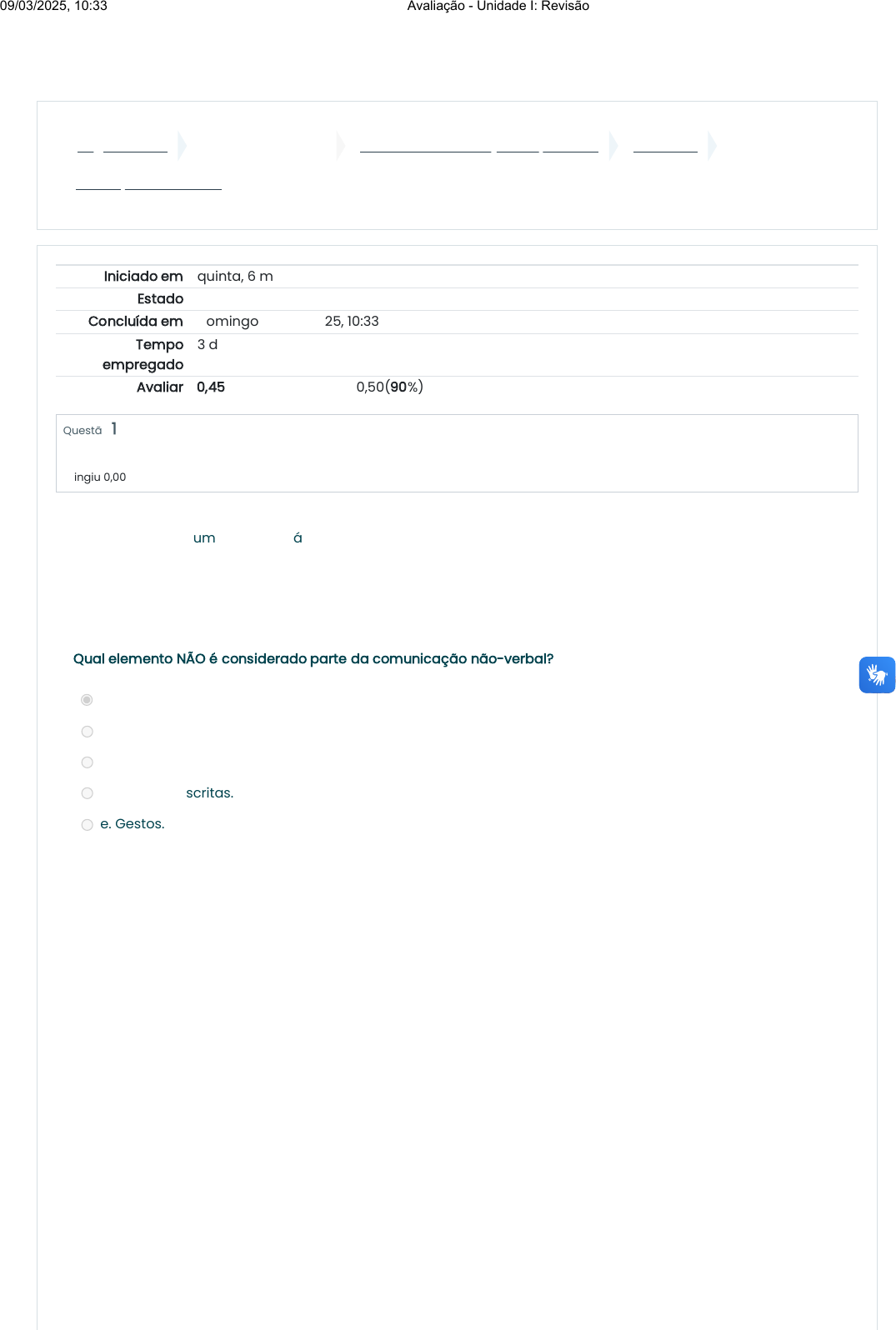 Página inicial Minhas disciplinas 2025/1 - Comunicação Empresarial UNIDADE I Avaliação - Unidade I Iniciado em quinta, 6 mar 2025, 09:29 Estado Finalizada Concluída em domingo, 9 mar 2025, 10:33 Tempo empregado 3 dias 1 hora Avaliar 0,45 de um máximo de 0,50(90%) Questão 1 Incorreto Atingiu 0,00 de 0,05 A comunicação humana é uma área de investigação e de estudos muito complexa, é tanto um fenômeno quanto uma função social e profissional. Ela é processada através de dois níveis: o verbal e o não verbal. A comunicação não-verbal é a forma não discursiva que pode ser transmitida através de três suportes: o corpo, os objetos associados ao corpo e os produtos da habilidade humana. MESQUITA, Rosa Maria. Comunicação não- verbal: relevância na atuação profissional. Revista Paulista de Educação Física, v. 11, n. 2, p. 155-163, 1997. Qual elemento NÃO é considerado parte da comunicação não-verbal? a. Expressões faciais. b. Postura. c. Tom da voz. d. Palavras escritas. e. Gestos. 09/03/2025, 10:33 Avaliação - Unidade I: Revisão da tentativa https://ambienteonline.uninga.br/mod/quiz/review.php?attempt=3467487&cmid=890801 1/5 https://ambienteonline.uninga.br/ https://ambienteonline.uninga.br/course/view.php?id=31390 https://ambienteonline.uninga.br/course/view.php?id=31390§ion=2 https://ambienteonline.uninga.br/mod/quiz/view.php?id=890801 Questão 2 Correto Atingiu 0,05 de 0,05 Questão 3 Correto Atingiu 0,05 de 0,05 Questão 4 Correto Atingiu 0,05 de 0,05 Com base no e-book sobre comunicação, julgue as afirmações a seguir: I. A comunicação é essencial para a formação da personalidade e a interação social, segundo Bordenave (1991). II. A Teoria da Informação, nos anos 1950, destacava-se pela ênfase na qualidade da informação transmitida e na eliminação de ruídos, conforme descrito por Tomasi e Medeiros (2019). III. O modelo mecanicista de Shannon e Weaver, embora simplificado, contribui para compreender aspectos fundamentais da comunicação humana, incluindo sua codificação e decodificação. IV. As organizações contemporâneas ainda são majoritariamente influenciadas por uma cultura comunicativa tradicional e autoritária, segundo Kunsch (2012). Com base nessas informações, assinale a alternativa correta: a. Todas as afirmativas estão corretas. b. Nenhuma das afirmativas está correta. c. Apenas as afirmativas II, III e IV estão corretas. d. Apenas as afirmativas I, II e III estão corretas. e. Apenas as afirmativas I, III e IV estão corretas. O que é considerado um elemento da comunicação não-verbal? a. Mensagens por rádio. b. Notícias em jornais. c. Tom da voz. d. Palavras escritas. e. Expressões faciais. Qual é a definição de comunicação segundo o dicionário Aurélio? a. Transmissão unidirecional de conhecimento. b. Capacidade de estabelecer diálogo e entendimento. c. Troca de ideias exclusivamente escritas. d. Compartilhamento de informações sem significado. e. Habilidade de falar apenas um idioma. 09/03/2025, 10:33 Avaliação - Unidade I: Revisão da tentativa https://ambienteonline.uninga.br/mod/quiz/review.php?attempt=3467487&cmid=890801 2/5 Questão 5 Correto Atingiu 0,05 de 0,05 Questão 6 Correto Atingiu 0,05 de 0,05 Questão 7 Correto Atingiu 0,05 de 0,05 Qual teoria considera a comunicação como um sistema interacional? a. Teoria de Shannon e Weaver. b. Teoria mecanicista. c. Modelo circular. d. Modelo linear. e. Teoria da informação. O modo como a comunicação ocorre afeta a vida humana no que diz respeito aos relacionamentos interpessoais, assim, entender esse processo, seus determinantes e as suas consequências aumentam a capacidade do indivíduo de compreender e conseguir superar as dificuldades relacionadas à comunicação no seu ambiente de trabalho, uma vez que o processo de comunicação é complexo e ultrapassa o sentido das palavras, envolvendo gestos e expressões. BROCA, Priscilla Valladares; FERREIRA, Márcia de Assunção. Processo de comunicação na equipe de enfermagem. Escola Anna Nery, v. 19, p. 467-474, 2015. Diante do texto apresentado, o que é considerado ruído no processo de comunicação? a. A compreensão do receptor. b. Ambiente tranquilo para comunicação. c. Interferências que reduzem a eficiência da comunicação. d. A clareza da mensagem. e. Feedback adequado do emissor. Qual é a função principal da comunicação empresarial? a. Ignorar os avanços tecnológicos. b. Reduzir a comunicação com os clientes. c. Estabelecer diálogo e entendimento dentro da empresa. d. Limitar a interação humana. e. Aumentar a complexidade organizacional. 09/03/2025, 10:33 Avaliação - Unidade I: Revisão da tentativa https://ambienteonline.uninga.br/mod/quiz/review.php?attempt=3467487&cmid=890801 3/5 Questão 8 Correto Atingiu 0,05 de 0,05 Questão 9 Correto Atingiu 0,05 de 0,05 Questão 10 Correto Atingiu 0,05 de 0,05 O que é considerado como ruído na comunicação? a. Mensagem compreensível. b. Interferência no canal de comunicação. c. Feedback claro. d. Emissor passivo. e. Ausência de contexto. A comunicação sempre está presente em nossa vida, visto que comunicar faz parte da natureza humana, das relações sociais. Falar em comunicação pressupõe falar em linguagem, uma vez que é por meio das diferentes linguagens (oral, textual, gestual, artística...) que nos comunicamos. NACARATO, Adair Mendes. A comunicação oral nas aulas de matemática nos anos iniciais do Ensino Fundamental. Revista Eletrônica de Educação, v. 6, n. 1, p. 9-26, 2012. Diante disso, assinale qual é uma característica da comunicação oral? a. Ausência de interação humana. b. Utilização de gestos exclusivamente. c. Uso de palavras técnicas. d. Inclusão apenas de adjetivos e advérbios. e. Utilização de palavras escritas. O que pode contribuir positivamente para uma boa apresentação em público? a. Desorganização das ideias. b. Inibição e falta de emoção. c