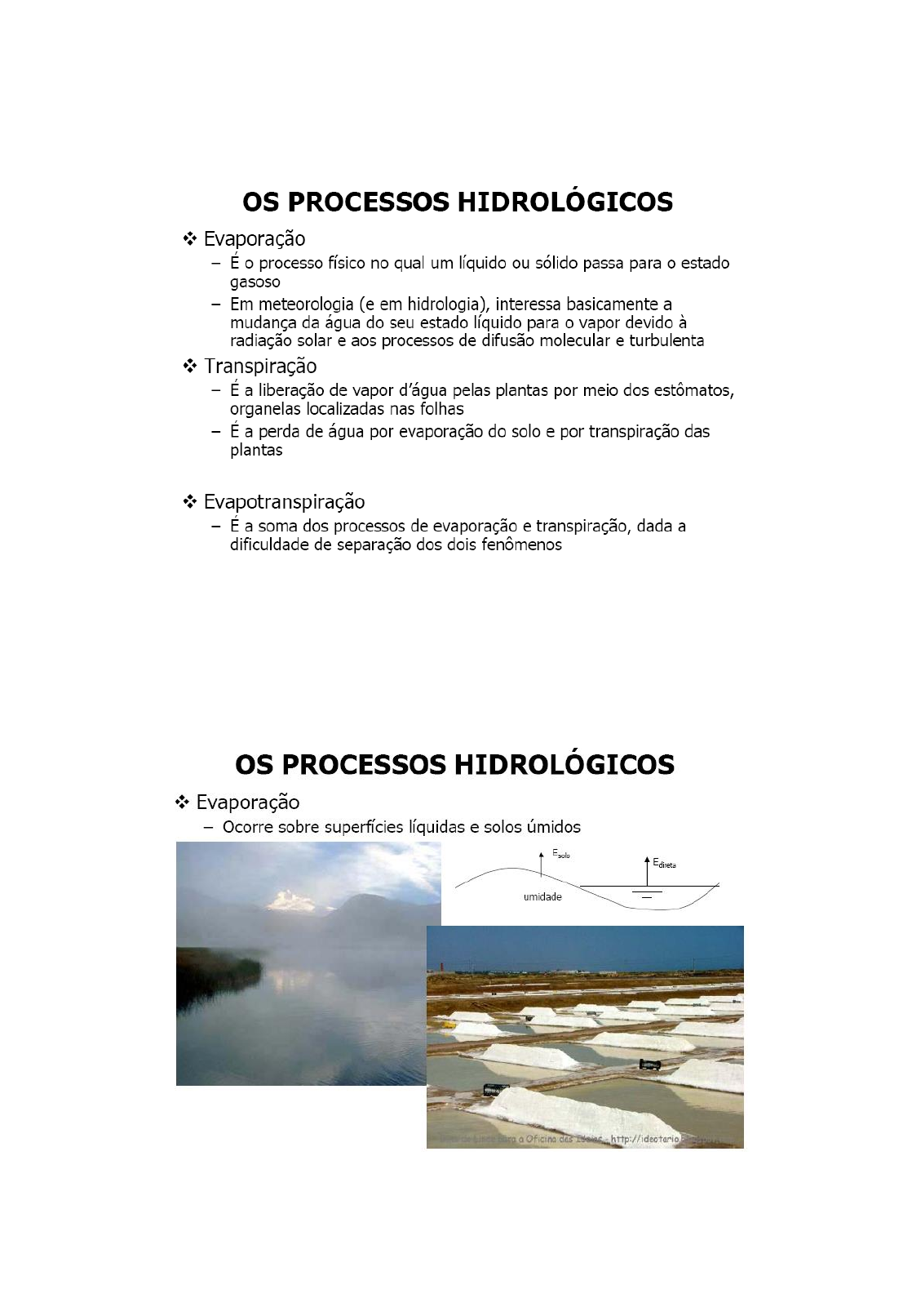 21/09/2017 1 21/09/2017 2 A Transpiração é a evaporação que ocorre das folhas das plantas, através das aberturas dos estômatos. Novamente, dada uma taxa ilimitada de alimentação de água na zona das raízes. Transpiração 21/09/2017 3 21/09/2017 4 Fatores Intervenientes: • Grau de umidade relativa do ar; • Temperatura; • Vento; • Radiação Solar; • Pressão barométrica; • Outros fatores. • Quanto maior a temperatura, maior a pressão de saturação do vapor de água no ar, isto é, maior a capacidade do ar de receber vapor. • Para cada 10oC, P0 é duplicada. Temp. oC 0 10 20 30 P0 (atm) 0,0062 0,0125 0,0238 0,0431 Temperatura 21/09/2017 5 A umidade relativa é a medida do conteúdo de vapor de água do ar em relação ao conteúdo de vapor que o ar teria se estivesse saturado. Assim, ar com umidade relativa de 100% está saturado de vapor, e ar com umidade relativa de 0% está completamente isento de vapor. Umidade do Ar se e .100UR onde UR é a umidade relativa; e é a pressão parcial de vapor no ar e es é pressão de saturação. % em • O vento renova o ar em contato com a superfície que está evaporando (superfície da água; superfície do solo; superfície da folha da planta). • Com vento forte a turbulência é maior e a transferência para regiões mais altas da atmosfera é mais rápida, e a umidade próxima à superfície é menor, aumentando a taxa de evaporação. pouco vento muito vento Vento 21/09/2017 6 A quantidade de energia solar que atinge a Terra no topo da atmosfera está na faixa das ondas curtas. Na atmosfera e na superfície terrestre a radiação solar é refletida e sofre transformações. Radiação Solar Parte da energia incidente é refletida pelo ar e pelas nuvens (26%) e parte é absorvida pela poeira, pelo ar e pelas nuvens (19%). Parte da energia que chega a superfícies é refletida de volta para o espaço ainda sob a forma de ondas curtas (4% do total de energia incidente no topo da atmosfera). Radiação Solar A energia absorvida pela terra e pelos oceanos contribui para o aquecimento destas superfícies que emitem radiação de ondas longas. Além disso, o aquecimento das superfícies contribuem para o aquecimento do ar que está em contato, gerando o fluxo de calor sensível (ar quente), e o fluxo de calor latente (evaporação). Finalmente, a energia absorvida pelo ar, pelas nuvens e a energia dos fluxos de calor latente e sensível retorna ao espaço na forma de radiação de onda longa, fechando o balanço de energia. 21/09/2017 7 Radiação solar • A quantidade de energia solar que atinge a Terra no topo da atmosfera está na faixa das ondas curtas. Na atmosfera e na superfície terrestre a radiação solar é refletida e sofre transformações. • O processo de fluxo de calor latente é onde ocorre a evaporação. A intensidade desta evaporação depende da disponibilidade de energia. Regiões mais próximas ao Equador recebem maior radiação solar, e apresentam maiores taxas de evapotranspiração. Da mesma forma, em dias de céu nublado, a radiação solar é refletida pelas nuvens, e nem chega a superfície, reduzindo a energia disponível para a evapotranspiração. Radiação Solar 21/09/2017 8 Evaporação potencial : Máxima quantidade de água que pode evaporar de uma superfície com disponibilidade de água para a realização do processo. Ex: a evaporação da água da superfície de rios, lagos e oceanos. Evaporação Real : Ocorre a uma taxa inferior à taxa potencial devido a deficiência de água para o processo. Ex: a evaporação da água do solo em uma bacia hidrográfica. 21/09/2017 9 Outros fatores • Tipos de Solos: para evaporação direta do solo; • Vegetação: diferentes vegetações podem exercer mais ou menos controle sobre a transpiração; • Tamanho do reservatório, ou lago o que existe em volta: efeito oásis. • Solos arenosos úmidos tem evaporação maior do que solos argilosos úmidos. Estimativa da Evaporação potencial Os métodos normalmente utilizados para determinar a evaporação são: • Método combinado ou Penmam; • Método do balanço de energia; • Método aerodinâmico; • Método dos evaporímetros: Tanque de evaporação; Atmômetros. Estimativa da Evaporação real Método direto: Lisímetros sem vegetação • Método do balanço hídrico. 21/09/2017 10 Evaporímetros - Atmômetros Atmômetros é qualquer instrumento de qualquer forma usado para medir a evaporação. O mais usado é o Evaporímetro de Piché. Costuma ser instalado debaixo de um abrigo para proteger o papel-filtro à ação da chuva. A relação entre as evaporações anuais medidas em um mesmo ponto em um tanque Classe A e um do tipo Piché é bastante variável. Os valores médios dessa relação estão compreendidos entre 0,45 e 0,65. Evaporímetro de Piché • Piché é pouco confiável 21/09/2017 11 Tanque de evaporação São tanques que expõem à atmosfera uma superfície líquida de água permitindo a determinação direta da evaporação potencial, diariamente. O mais utilizado é o tipo classe A do U.S. Weather Bureau que é um tanque circular galvanizado ou metal equivalente. Tanque classe A Tanque "Classe A" – US Weather Bureau 21/09/2017 12 Evaporação de reservatórios e lagos • A evaporação da água de reservatórios é de especial interesse para a engenharia, porque afeta o rendimento de reservatórios para abastecimento, irrigação e geração de energia. • Reservatórios são criados para regularizar a vazão dos rios, aumentando a disponibilidade de água e de energia nos períodos de escassez. • A criação de um reservatório, entretanto, cria uma vasta superfície líquida que disponibiliza água para evaporação, o que pode ser considerado uma perda de água e de energia. Evaporação de lagos e reservatórios • A evaporação da água em reservatórios pode ser estimada a partir de medições de Tanques Classe A, entretanto é necessário a