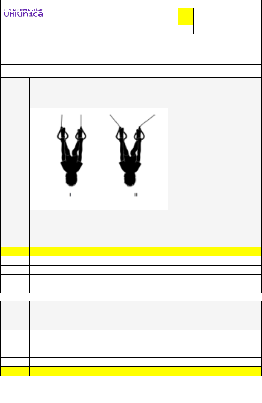 Pincel Atômico - 10/03/2025 00:08:27 1/3 MANOEL AFONSO ARAGÃO Exercício Caminho do Conhecimento - Etapa 4 (17584) Atividade finalizada em 09/03/2025 20:02:30 (3146458 / 1) LEGENDA Resposta correta na questão # Resposta correta - Questão Anulada X Resposta selecionada pelo Aluno Disciplina: PRÁTICA PEDAGÓGICA INTERDISCIPLINAR: FUNDAMENTOS DA FÍSICA [1092921] - Avaliação com 8 questões, com o peso total de 1,67 pontos [capítulos - 2] Turma: Segunda Graduação: Segunda Graduação 6 meses - Licenciatura em Física - Grupo: FPD-MARC/2024 - SGegu0A100424 [121562] Aluno(a): 91464135 - MANOEL AFONSO ARAGÃO - Respondeu 6 questões corretas, obtendo um total de 1,25 pontos como nota [359899_82682] Questão 001 Considere o ginasta Isaac Newton pendurado nas argolas, de acordo com as duas situações a seguir. Para exibir seus conhecimentos físicos o ginasta supôs que a tensão máxima suportada pelas duas cordas juntas seria exatamente a necessária para suportar o seu peso. Foram feitas as seguintes afirmativas: I. A corda romperia na situação I. II. A corda romperia na situação II. III. A maneira que a corda é utilizada não interfere. Está(ao) correta(s): X Apenas afirmativa II. Apenas afirmativas I e III. Todas as afirmativas. Apenas afirmativa I. Apenas afirmativa III. [359897_82388] Questão 002 Coloca-se dentro de um elevador uma balança e sobre ela um homem de peso 490 N. determine a indicação da balança quando o elevador está subindo uniformemente acelerado, com aceleração igual a 2 m/s2. 490 N 438 N 690 N 380 N X 588 N Pincel Atômico - 10/03/2025 00:08:27 2/3 [359898_82681] Questão 003 No piso de um elevador é colocada uma balança de banheiro, graduada em Newtons. Um corpo é colocado sobre a balança. Quando o elevador sobe com aceleração constante de 2,2 m/s2, a balança indica 720 N. Sendo a aceleração local da gravidade igual a 9,8 m/s2, determine a massa do corpo, em quilogramas. 72 kg 84 kg X 60 kg 68 kg 50 kg [359897_82386] Questão 004 Força P = 80 N, ângulo Θ = 70° para empurrar um bloco de 5 kg, no teto do quarto, coeficiente de atrito cinético é 0,40. Determine a aceleração do bloco. 5,08 m/s2 2,62 m/s2 4,12 m/s2 X 3,46 m/s2 1,12 m/s2 [359898_82680] Questão 005 Aplica-se em um bloco, m = 8 kg, em repouso sobre uma superfície horizontal cujos coeficientes de atrito cinético e estático valem respectivamente, 0,2 e 0,4, uma força inclinada conforme figura onde F = 10 N e θ = 30º. Pede-se o valor da força de atrito que atua no: 9,3 N 12 N 8,7 N X 7,1 N 6,5 N Pincel Atômico - 10/03/2025 00:08:27 3/3 [359899_82684] Questão 006 Na figura temos dois corpos A e B, ligados por um fio inextensível sobre um plano inclinado, de pesos 140 N e 130 N respectivamente. Sabe-se que o coeficiente de atrito estático µe = 0,5 , o coeficiente de atrito cinético µc = 0,3 e que o ângulo Θ = 66º. O valor da força de atrito que atua no corpo B, vale X 13,4 N 45 N 38,7 N 19,6 N 21,7 N [359897_82387] Questão 007 No sistema esboçado na figura, M = 5 kg e m = 8 kg são as massas dos blocos. Os coeficientes de atrito estático e cinético são respectivamente iguais a 0,5 e 0,2. Determine a tração na corda. X 36,96 N 16.45 N 48,92 N 12,45 N 24,84 N [359897_82380] Questão 008 ( UFVJM ) Esta figura mostra um bloco sobre a mesa. A força F1 é a sustentação da mesa no bloco, a força F2 é o peso do bloco, a força F3 é a força de pressão do bloco e a força F4 é a atração que o bloco provoca na Terra. ASSINALE a alternativa que contém o(s) par(es) de forças de ação e reação. F1 e F2 X F1 e F3; F2 e F4 F1e F2;F3 e F4 F2 e F3 N.D.A Pincel Atômico - 10/03/2025 00:08:31 1/3 MANOEL AFONSO ARAGÃO Exercício Caminho do Conhecimento - Etapa 6 (17583) Atividade finalizada em 09/03/2025 20:11:03 (3146459 / 1) LEGENDA Resposta correta na questão # Resposta correta - Questão Anulada X Resposta selecionada pelo Aluno Disciplina: PRÁTICA PEDAGÓGICA INTERDISCIPLINAR: FUNDAMENTOS DA FÍSICA [1092921] - Avaliação com 8 questões, com o peso total de 1,67 pontos [capítulos - 3] Turma: Segunda Graduação: Segunda Graduação 6 meses - Licenciatura em Física - Grupo: FPD-MARC/2024 - SGegu0A100424 [121562] Aluno(a): 91464135 - MANOEL AFONSO ARAGÃO - Respondeu 7 questões corretas, obtendo um total de 1,46 pontos como nota [359898_82689] Questão 001 Um veículo o 36 km/h, em uma rua típica de bairro, necessita percorrer, após começar a frear, uma distância mínima de 10 m até parar. Se o veículo estiver a 72 km/h, essa distância mínima, em metros será próxima de 80. 30. X 40. 50. 20. [359898_82690] Questão 002 Numa corrida de 100 m, um corredor, acelera à 8,0 m/s2 durante os primeiros 1,25s da corrida. O restante do percurso é feito com movimento uniforme. Podemos afirmar que: Ele cruza a faixa de chegada à 10 m/s. X o percurso de aceleração é de 12,5 metros. O tempo para correr os primeiros 50 m foi de 5,0 s. Ele faz o percurso com menos de 10 s. ele cruza a faixa de chegada, após 11,25 s. [359897_82409] Questão 003 O gráfico mostra a velocidade (v), em função do tempo (t), de dois automóveis, A e B. Pelo gráfico, podemos afirmar que: O espaço percorrido por B é maior do que o de A, de 0 a 10s. X Ambos partiram do repouso. O espaço percorrido por B é 200m, de 0 a 10s. O móvel B vai ultrapassar o A em t = 80s. A aceleração de B é maior do que a de A . Pincel Atômico - 10/03/2025 00:08:31 2/3 [359897_82395] Questão 004 Um trem de 100 m de comprimento, com velocidade de 30 m/s, começa a frear com aceleração constante de módulo 2 m/s2, no instante em que inicia a ultrapassagem de um túnel. Esse trem pára no momento em que seu último vagão está saindo do túnel. O comprimento do túnel é igual a quantos metros? X 125 m. 225 m. 364 m. 80 m. 328 m. [359899_82693] Questão 005 No instante em que um sinal de trânsito muda para o verde, um carro que estava parado arranca com uma aceleração constante 