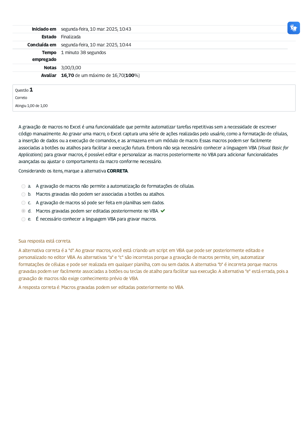 Iniciado em segunda-feira, 10 mar. 2025, 10:43 Estado Finalizada Concluída em segunda-feira, 10 mar. 2025, 10:44 Tempo empregado 1 minuto 38 segundos Notas 3,00/3,00 Avaliar 16,70 de um máximo de 16,70(100%) Questão 1 Correto Atingiu 1,00 de 1,00 A gravação de macros no Excel é uma funcionalidade que permite automatizar tarefas repetitivas sem a necessidade de escrever código manualmente. Ao gravar uma macro, o Excel captura uma série de ações realizadas pelo usuário, como a formatação de células, a inserção de dados ou a execução de comandos, e as armazena em um módulo de macro. Essas macros podem ser facilmente associadas a botões ou atalhos para facilitar a execução futura. Embora não seja necessário conhecer a linguagem VBA (Visual Basic for Applications) para gravar macros, é possível editar e personalizar as macros posteriormente no VBA para adicionar funcionalidades avançadas ou ajustar o comportamento da macro conforme necessário. Considerando os itens, marque a alternativa CORRETA. a. A gravação de macros não permite a automatização de formatações de células. b. Macros gravadas não podem ser associadas a botões ou atalhos. c. A gravação de macros só pode ser feita em planilhas sem dados. d. Macros gravadas podem ser editadas posteriormente no VBA. e. É necessário conhecer a linguagem VBA para gravar macros. Sua resposta está correta. A alternativa correta é a "d". Ao gravar macros, você está criando um script em VBA que pode ser posteriormente editado e personalizado no editor VBA. As alternativas "a" e "c" são incorretas porque a gravação de macros permite, sim, automatizar formatações de células e pode ser realizada em qualquer planilha, com ou sem dados. A alternativa "b" é incorreta porque macros gravadas podem ser facilmente associadas a botões ou teclas de atalho para facilitar sua execução. A alternativa "e" está errada, pois a gravação de macros não exige conhecimento prévio de VBA. A resposta correta é: Macros gravadas podem ser editadas posteriormente no VBA. Questão 2 Correto Atingiu 1,00 de 1,00 Questão 3 Correto Atingiu 1,00 de 1,00 A execução de macros no Excel é uma maneira eficiente de automatizar tarefas e processos repetitivos. Uma vez que uma macro é gravada, ela pode ser executada várias vezes conforme necessário, simplificando o trabalho com grandes volumes de dados ou tarefas complexas. As macros podem ser acionadas de diversas formas, como através de botões de comando adicionados à planilha, que permitem uma execução rápida e intuitiva. Também é possível executá-las por meio de atalhos de teclado configurados pelo usuário. De acordo com o enunciado e em outros conhecimentos sobre o assunto, marque a alternativa CORRETA. a. Macros só podem ser executadas uma vez após serem gravadas. b. Para executar uma macro, é necessário abrir o editor VBA e rodar o código manualmente. c. A execução de macros requer a instalação de um software adicional no Excel. d. Macros podem ser executadas por meio de botões de comando adicionados na planilha. e. Macros não podem ser executadas se a planilha estiver protegida. Sua resposta está correta. A alternativa correta é a "d". Macros podem ser executadas facilmente através de botões de comando adicionados diretamente na planilha, facilitando o acesso e a execução para os usuários. As alternativas "a" e "b" são incorretas porque macros podem ser executadas quantas vezes forem necessárias e podem ser rodadas diretamente pelo Excel sem a necessidade de abrir o editor VBA. A alternativa "c" é errada, pois o Excel já inclui todas as ferramentas necessárias para gravação e execução de macros. A alternativa "e" está incorreta porque macros podem ser configuradas para serem executadas mesmo em planilhas protegidas, dependendo das configurações de proteção. A resposta correta é: Macros podem ser executadas por meio de botões de comando adicionados na planilha. A edição de código VBA (Visual Basic for Applications) no Excel é uma etapa crucial para personalizar e otimizar macros e automações. O Editor de VBA, integrado ao Excel, é a ferramenta principal para essa tarefa. Ele permite aos usuários modificar, depurar e testar códigos VBA, proporcionando um ambiente robusto para criar e ajustar automações complexas. De acordo com o enunciado e em outros conhecimentos sobre o assunto, marque a alternativa CORRETA. a. O editor VBA não permite a edição de macros gravadas. b. A edição de código VBA é realizada no editor integrado do Excel, chamado Editor de VBA. c. É impossível depurar código VBA no editor do Excel. d. O editor VBA não possui ferramentas de autocompletar para facilitar a escrita de código. e. O código VBA não pode interagir com outras aplicações do Microsoft Office. Sua resposta está correta. A alternativa correta é a "b". A edição de código VBA é realizada no Editor de VBA, que é integrado ao Excel e permite a criação, edição e depuração de macros e scripts VBA. As alternativas "a" e "c" são incorretas porque o editor VBA permite a edição de macros gravadas e a depuração do código. A alternativa "d" é errada, pois o editor VBA possui ferramentas de autocompletar que ajudam na escrita do código. A alternativa "e" está incorreta porque o VBA pode interagir com outras aplicações do Microsoft Office, permitindo automações avançadas e integração entre diferentes aplicativos do Office. A resposta correta é: A edição de código VBA é realizada no editor integrado do Excel, chamado Editor de VBA.