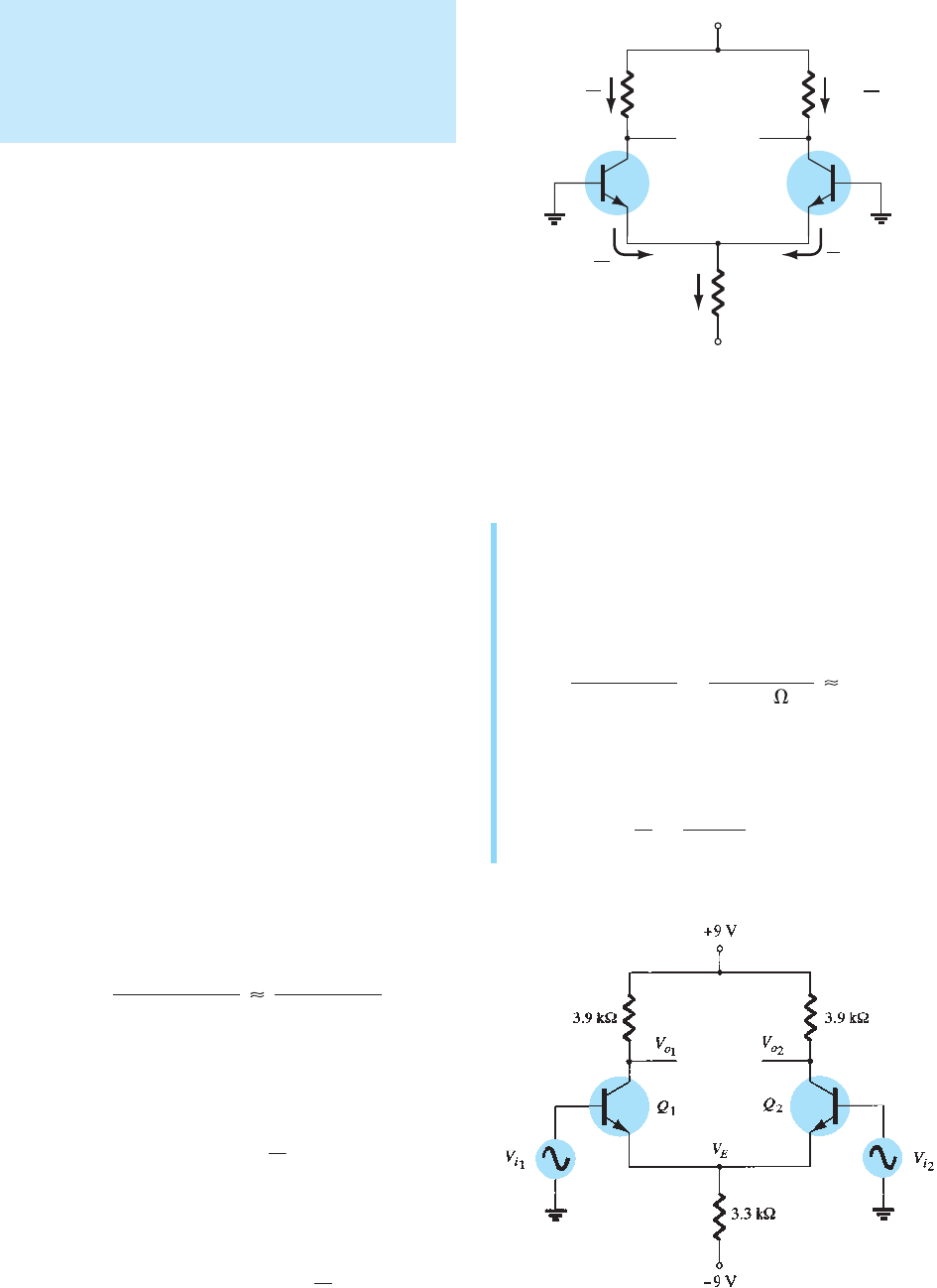 Se dois sinais de entrada de polaridades opostas são aplicados, a operação é chamada de “entrada dupla”. Se o mesmo sinal de entrada é aplicado a ambas as entradas, a operação é chamada de “modo-comum”. Em uma operação com entrada simples, aplica-se um único sinal de entrada. No entanto, devido à cone- xão emissor-comum, o sinal de entrada aciona ambos os transistores, resultando na saída em ambos os coletores. Em uma operação com entrada dupla, aplicam-se dois sinais de entrada, sendo que a diferença das entradas resulta em saídas em ambos os coletores por causa da diferença dos sinais aplicados a ambas as entradas. Em uma operação modo-comum, o sinal de entrada comum resulta em sinais opostos em cada coletor, e esses sinais se cancelam, de maneira que o sinal de saída resul- tante é igual a zero. Na prática, os sinais opostos não se cancelam por completo, e o resultado é um pequeno sinal. A principal característica do amplificador diferencial é o ganho muito grande quando sinais opostos são apli- cados às entradas, em comparação com o ganho muito pequeno resultante de entradas comuns. A razão entre o ganho diferencial e o ganho de modo-comum é chamada de rejeição de modo-comum. Polarização CC Analisaremos primeiro a operação de polarização CC do circuito da Figura 10.9. Com entradas CA obtidas das fontes de tensão, a tensão CC em cada entrada está essencialmente conectada a 0 V, como mostra a Figura 10.10. Com cada tensão de base em 0 V, a tensão de po- larização CC do emissor-comum é: VE = 0 V – VBE = – 0,7 V A corrente de polarização CC de emissor é, então, IE = VE - ( - VEE) RE VEE - 0,7 V RE (10.1) Supondo que os transistores estejam bem casados (como ocorreria em um circuito integrado), obtemos IC1 = IC2 = IE 2 (10.2) o que resulta em uma tensão de coletor de: VC1 = VC2 = VCC - ICRC = VCC - IE 2 RC (10.3) EXEMPLO 10.1 Calcule as tensões e correntes CC no circuito da Figura 10.11. Solução: Equação 10.1: IE = VEE - 0,7 V RE = 9 V - 0,7 V 3,3 k 2,5 mA A corrente de coletor é então Equação 10.2: IC = IE 2 = 2,5 mA 2 = 1,25 mA VB = 0 V +VCC IE 2 ≅IC IE 2 RE −VEE IE IE 2 IE 2 ≈IC RC VC1 Q1 Q2 VE VC2 RC VB = 0 V Figura 10.10 Polarização CC do circuito amplificador diferencial. , , , Figura 10.11 Circuito amplificador diferencial para o Exemplo 10.1. 508 Dispositivos eletrônicos e teoria de circuitos resultando em uma tensão de coletor de Equação 10.3: VC = VCC – ICRC = 9 V – (1,25 mA)(3,9 kΩ) ≈ 4,1 V A tensão de emissor-comum é, portanto, – 0,7 V, en- quanto a tensão de polarização do coletor está próxima de 4,1 V para ambas as saídas. Operação CA do circuito Uma conexão CA de um amplificador diferencial é mostrada na Figura 10.12. Sinais de entrada separados são aplicados como Vi1 e Vi2, com saídas separadas resul- tantes Vo1 e Vo2. Para realizar a análise CA, redesenhamos o circuito na Figura 10.13. Cada transistor é substituído por seu equivalente CA. Ganho de tensão CA com saída simples Para calcular o ganho de tensão CA com saída simples, Vo/Vi, apli- que sinal a uma entrada com a outra ligada ao terra, como mostra a Figura 10.14. O equivalente CA dessa conexão está desenhado na Figura 10.15. A corrente de base CA pode ser calculada utilizando-se a Lei das Tensões de Kirchhoff (LTK) para malha de entrada na base 1. Supondo-se que os dois transistores estão bem casados, então Ib1 = Ib2 = Ib ri1 = ri2 = ri = βre Com RE muito grande (idealmente infinita), o cir- cuito para obtenção da equação pela LTK é simplificado para o da Figura 10.16, a partir do qual podemos escrever Vi1 – Ibri – Ibri = 0 Figura 10.13 Equivalente CA do circuito amplificador diferencial. −VEE Q2 VE Vi2Vi1 Vo1 Vo2 +VCC RE RCRC Q1 Figura 10.12 Conexão CA do amplificador diferencial. RE +VCC –VEE Vi1 Q1 Q2 Vo1 RC RC = 0Vi2 Figura 10.14 Conexão para calcular AV1 = Vo1/Vi1. Capítulo 10 Amplificadores operacionais 509 de maneira que Ib = Vi1 2ri = Vi 2bre Se também assumirmos que β1 = β2 = β então, IC = bIb = b Vi 2bre = Vi 2re e a magnitude da tensão de saída em cada coletor é Vo = ICRC = Vi 2re RC = RC 2re Vi e o valor do ganho de tensão com entrada simples em cada coletor é Av = Vo Vi = RC 2re (10.4) EXEMPLO 10.2 Calcule a tensão de saída simples Vo1 para o circuito da Figura 10.17. Solução: Os cálculos de polarização CC fornecem: IE = VEE - 0,7 V RE = 9 V - 0,7 V 43 k = 193 m A Logo, a corrente CC de coletor é IC = IE 2 = 96,5 mA de maneira que VC = VCC – ICRC = 9 V – (96,5 µA)(47 kΩ) = 4,5 V O valor de re é, então, re = 26 0,0965 269 Vi1 Ib1 Vo1 Vo2 Ib2 = 0Vi2ri2 RE ri1 RC RC IC1 IC2 β 1 Ib1 β 2 Ib2 Figura 10.15 Equivalente CA de circuito da Figura 10.14. Q1 Q2 RC Vo + 9 V – 9 V 47 kΩ 47 kΩ 43 kΩ 20 kΩ Vi1 = 2 mV = ri2 =ri1 75= β2 =β1 Figura 10.17 Circuito para os exemplos 10.2 e 10.3. Vi1 RE ≅ ∞ = IbIb1 = riri1 = Vi = IbIb2 = riri2 + – Figura 10.16 Circuito parcial para o cálculo de Ib. 510 Dispositivos eletrônicos e teoria de circuitos O valor do ganho de tensão CA pode ser calculado pela Equação 10.31: Av = RC 2re = (47 k ) 2(269 ) = 4,78 o que proporciona uma tensão CA de saída de magnitude Vo = AvVi = (87,4)(2 mV) = 174,8 mV = 0,175 V Ganho de tensão CA com saída dupla Uma análise semelhante pode ser usada para mostrar que, para a condição de sinais aplicados a ambas as entradas, o valor do ganho de tensão diferencial é Ad = Vo Vd = RC re (10.5) onde Vd = Vi1 – Vi2. Circuito de operação em modo-comum Embora um amplificador diferencial forneça grande amplificação sobre a diferença dos sinais aplicada a ambas as entradas, ele também deve proporcionar uma amplifi- cação pequena do sinal comum a ambas as entradas. Uma conexão CA mostrando uma entrada comum a ambos os transistores é apresentada na Figura 10.18. O circuito equivalente CA está desenhado na Figura 10.19, e a partir dele podemos escrever Ib = Vi 