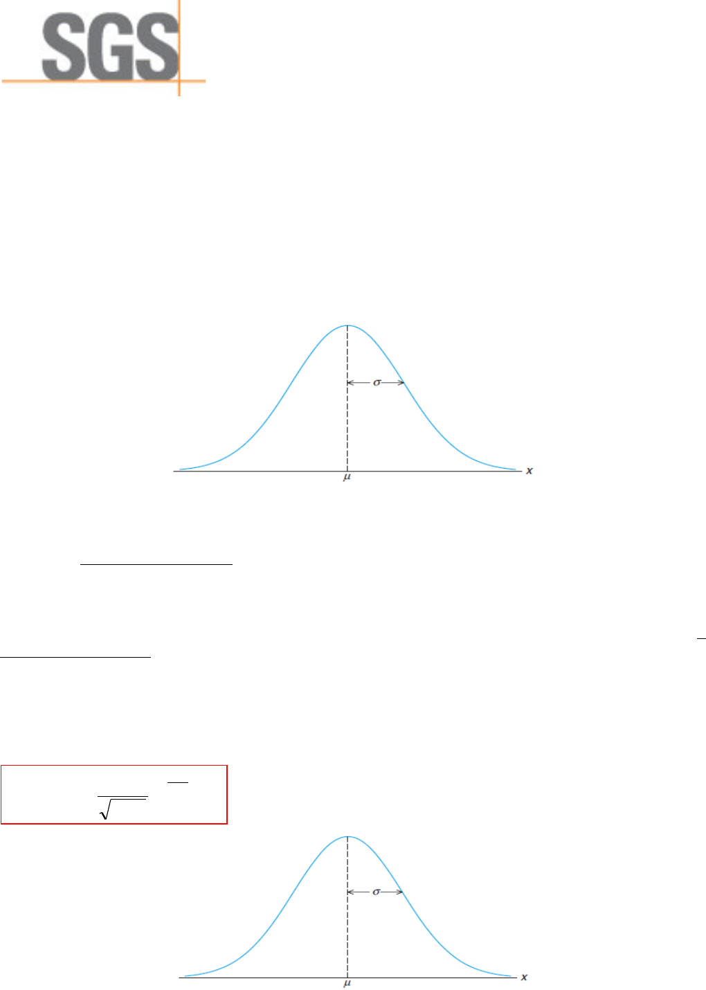 TREINAMENTO IF-AT Módulo 6 - 2 Distribuição Normal (Gaussiana) _________________________________________________________ Distribuição Normal A mais importante distribuição de probabilidade contínua em todo o domínio da estatística é a distribuição normal. Seu gráfico, chamado de curva normal, é a curva em forma de sino (Fig. 1) que aproximadamente descreve muitos fenômenos que ocorrem na natureza, indústria e pesquisa. Figura 1 – Curva normal Em 1733, Abraham De Moivre desenvolveu a equação matemática da curva normal. Ele forneceu uma base a partir da qual grande parte da teoria de estatísticas indutivas é fundamentada. A distribuição normal é muitas vezes referida como a distribuição de Gauss, em homenagem a Karl Friedrich Gauss que também derivou sua equação. A equação matemática para a distribuição de probabilidade da variável normal depende de dois parâmetros, µ e σ, a sua média e desvio padrão, respectivamente. A densidade da variável aleatória X normal com média µ e variância σ2, é Figura 1 – Curva normal 2 2 )( 2 1 2 1),;( µ σ πσ σµ −− = x exn ∞< 1,2) = P(Z < 1,2) − P(Z < −0,5) P(45 < X < 62) = P(−0,5 < Z < 1,2) = P(Z < 1,2) − P(Z < −0,5) = 0,8849 − (1 − P(Z < 0,5)) = 0,8849 − (1 − 0,6915) = 0,8849 − 0,3085 = 0,5764 TREINAMENTO IF-AT Módulo 6 - 2 Distribuição Normal (Gaussiana) _________________________________________________________ Exemplo 4: Dado que X tem um distribuição normal com µ = 300 e σ = 50, encontre a probabilidade que X assume valores maior que 362. 24,1 50 300362 =−=Z Figura 10 : Área do exemplo 4 Usando a curva normal na reversa Da transformação σ µ−= XZ obtém-se: µσ +⋅= Zx Exemplo: Dada uma distribuição normal com µ = 40 e σ = 6, encontre o valor de x que tem a) 45% de sua área para a esquerda P(Z < -0,13)=0,45 µσ +⋅= Zx 40)13,0(6 +−⋅=x 22,394078,0 =+−=x
